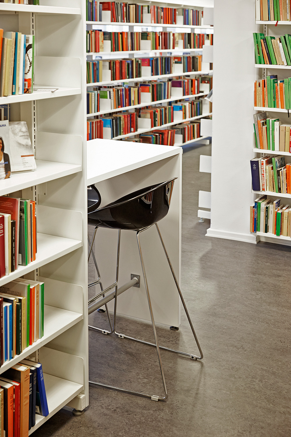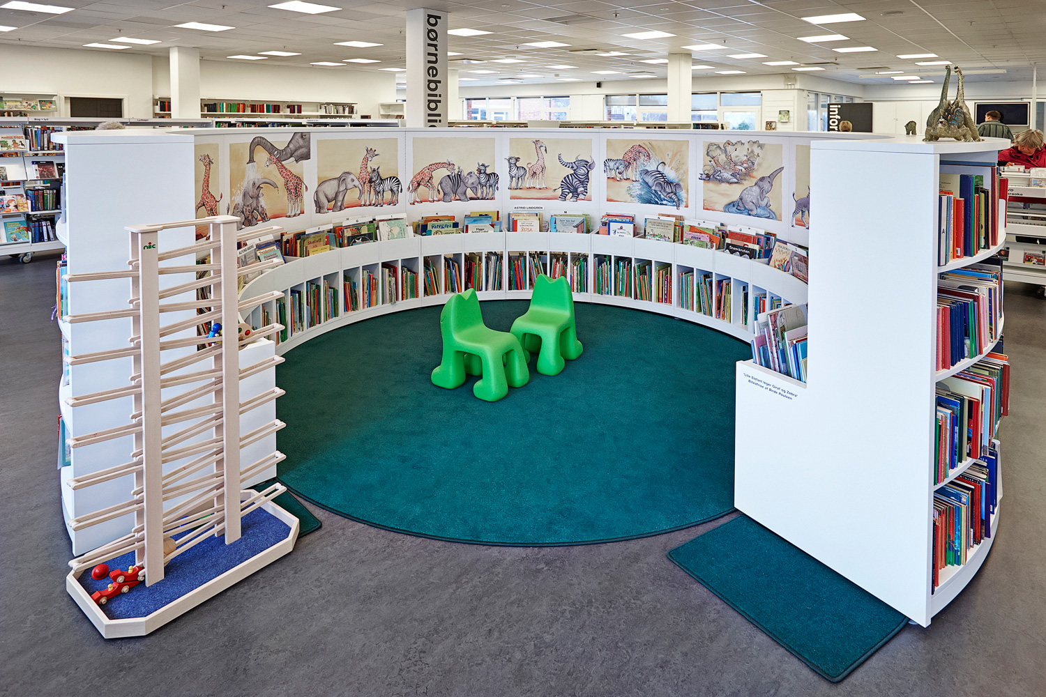 Durch kreative und kluge Platzeinteilung konnte eine geräumige und einladende Bibliothek mit besonderen Bereichen für Ruhe und Lesen sowie Gespräche und Diskussionen geschaffen werden. Und dazu gibt es noch die Kinderecke mit ihren runden Regalen und Illustrationen lokaler Künstler.