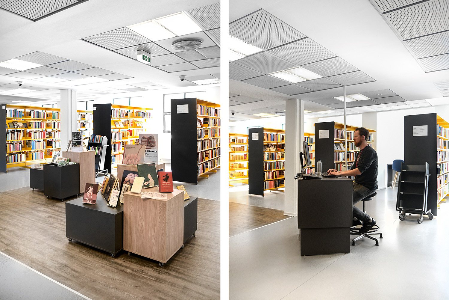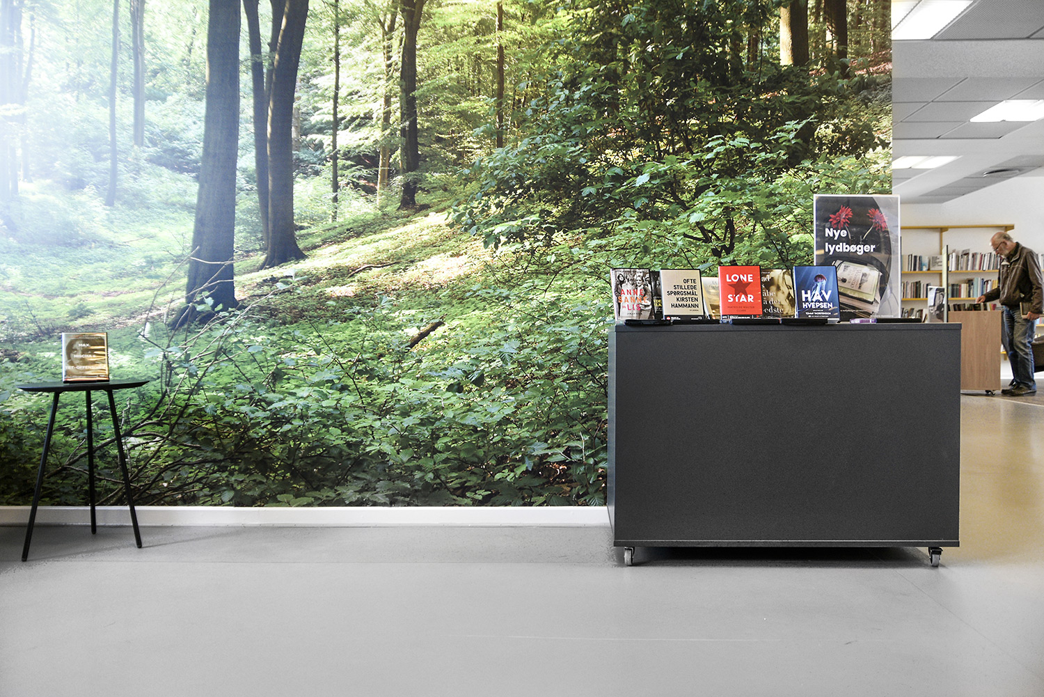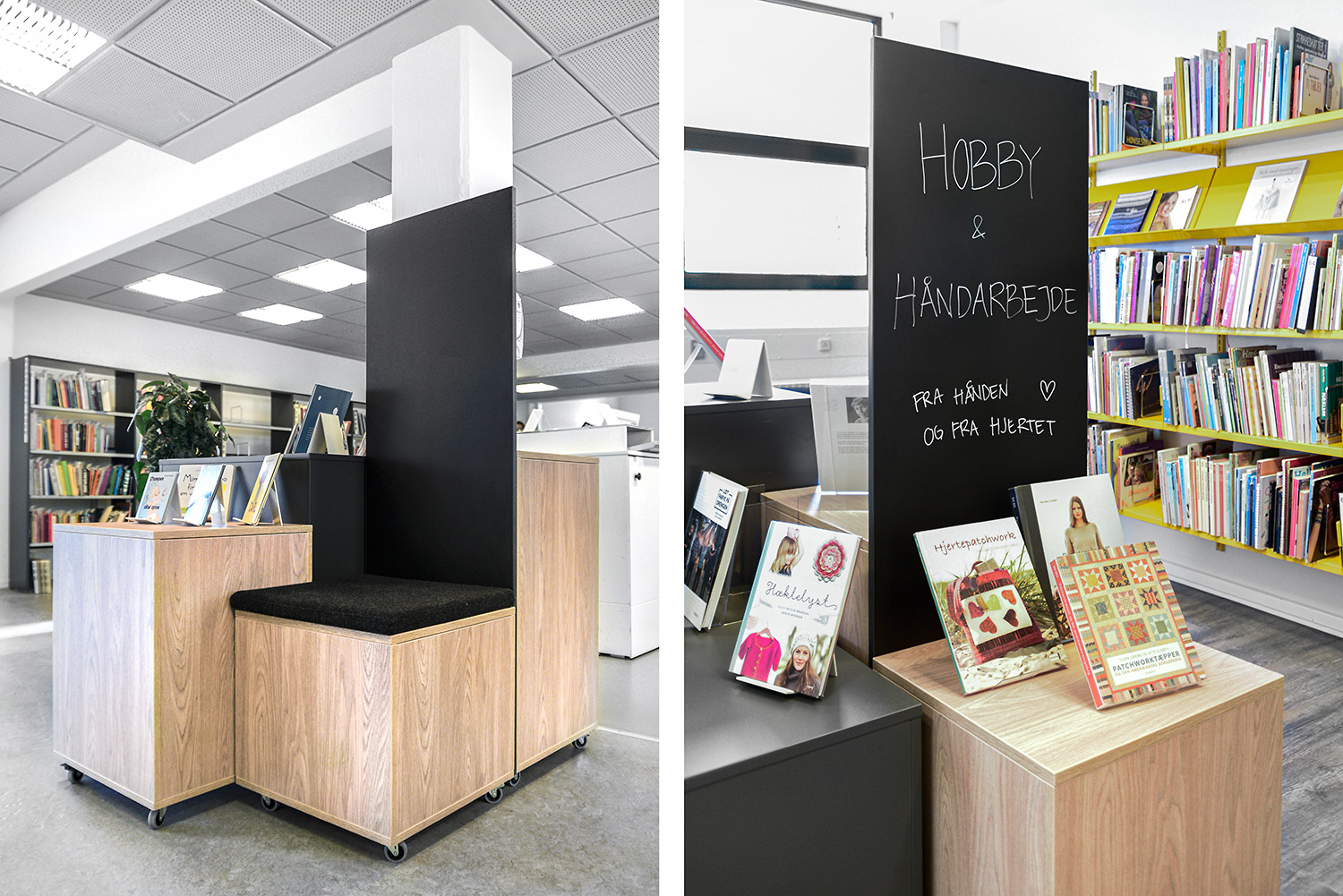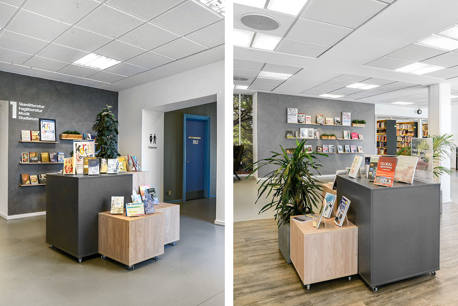 Im der neu gestalteten Horsens Library wurden die älteren, gelben Regale wiederverwendet. Durch die Einhausung der Regale mit anthrazitgrauen Holzpanelen ergibt sich ein moderneres Aussehen. Gleichzeitig wurden Ausstellungspodien in Grau und Eiche hinzugefügt, Bereiche mit Holzböden angelegt und Wände mit Waldbildern foliert. In der Kinderstation wurden die Wände mit Hütten und Bäume ergänzt.