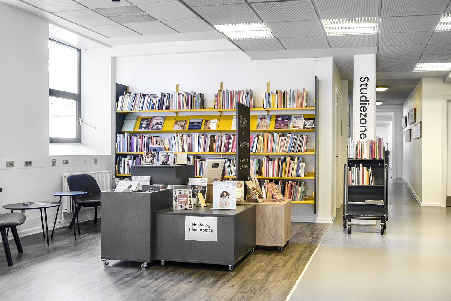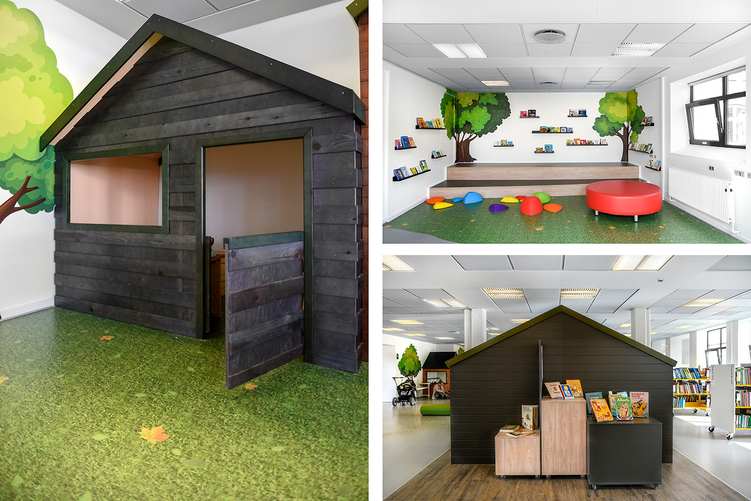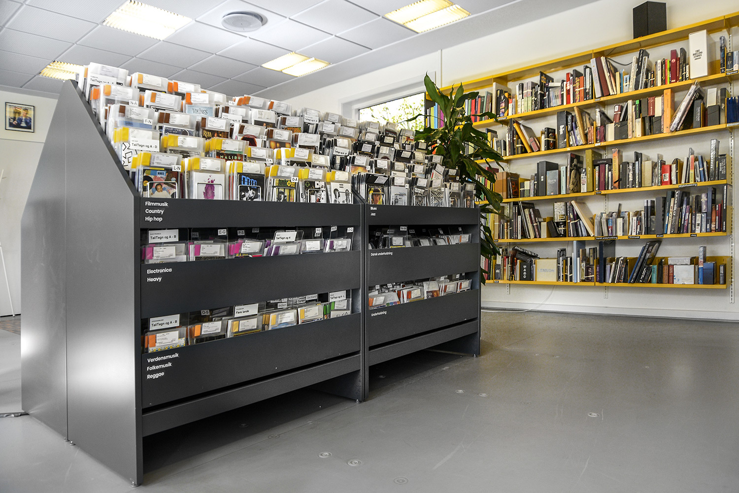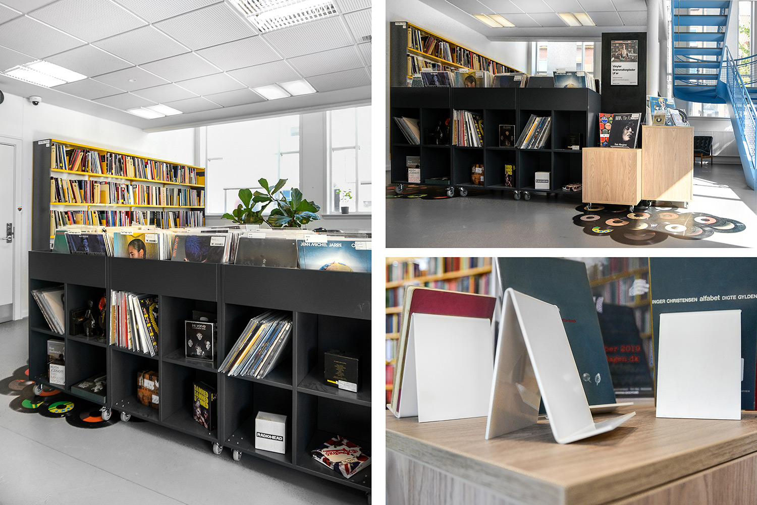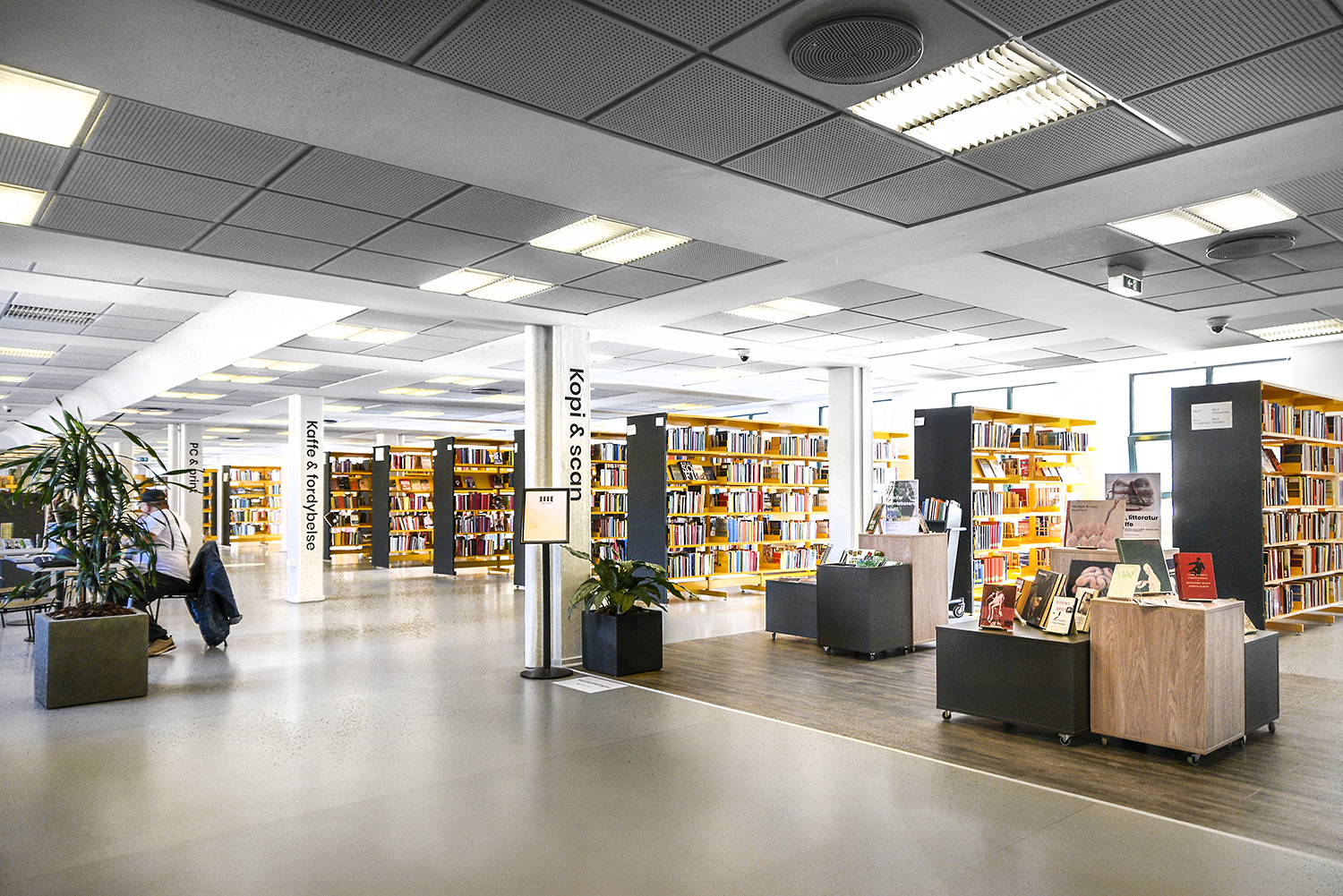 Im der neu gestalteten Horsens Library wurden die älteren, gelben Regale wiederverwendet. Durch die Einhausung der Regale mit anthrazitgrauen Holzpanelen ergibt sich ein moderneres Aussehen. Gleichzeitig wurden Ausstellungspodien in Grau und Eiche hinzugefügt, Bereiche mit Holzböden angelegt und Wände mit Waldbildern foliert. In der Kinderstation wurden die Wände mit Hütten und Bäume ergänzt.