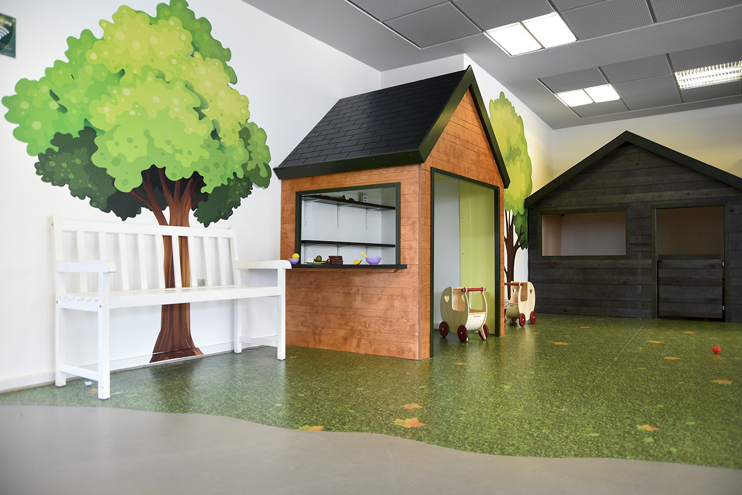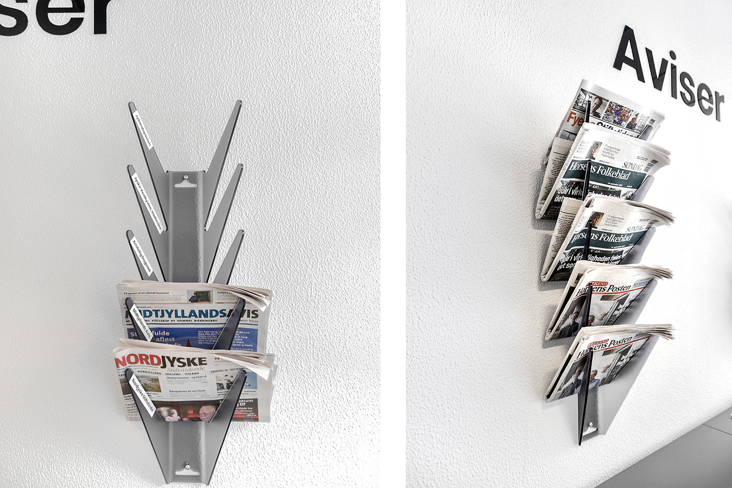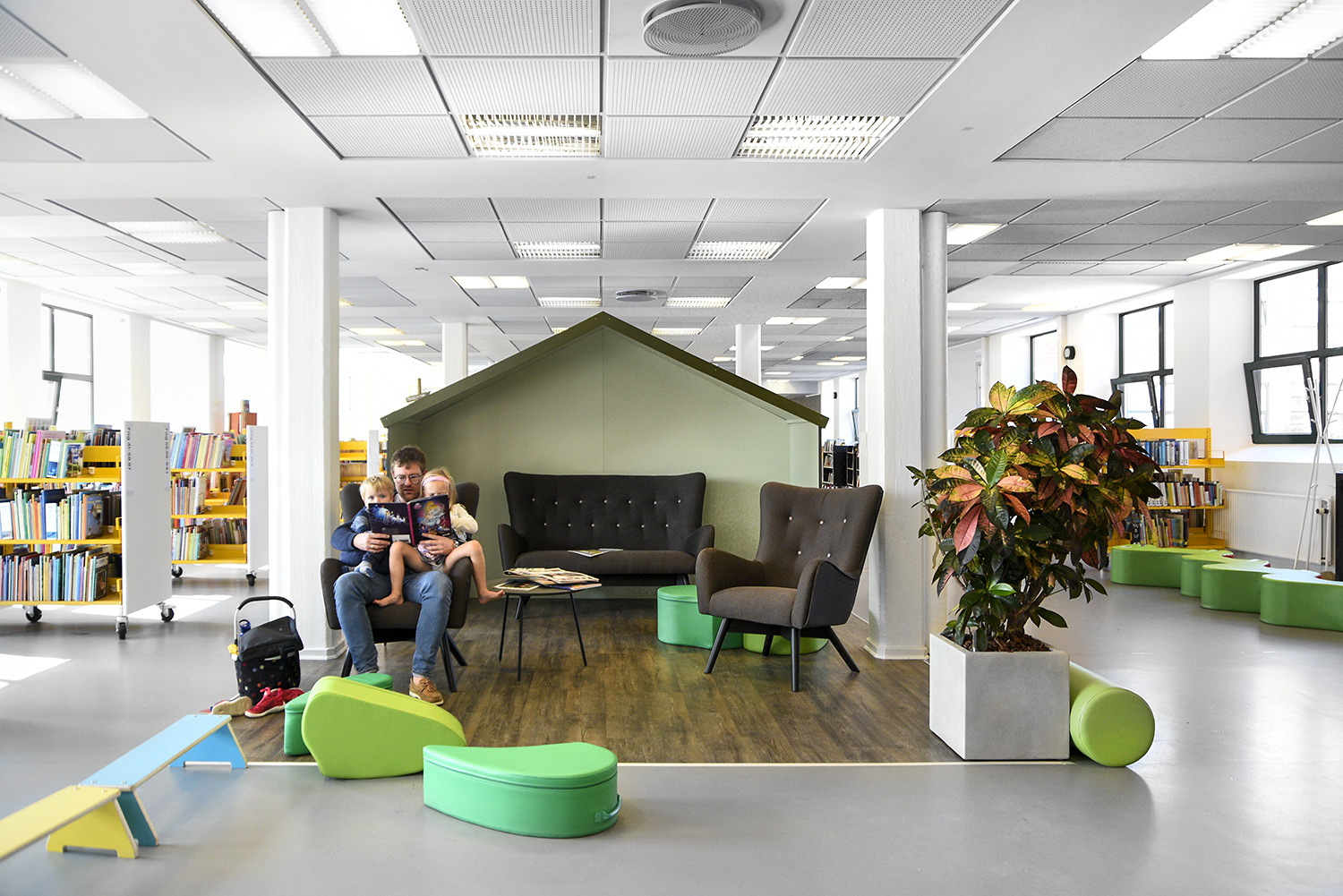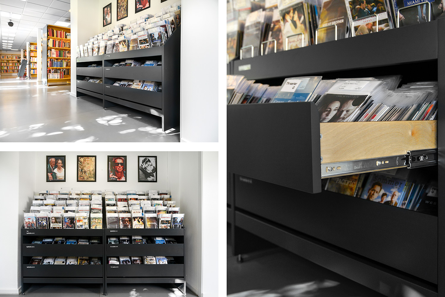 Im der neu gestalteten Horsens Library wurden die älteren, gelben Regale wiederverwendet. Durch die Einhausung der Regale mit anthrazitgrauen Holzpanelen ergibt sich ein moderneres Aussehen. Gleichzeitig wurden Ausstellungspodien in Grau und Eiche hinzugefügt, Bereiche mit Holzböden angelegt und Wände mit Waldbildern foliert. In der Kinderstation wurden die Wände mit Hütten und Bäume ergänzt.