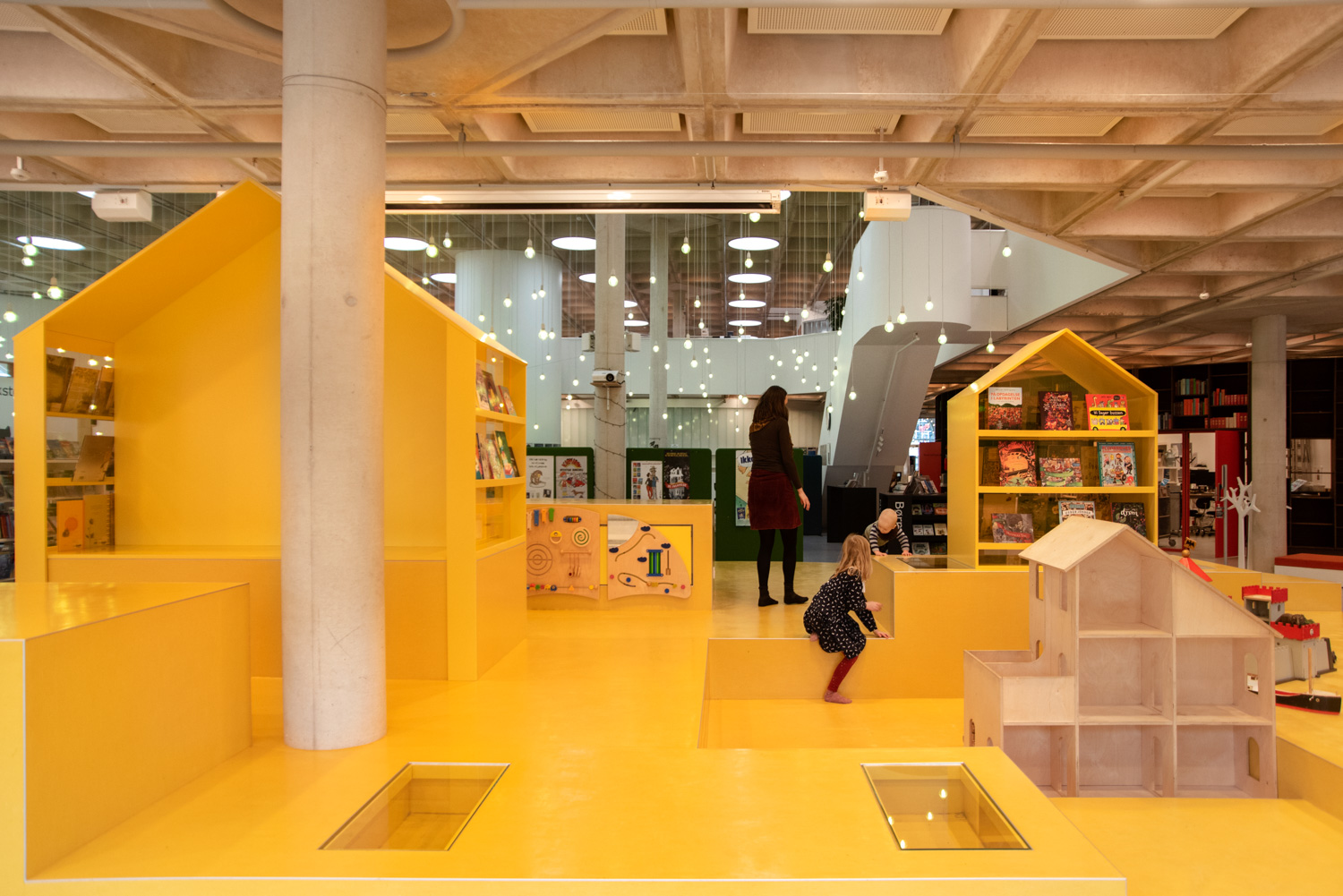 Auf dem großen gelben "Käse" wurden zwei große Häuser mit Lesehöhlen und Ausstellungsfläche hinzugefügt.
