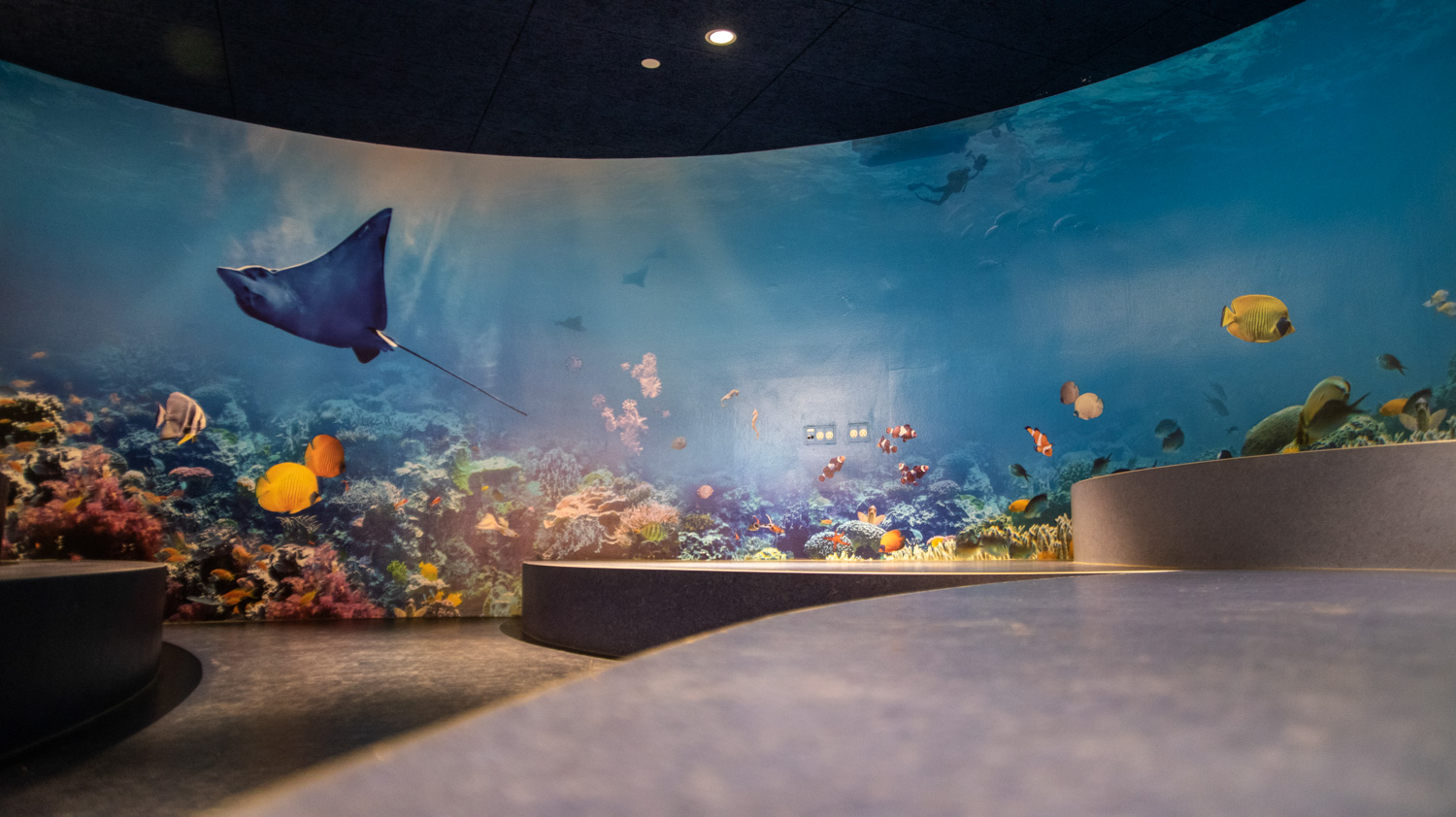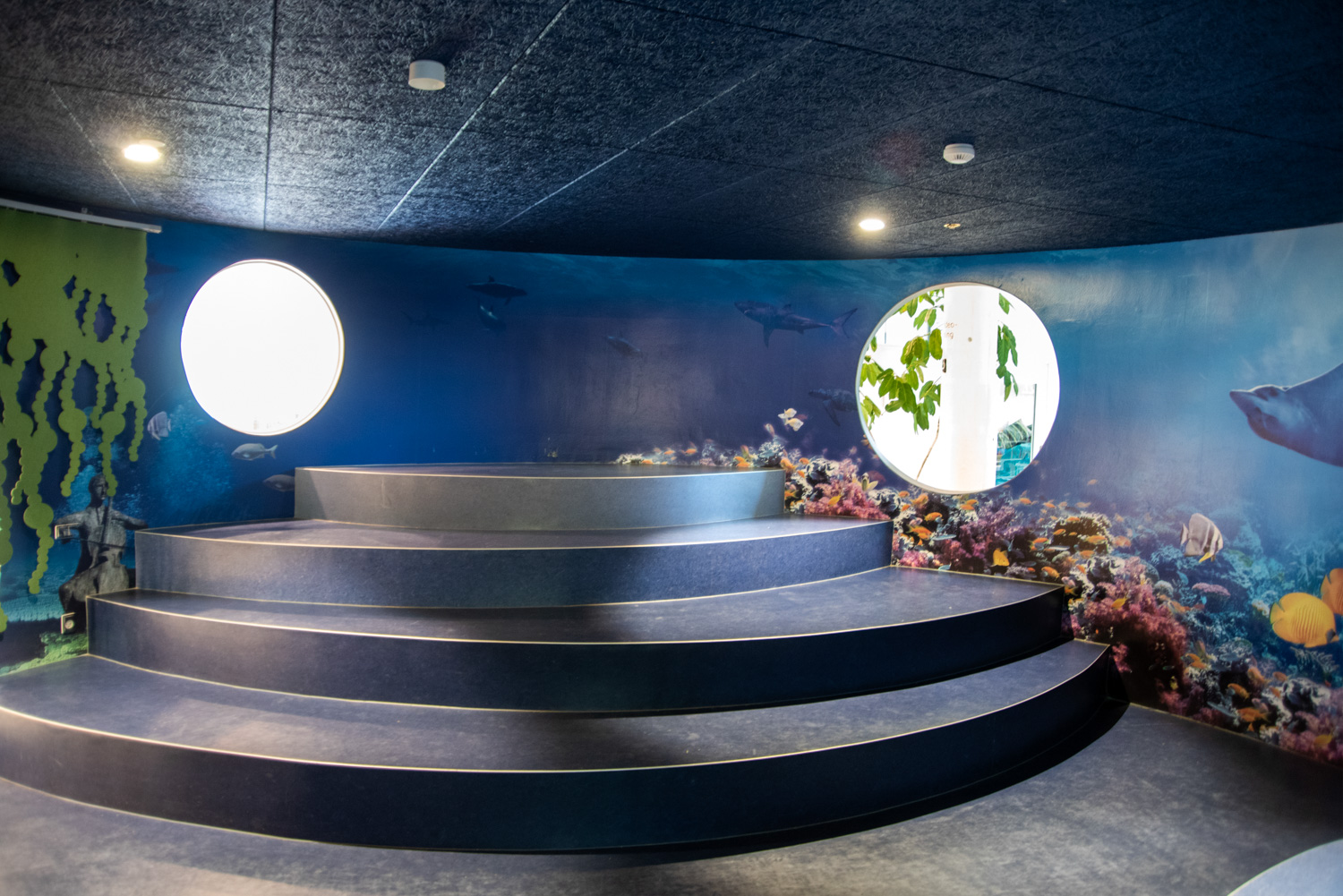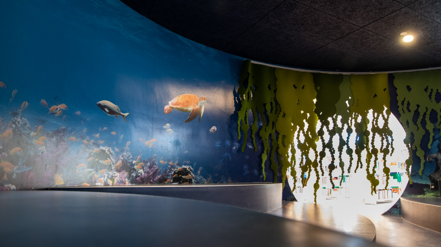 Die runde Märchenhöhle in der Mitte der Bibliothek wurde in den tiefblauen Ozean verwandelt, indem eine große Wandfolie mit einem speziell entworfenen Motiv und einem Algenvorhang hinzugefügt wurde, die den Eindruck erweckt, unter dem Meer zu sein. Gleichzeitig können Kinder nach Seepferdchen suchen oder um die junge Anemone kämpfen.