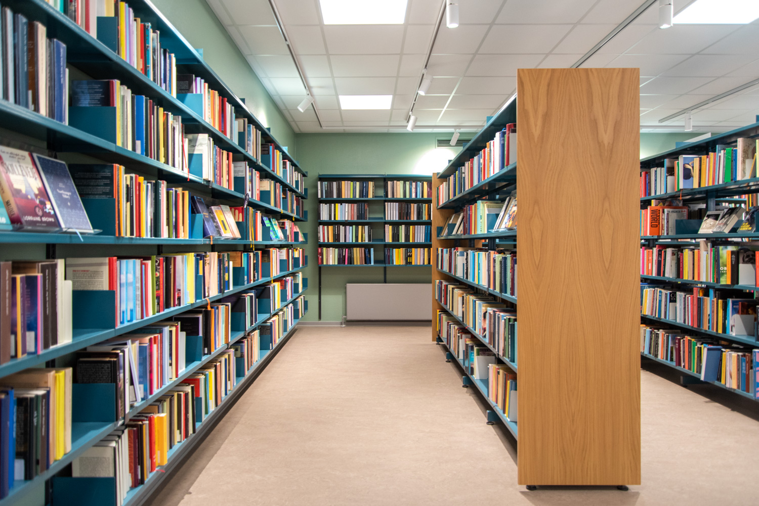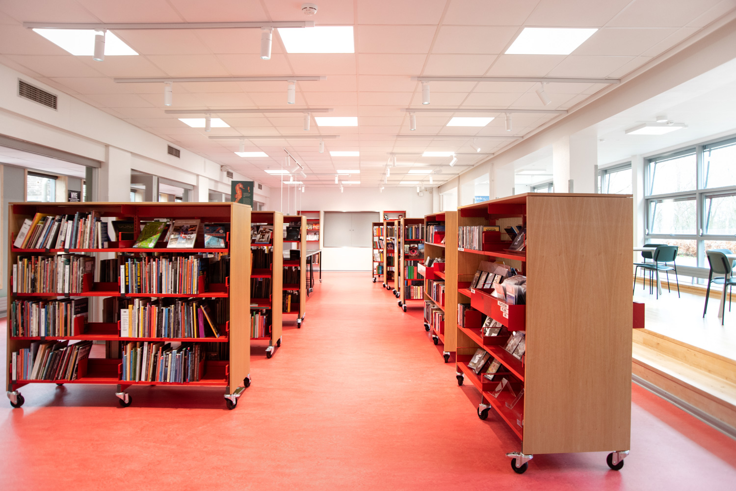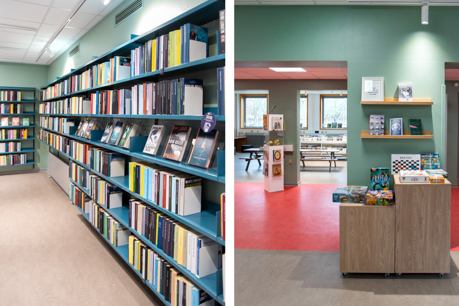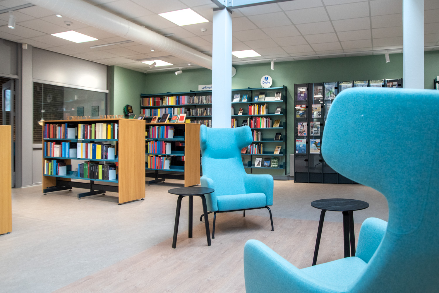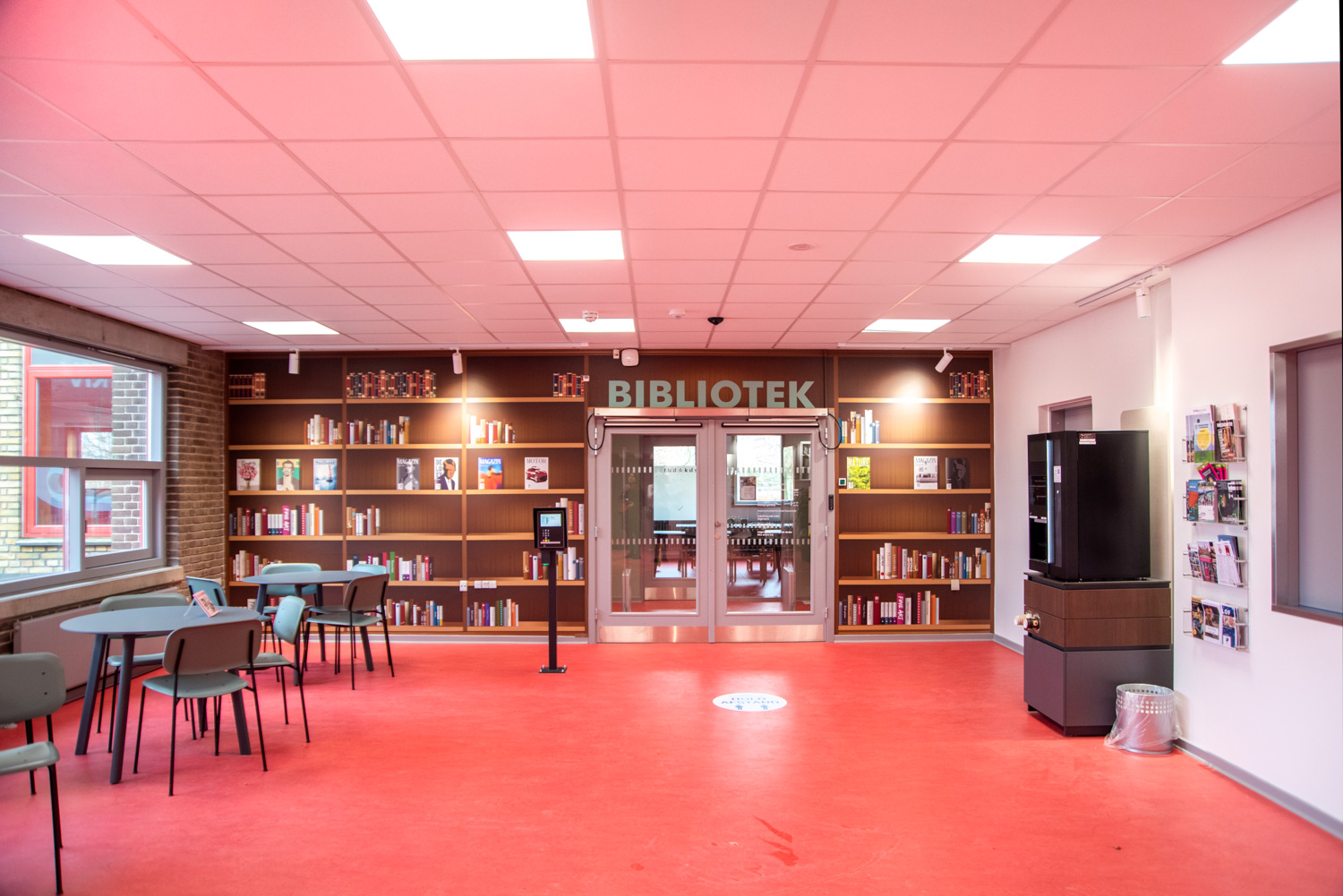 Die Bibliothek basiert auf den Werten Recycling und Nachhaltigkeit, weshalb das Gebäude renoviert und die alten Regalsysteme recycelt wurden. Ein Architekt war für die Renovierung verantwortlich, während Lammhults Biblioteksdesign für die Auswahl der Wandfarben und des gesamten Innenraums verantwortlich war. Durch die Modernisierung der Regalsysteme mit neuen Paneelen und die strategische Platzierung der blauen und Leseregale auf den neuen roten Böden wirkt die
