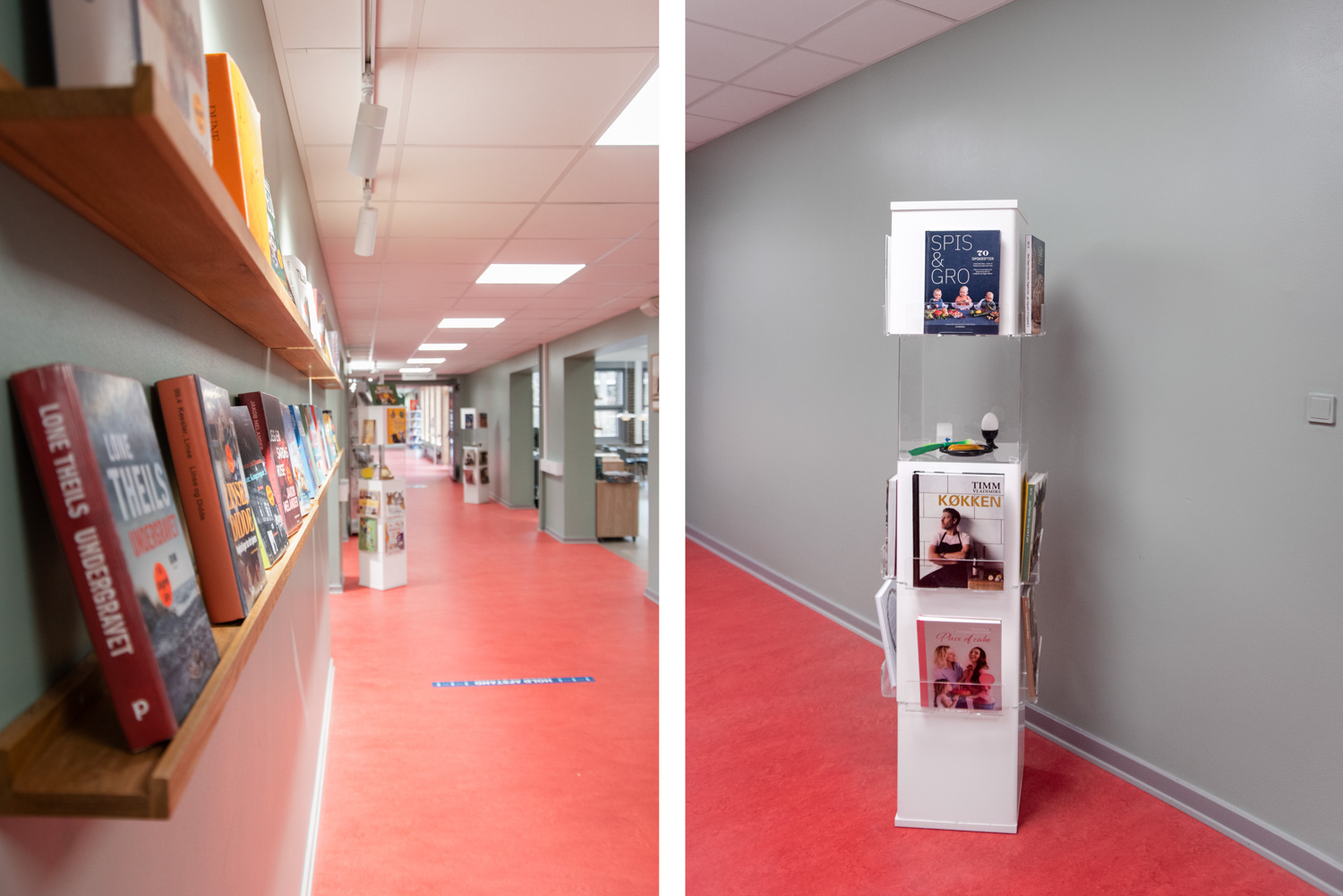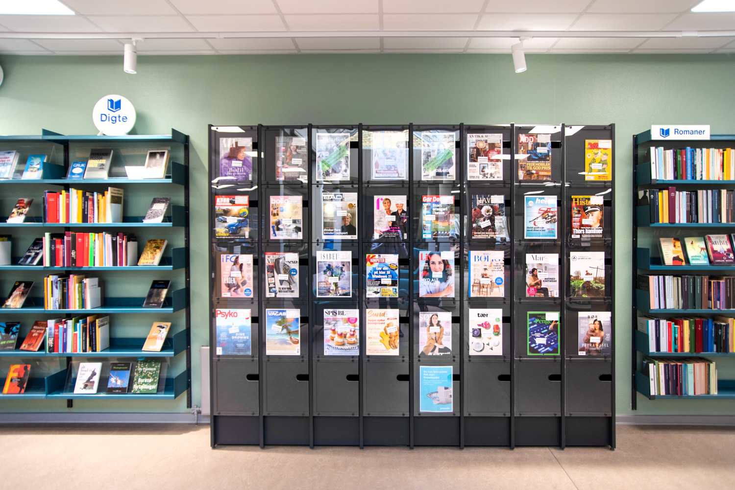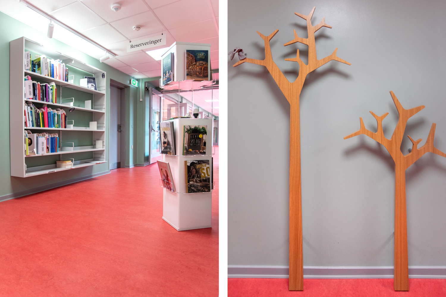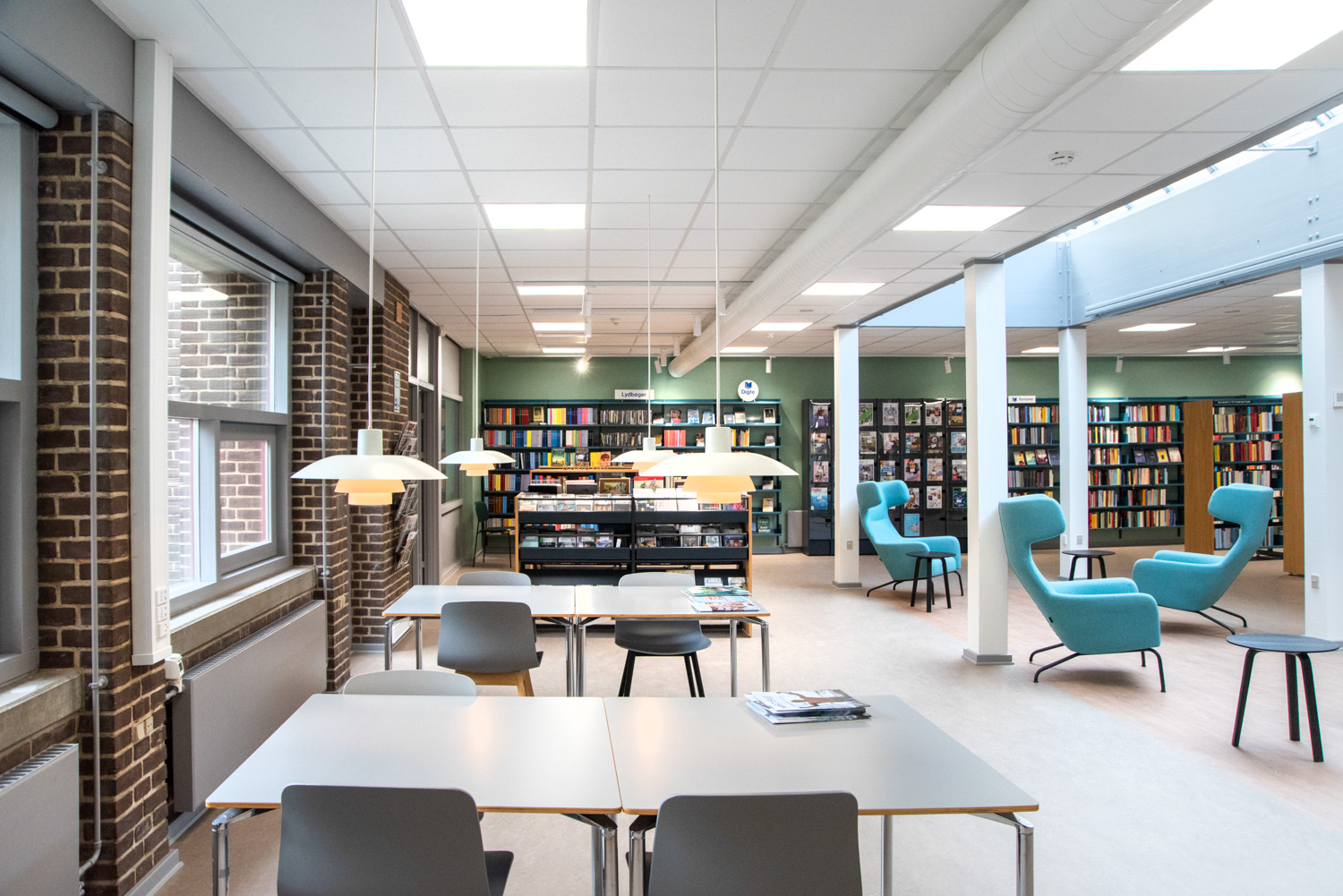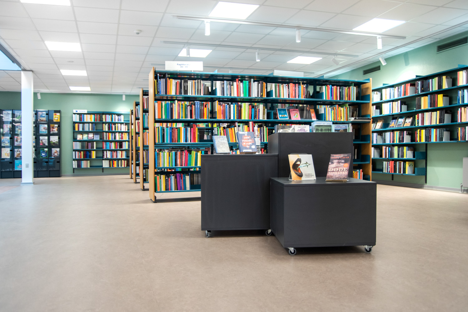 Die Bibliothek basiert auf den Werten Recycling und Nachhaltigkeit, weshalb das Gebäude renoviert und die alten Regalsysteme recycelt wurden. Ein Architekt war für die Renovierung verantwortlich, während Lammhults Biblioteksdesign für die Auswahl der Wandfarben und des gesamten Innenraums verantwortlich war. Durch die Modernisierung der Regalsysteme mit neuen Paneelen und die strategische Platzierung der blauen und Leseregale auf den neuen roten Böden wirkt die
