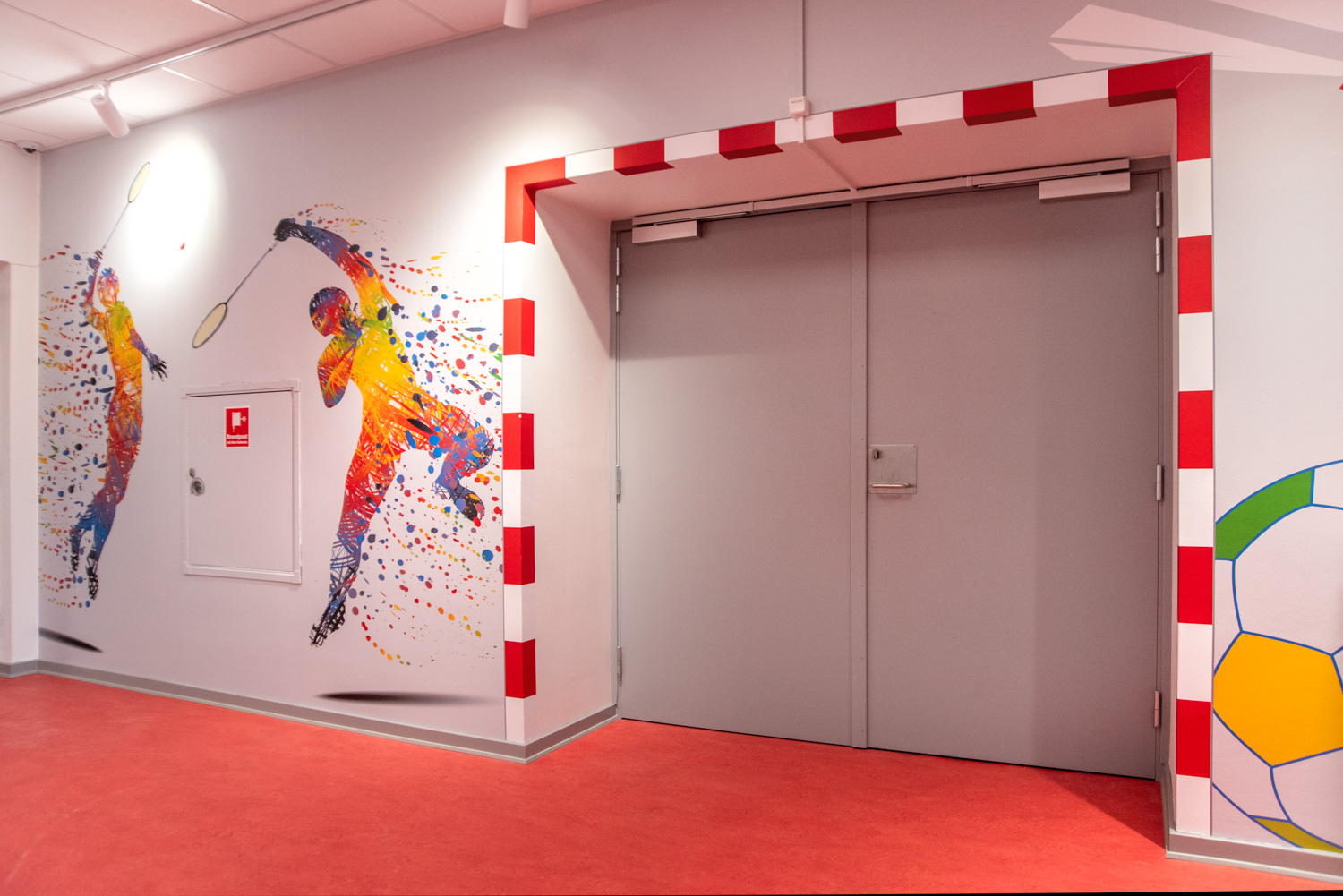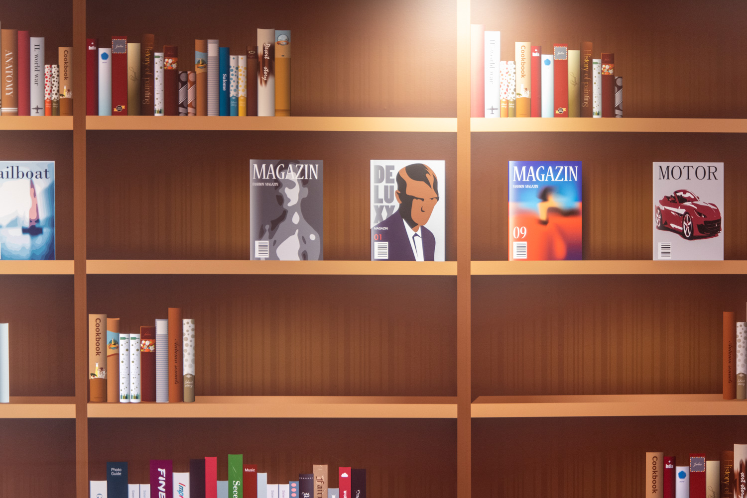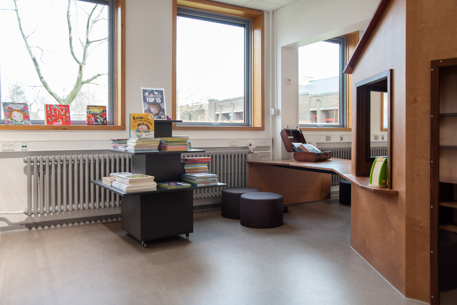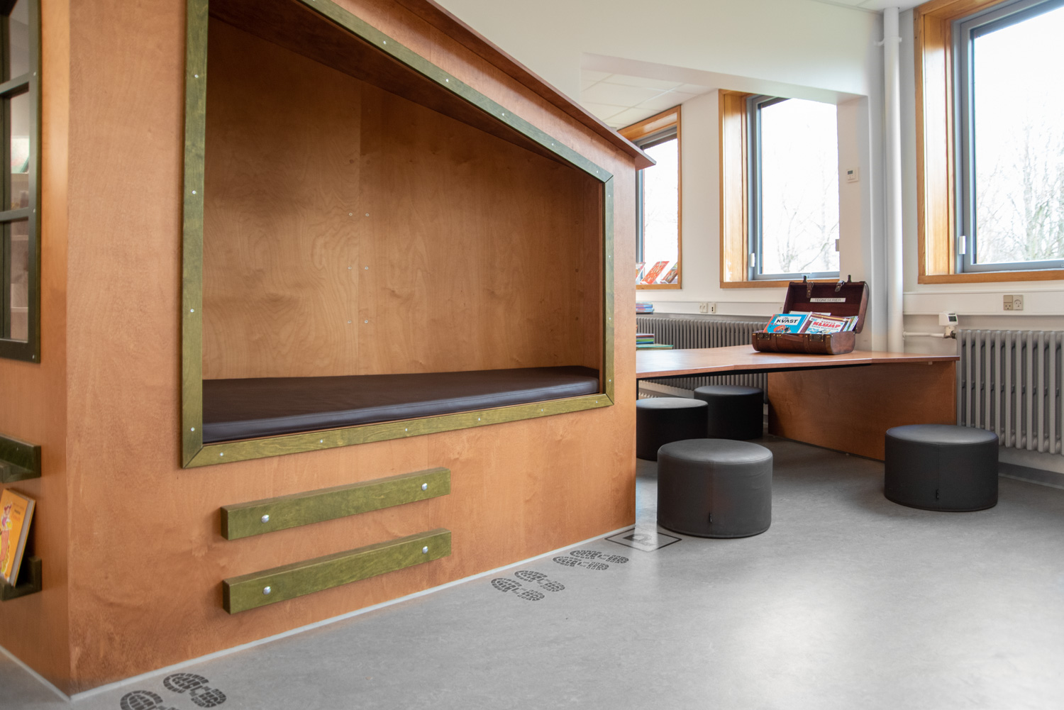 Der Eingang verwandelt sich in einen lebendigen Loungebereich mit Wandfolie, die deutlich in Richtung Fitnessstudio oder Bibliothek weist. In der Kinderabteilung erweckt die Wandfolie den Anschein, als würde man in den Wald treten. Die kleinen Baumstämme bieten Sitzgelegenheiten und die Hütte einen kleinen Raum, in dem die Kinder ungestört sitzen und in die Welt der Bücher eintauchen können