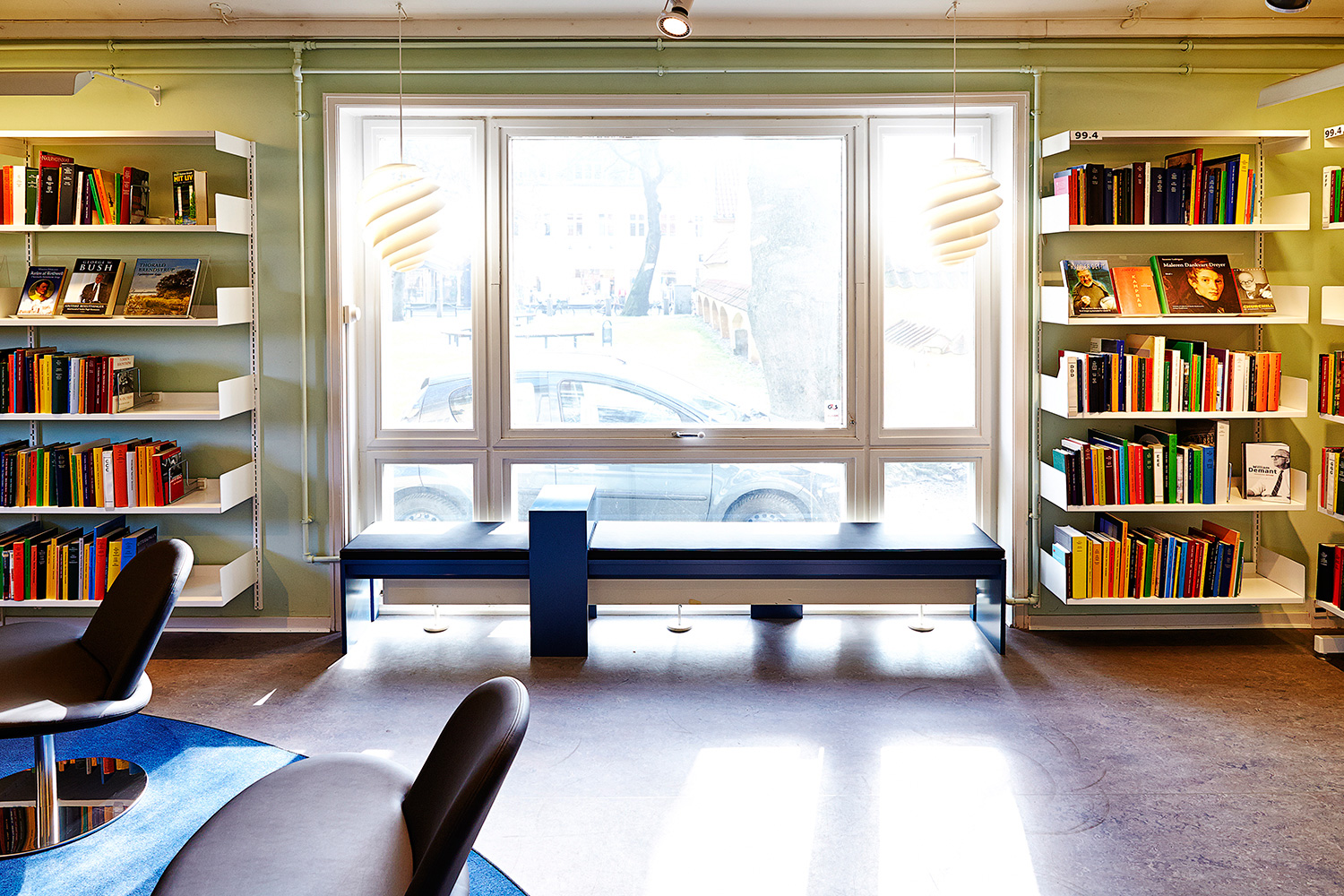Dabei wurde die Eingangszone komplett verändert, um Platz für ein Café und Ausstellungen zu gewinnen und ebenso um die verschiedenen Funktionsbereiche voneinander abzutrennen, damit das Gesuchte einfach zu finden ist. Ein großes und den Raum beherrschendes Fenster im Erdgeschoß ist das Hauptobjekt in dem neuen Stillen Lesesaal mit Aussicht auf den Park von einer maßgefertigten Bank aus. Zusammen mit der Bank betonen neue Lounge-Stühle und ein Teppich die spezielle Atmosphäre in dem Stillen Lesesaal.