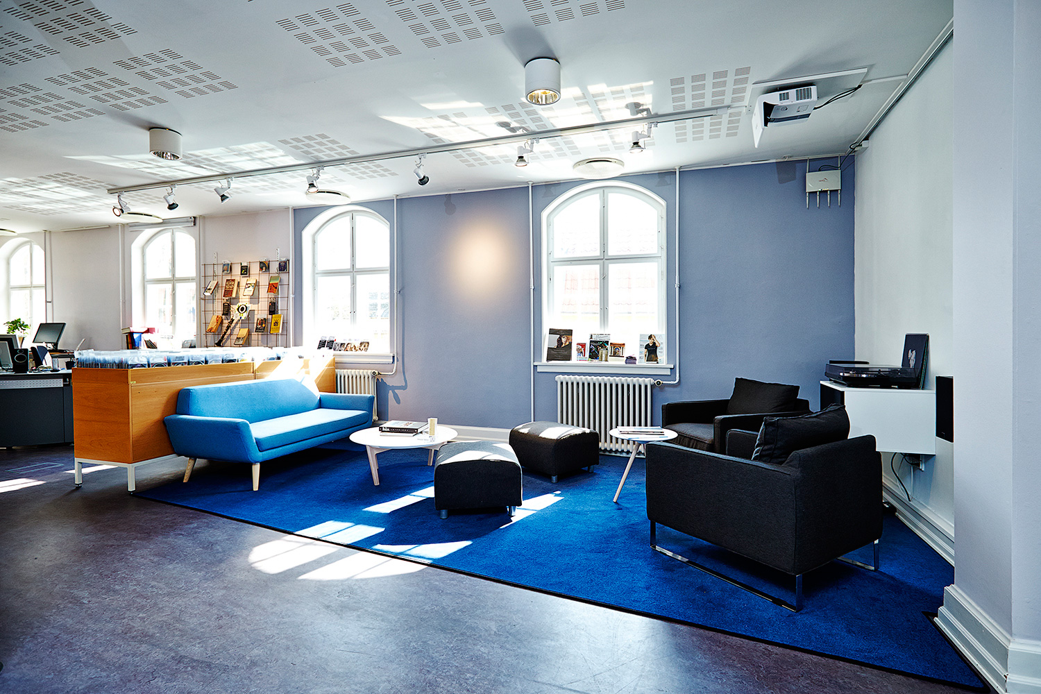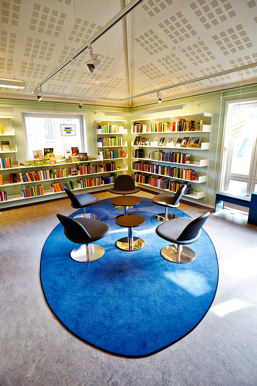 Die Bibliothek wünschte im ersten Obergeschoß eine Musikzone unterzubringen mit der Möglichkeit, Tonträger abzuspielen. Neues Mobiliar und ein Teppich bilden einen Raum im Raum.