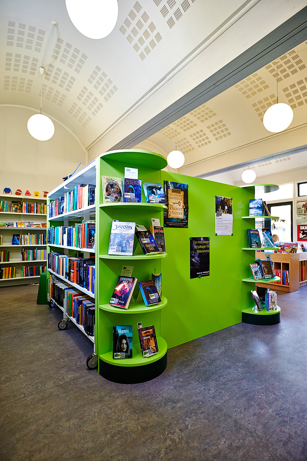 In der Zone zwischen Eingang und Kleinkindbereich gibt es einen Kinder- und Jugendbereich. Die vorhandenen Regale wurden zwecks optimaler Nutzung des Tageslichtes umgestellt. Ebenfalls sind neue Aufenthaltszonen wie maßgefertigte Lesenischen entstanden. Neben den Lesenischen umfassen die Sonderanfertigungen auch Display-Möbel.