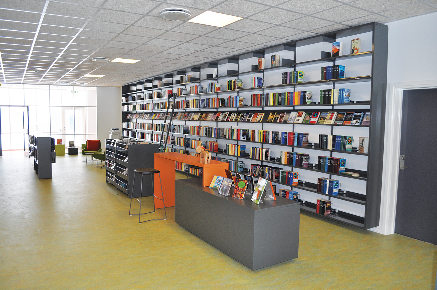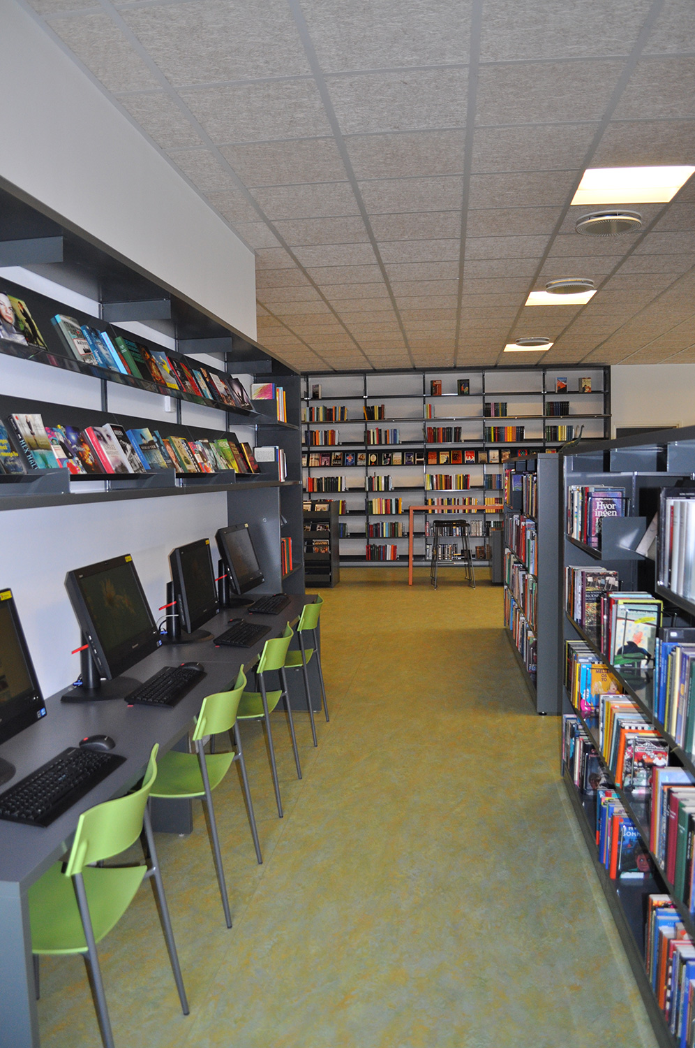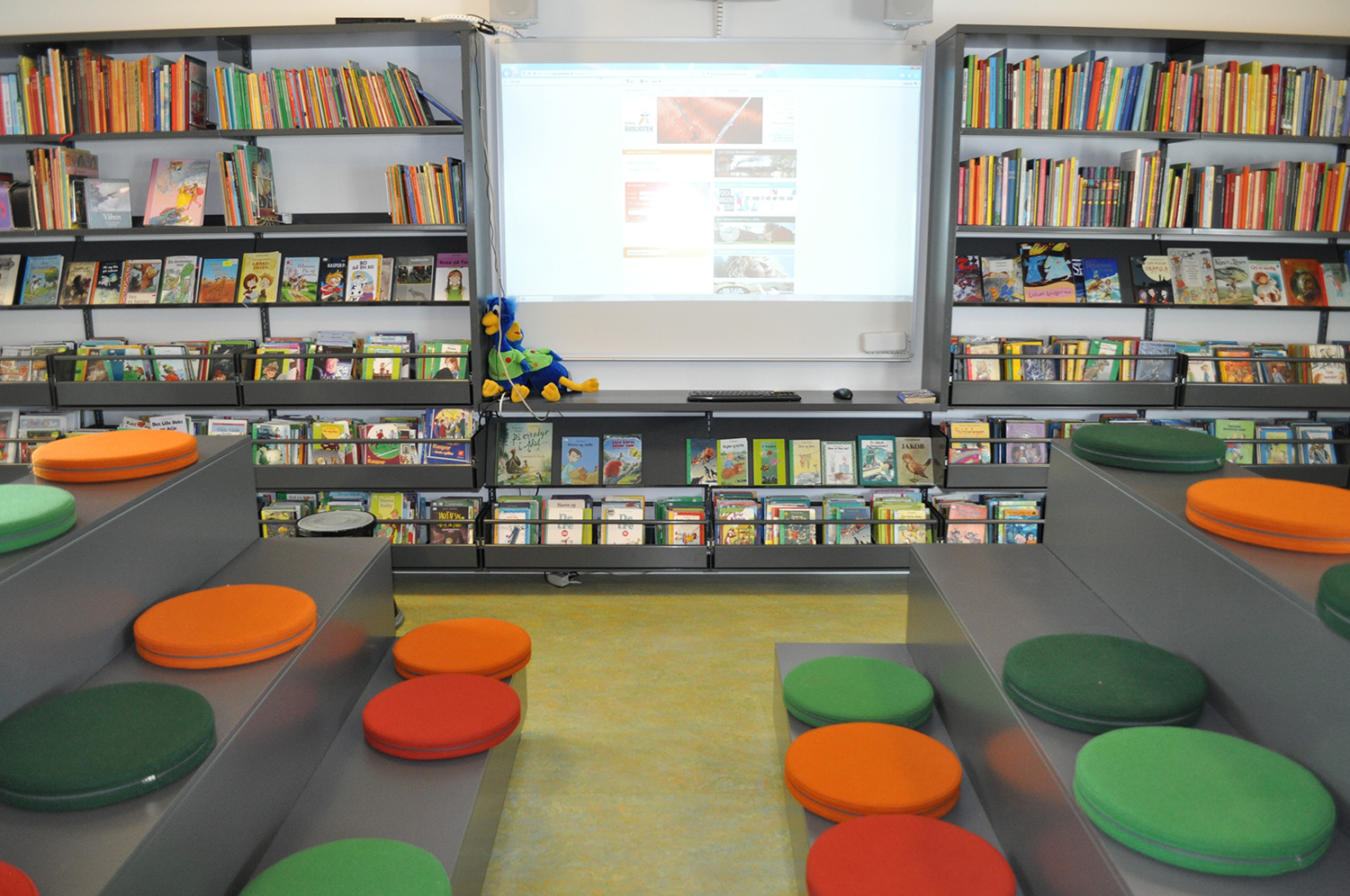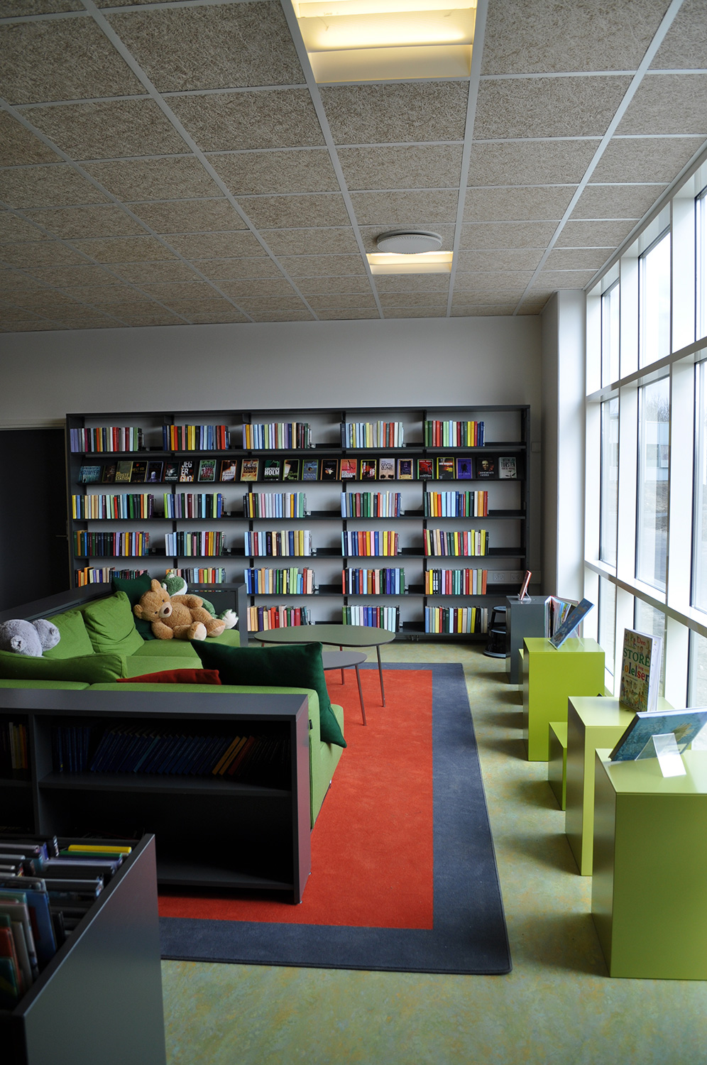 Die Regale sind individuell angepasst, es gibt integrierte Computertische und viele andere maßgeschneiderte Lösungen. Zum Beispiel farbige Wände zwischen den Regalen, die Freude ausstrahlen, und abgeschiedene Bereiche für die Benutzer.