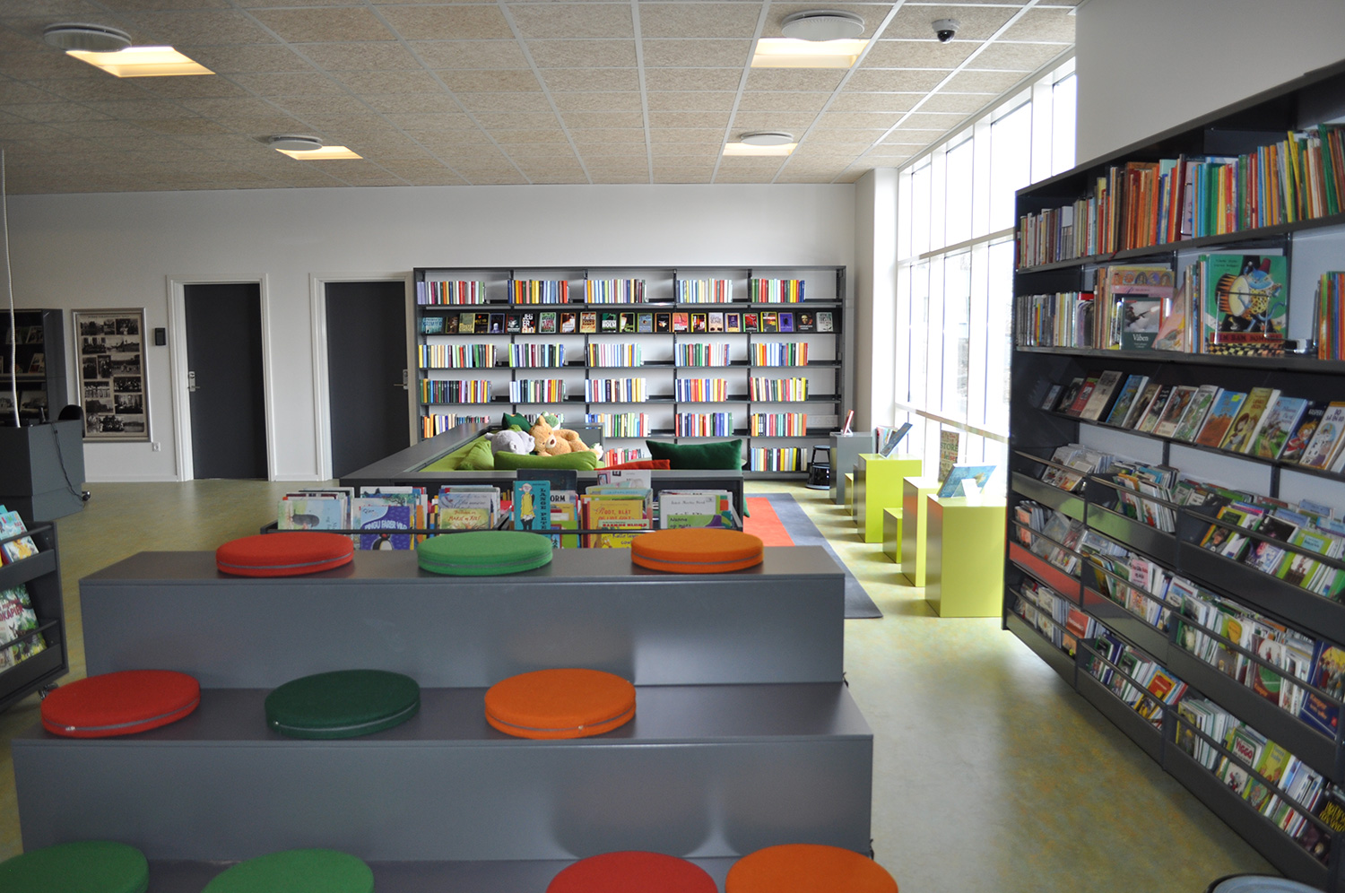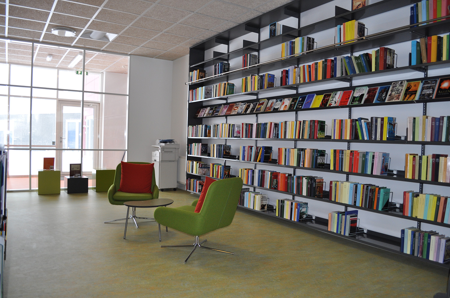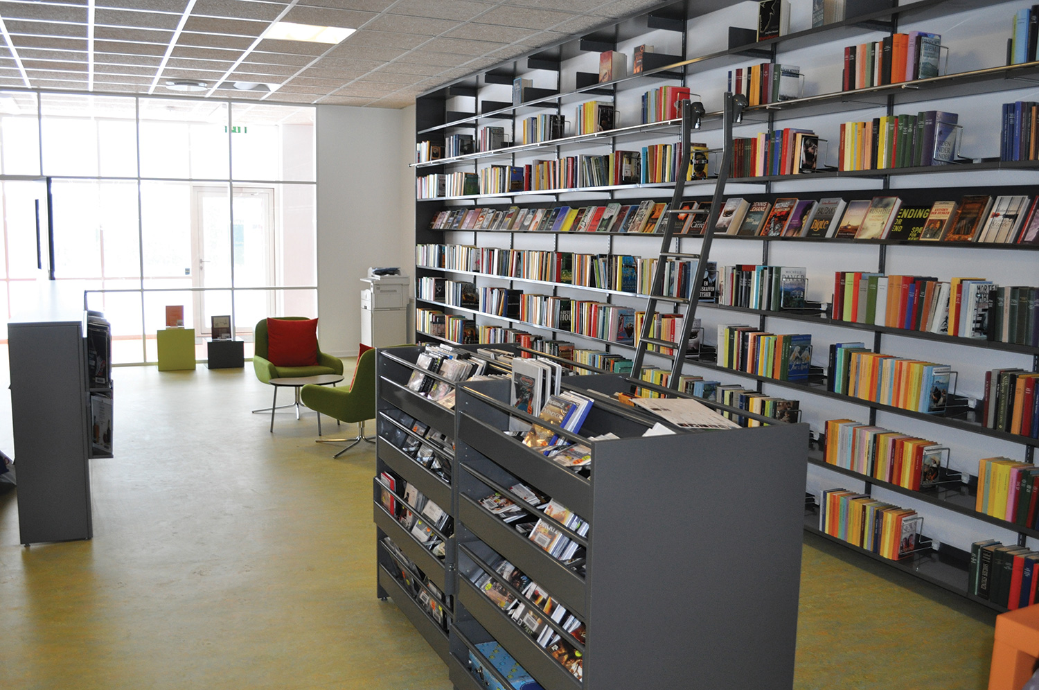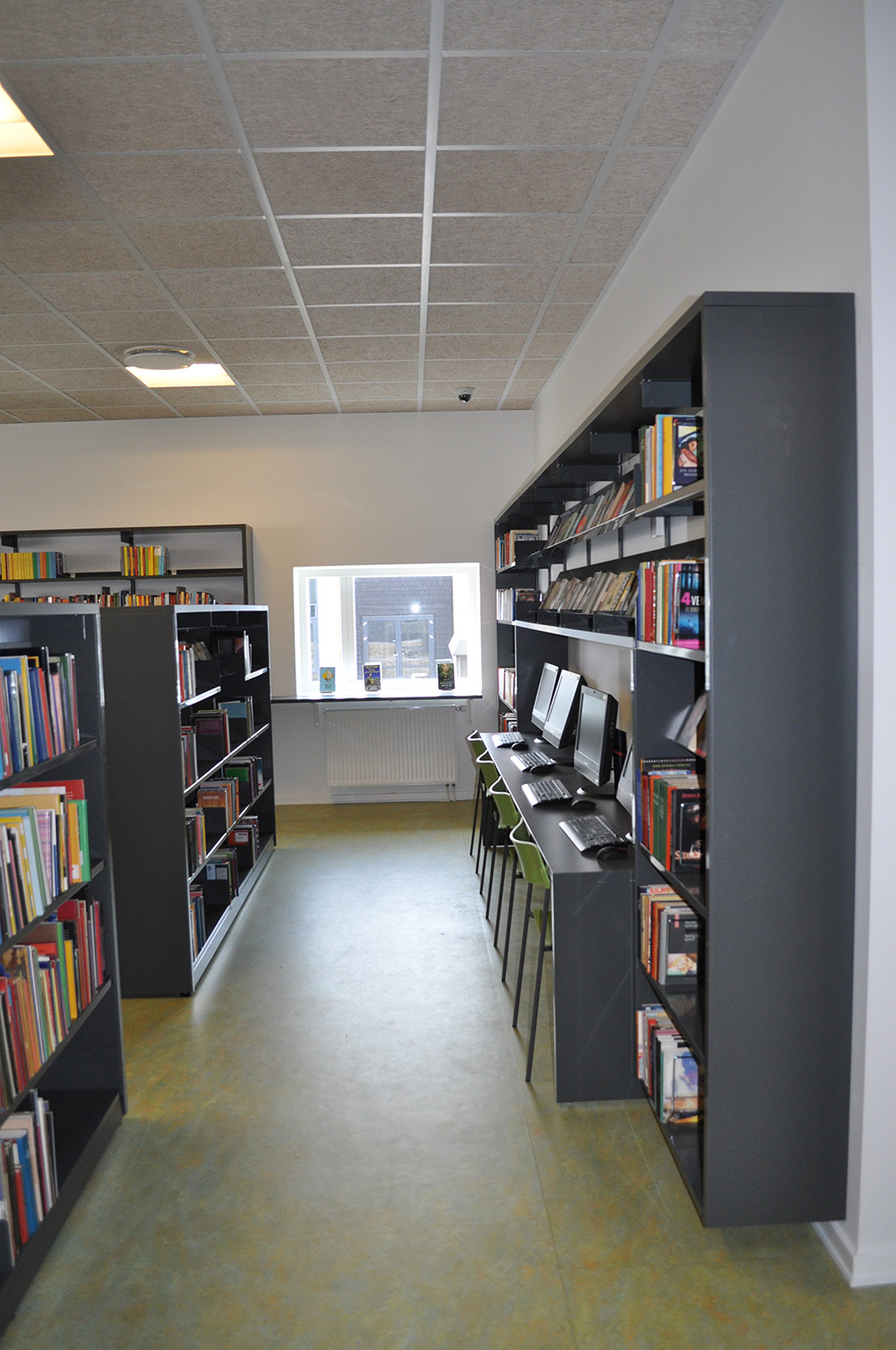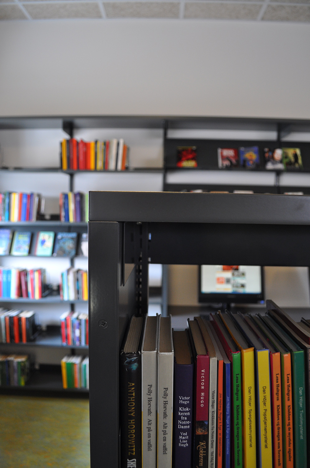Die Regale sind individuell angepasst, es gibt integrierte Computertische und viele andere maßgeschneiderte Lösungen. Zum Beispiel farbige Wände zwischen den Regalen, die Freude ausstrahlen, und abgeschiedene Bereiche für die Benutzer.