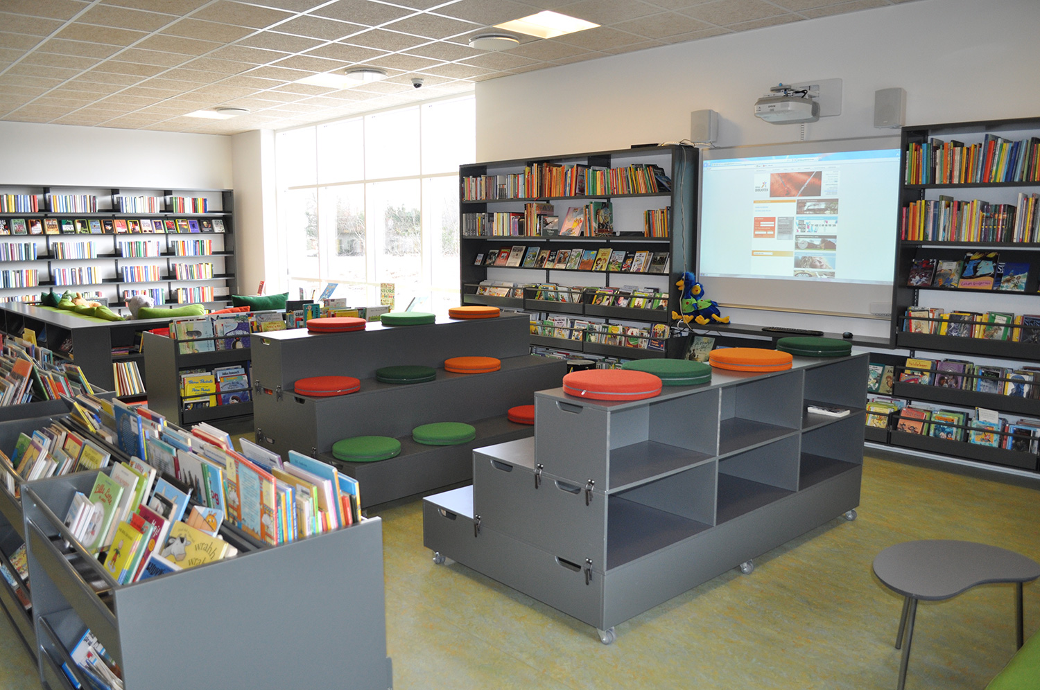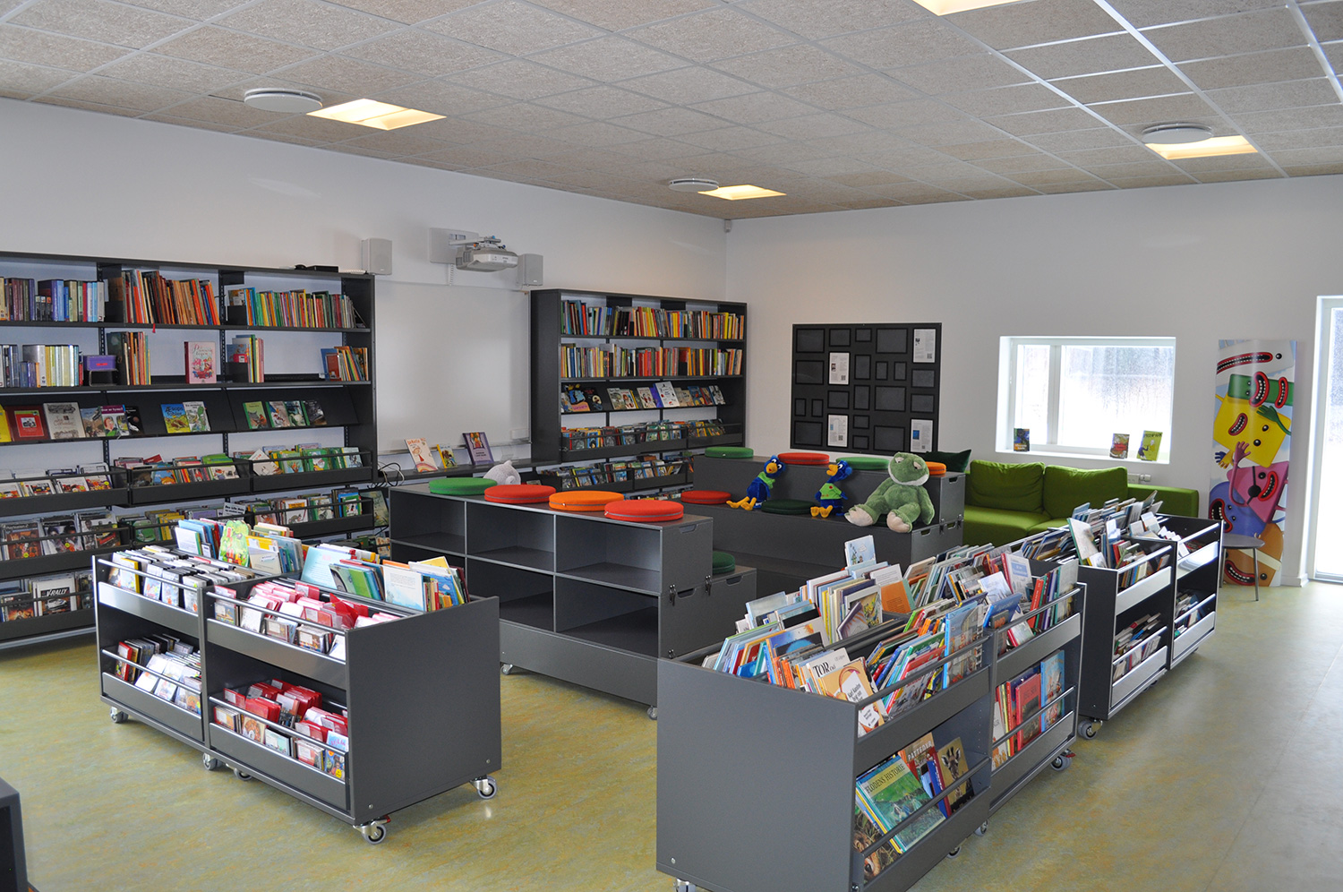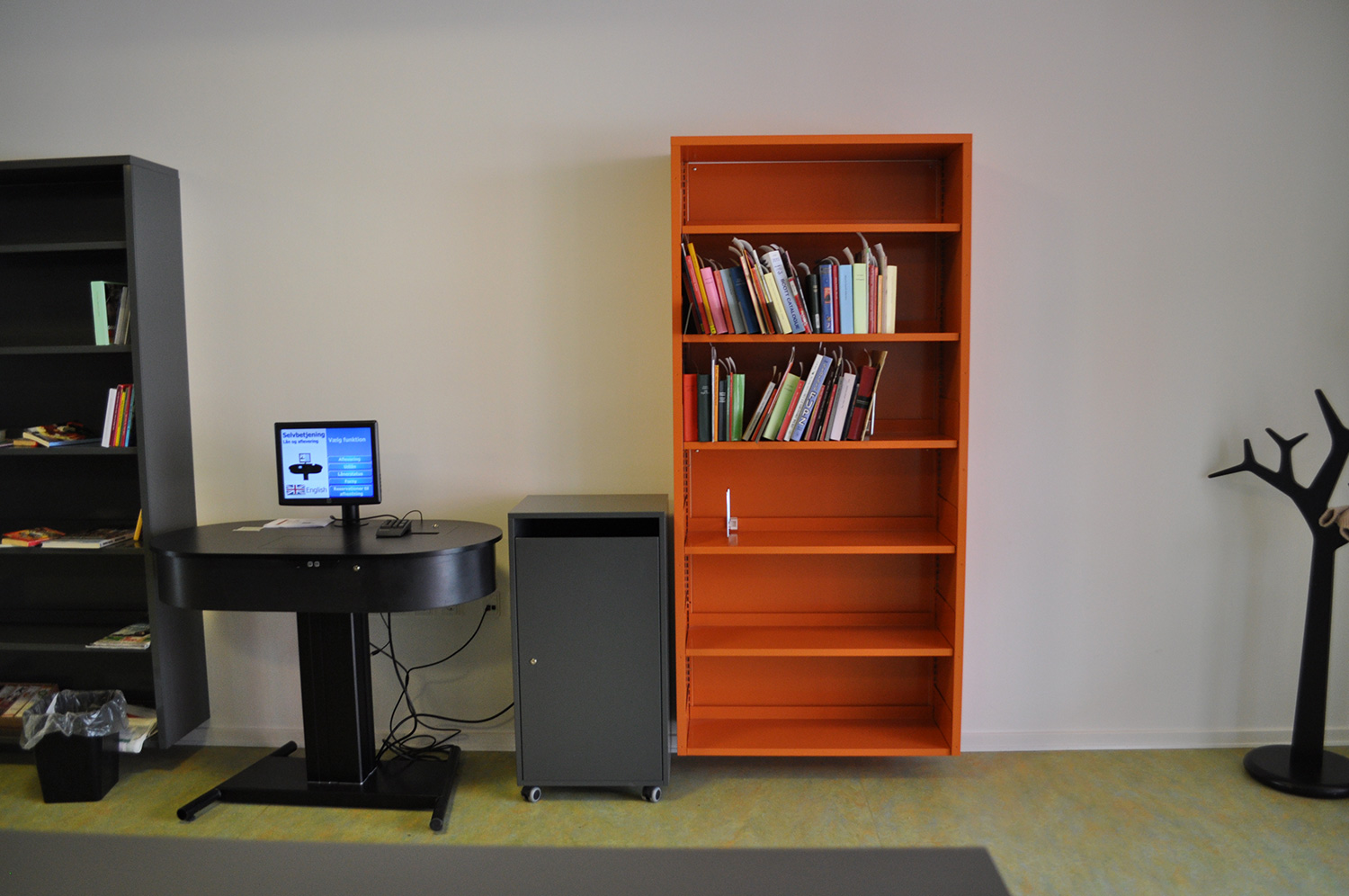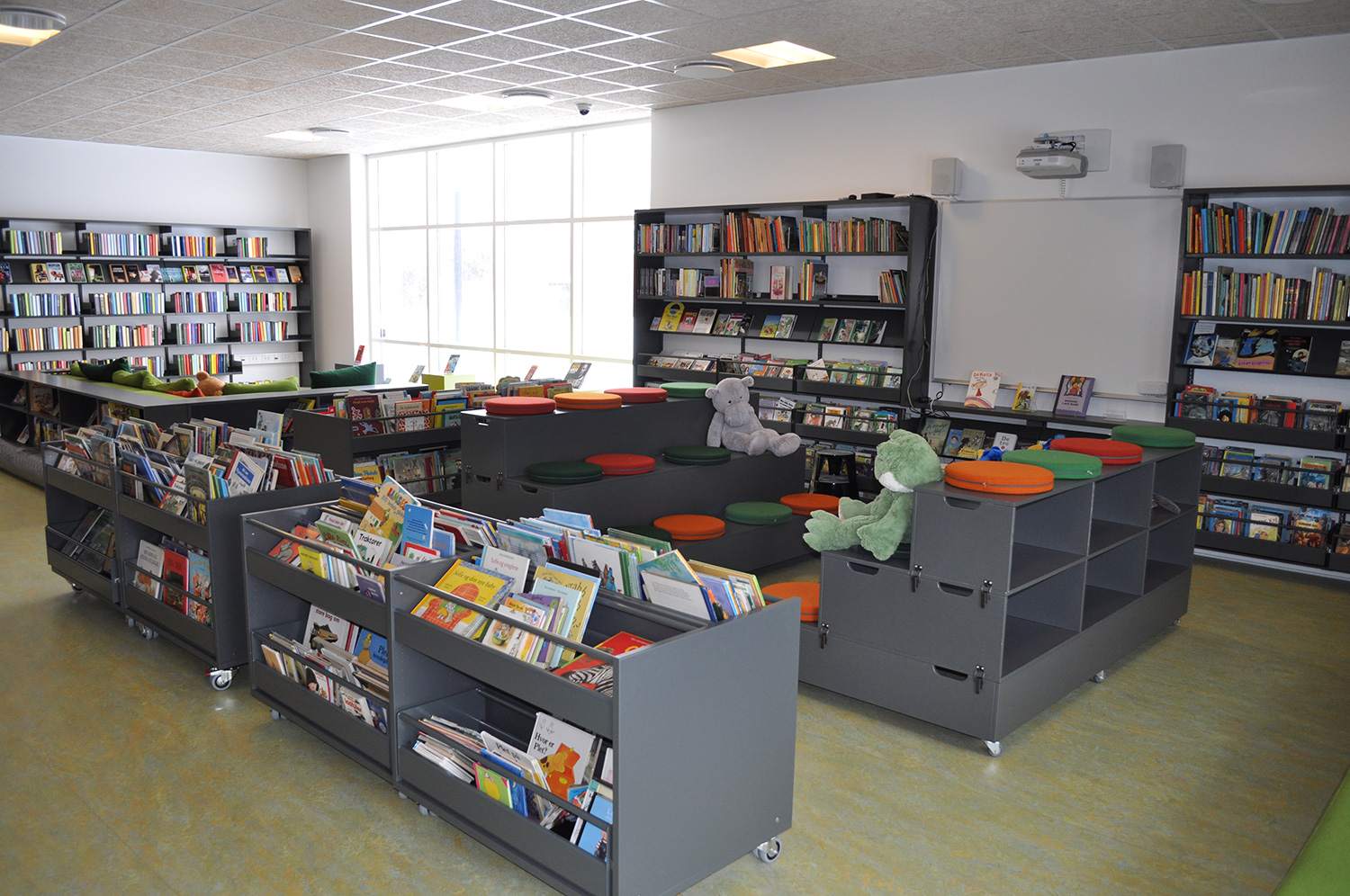 Die Regale sind individuell angepasst, es gibt integrierte Computertische und viele andere maßgeschneiderte Lösungen. Zum Beispiel farbige Wände zwischen den Regalen, die Freude ausstrahlen, und abgeschiedene Bereiche für die Benutzer.