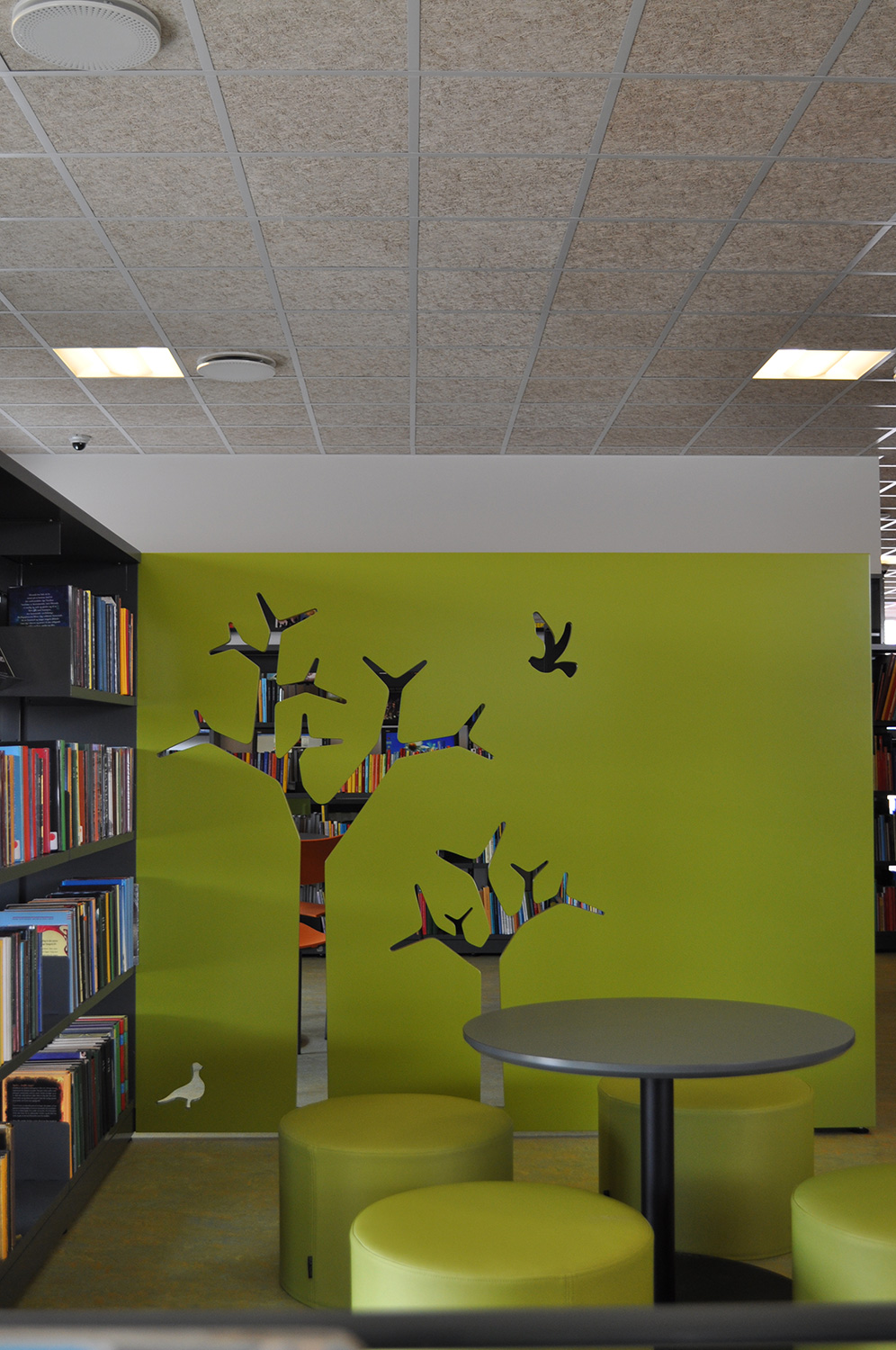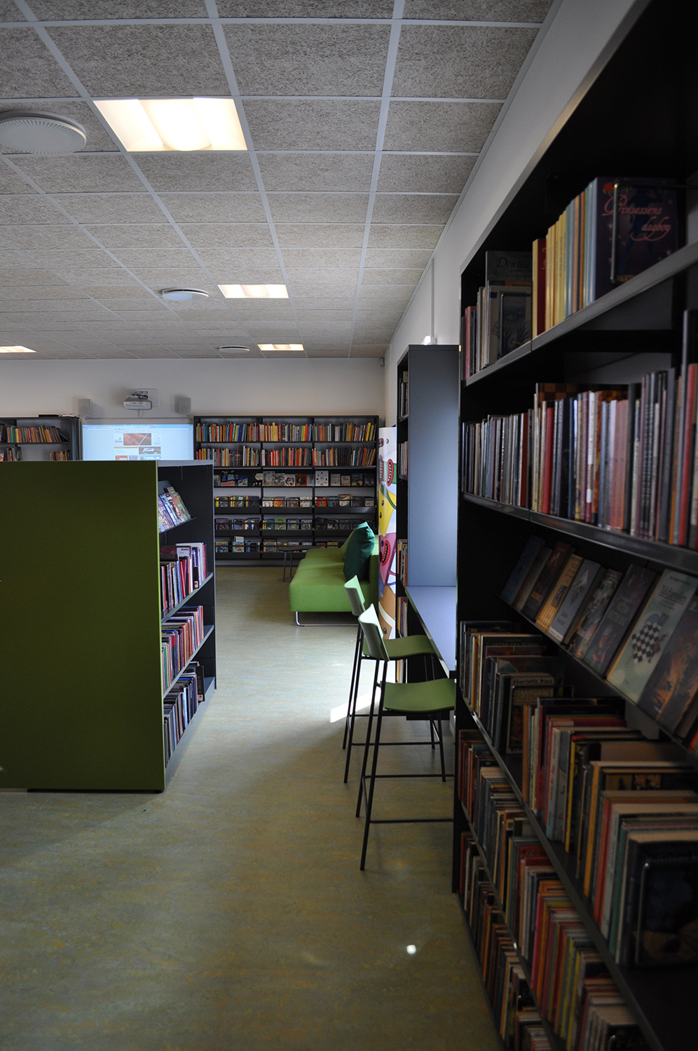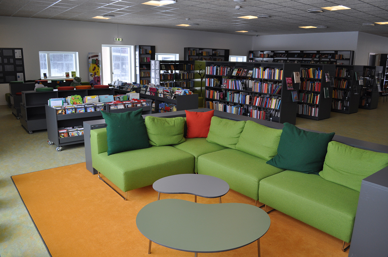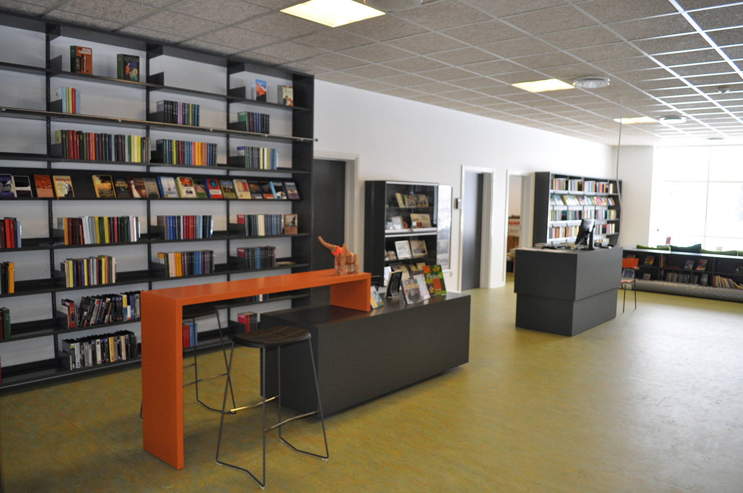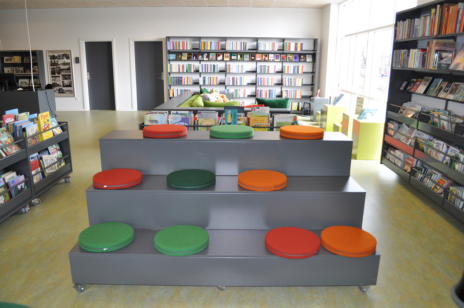 Die Regale sind individuell angepasst, es gibt integrierte Computertische und viele andere maßgeschneiderte Lösungen. Zum Beispiel farbige Wände zwischen den Regalen, die Freude ausstrahlen, und abgeschiedene Bereiche für die Benutzer.