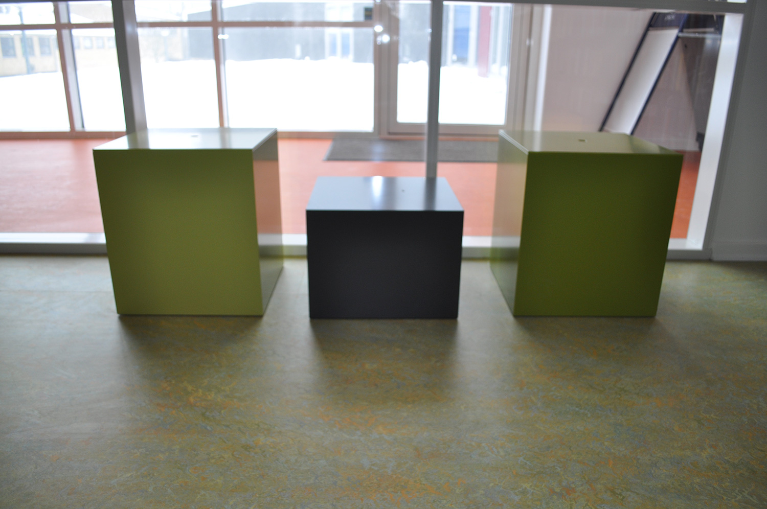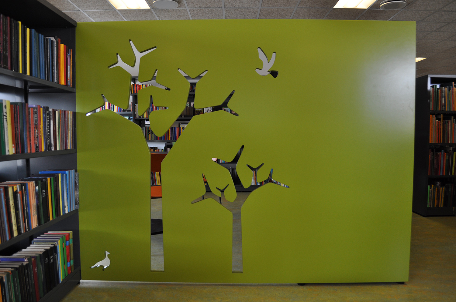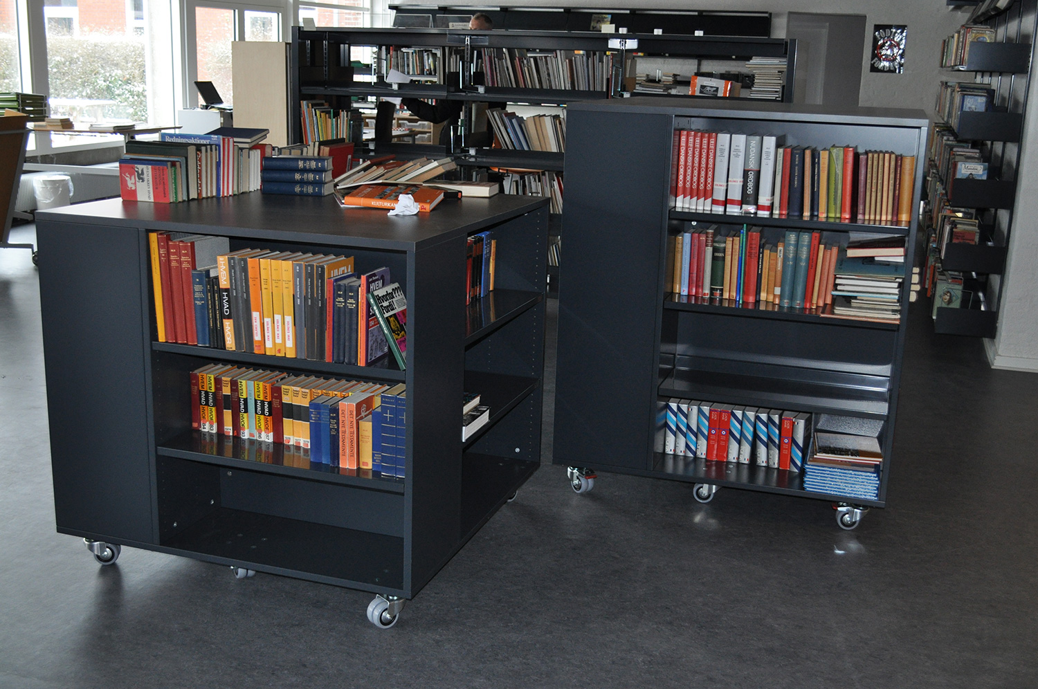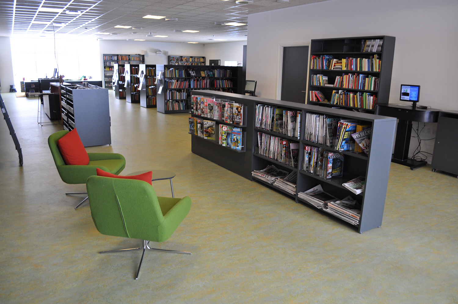 Die Regale sind individuell angepasst, es gibt integrierte Computertische und viele andere maßgeschneiderte Lösungen. Zum Beispiel farbige Wände zwischen den Regalen, die Freude ausstrahlen, und abgeschiedene Bereiche für die Benutzer.