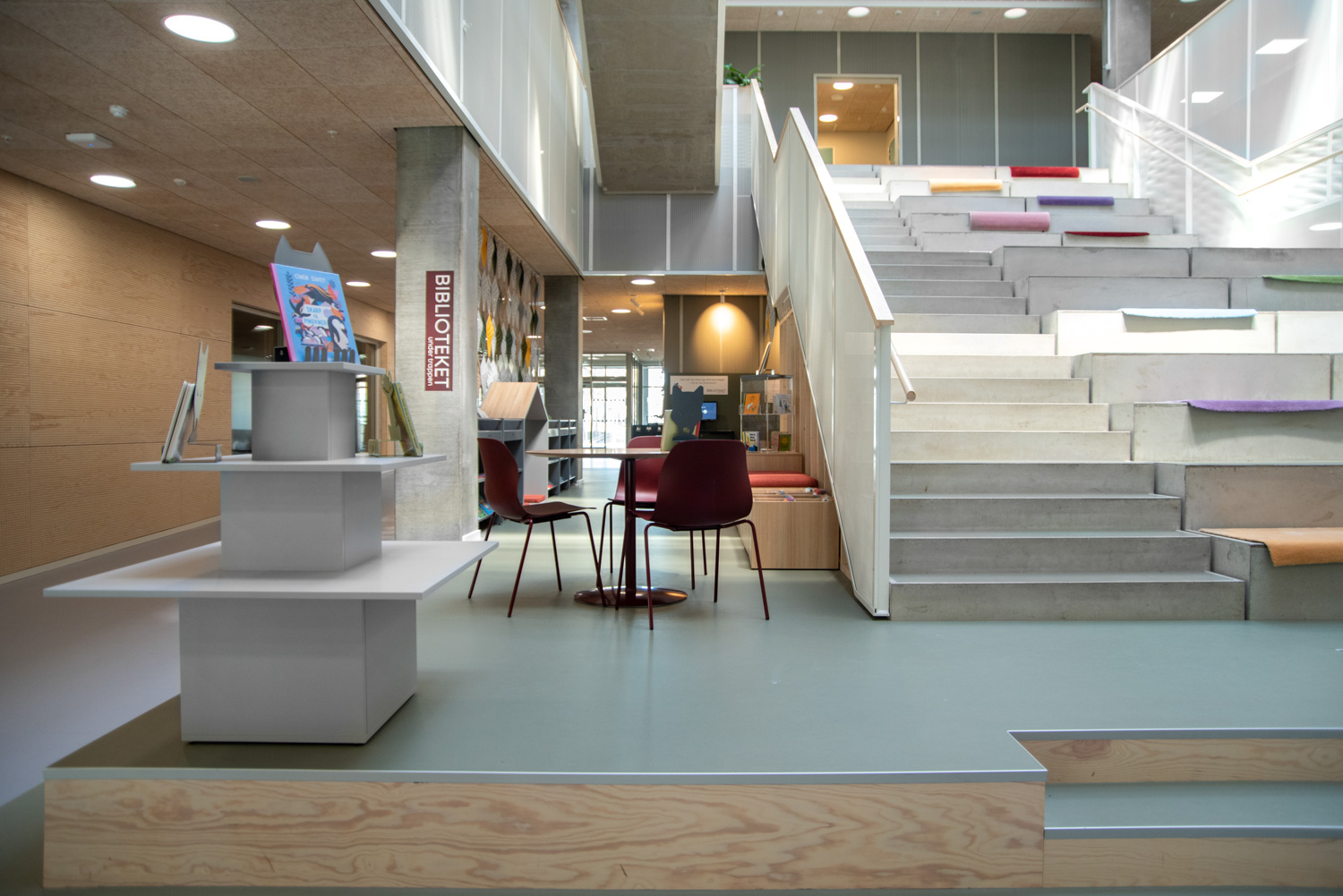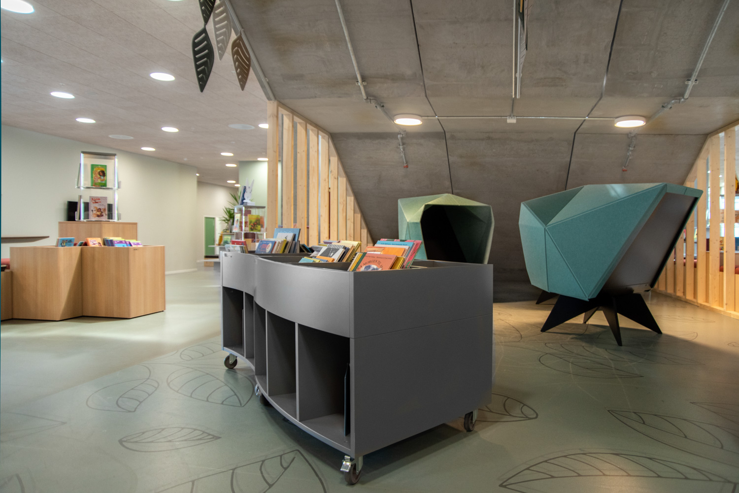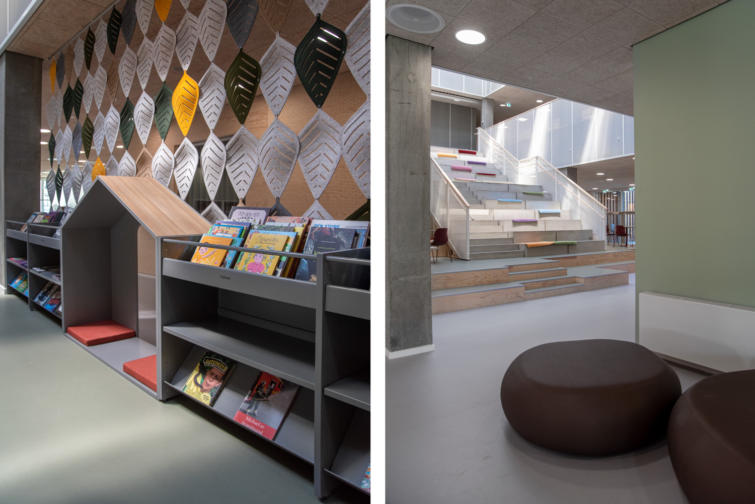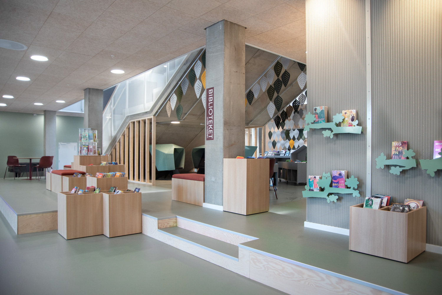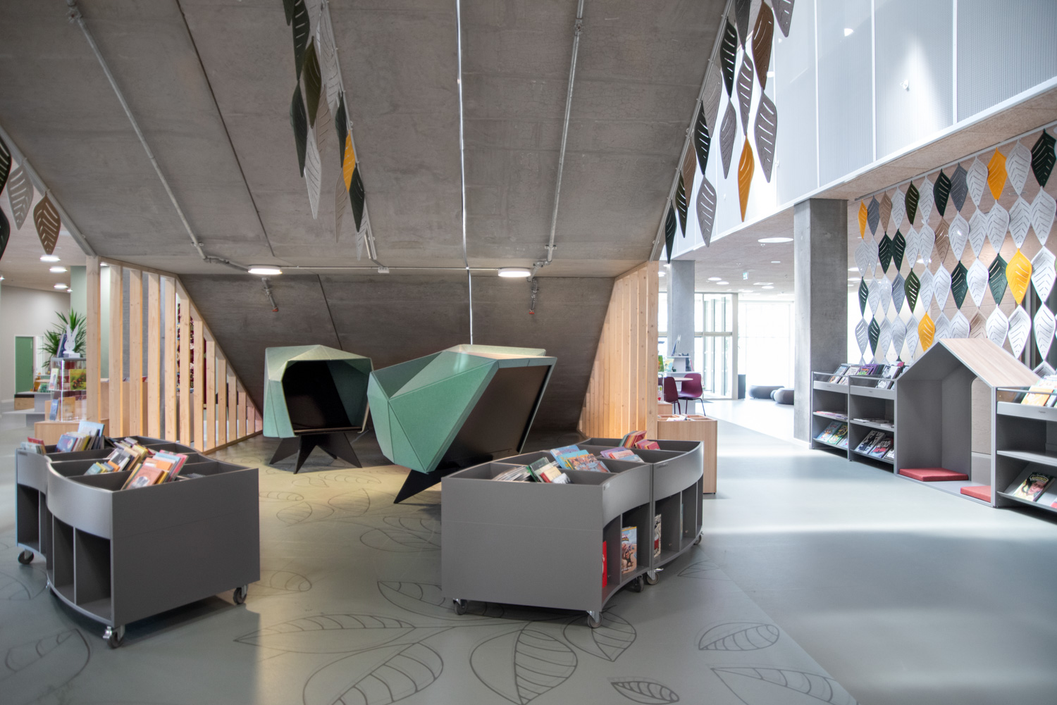 Die Bibliothek zeichnet sich durch ihre dekorativen Elemente aus, die einen spielerischen und biophilen Ausdruck schaffen. Gleichzeitig fügt sich die Bibliothek perfekt in den Rest des Gebäudes ein, da die Farben so gewählt wurden, dass sie die warme Farbpalette aus Rot und Blaugrün unterstützen, die für das gesamte Kulturhaus charakteristisch ist.