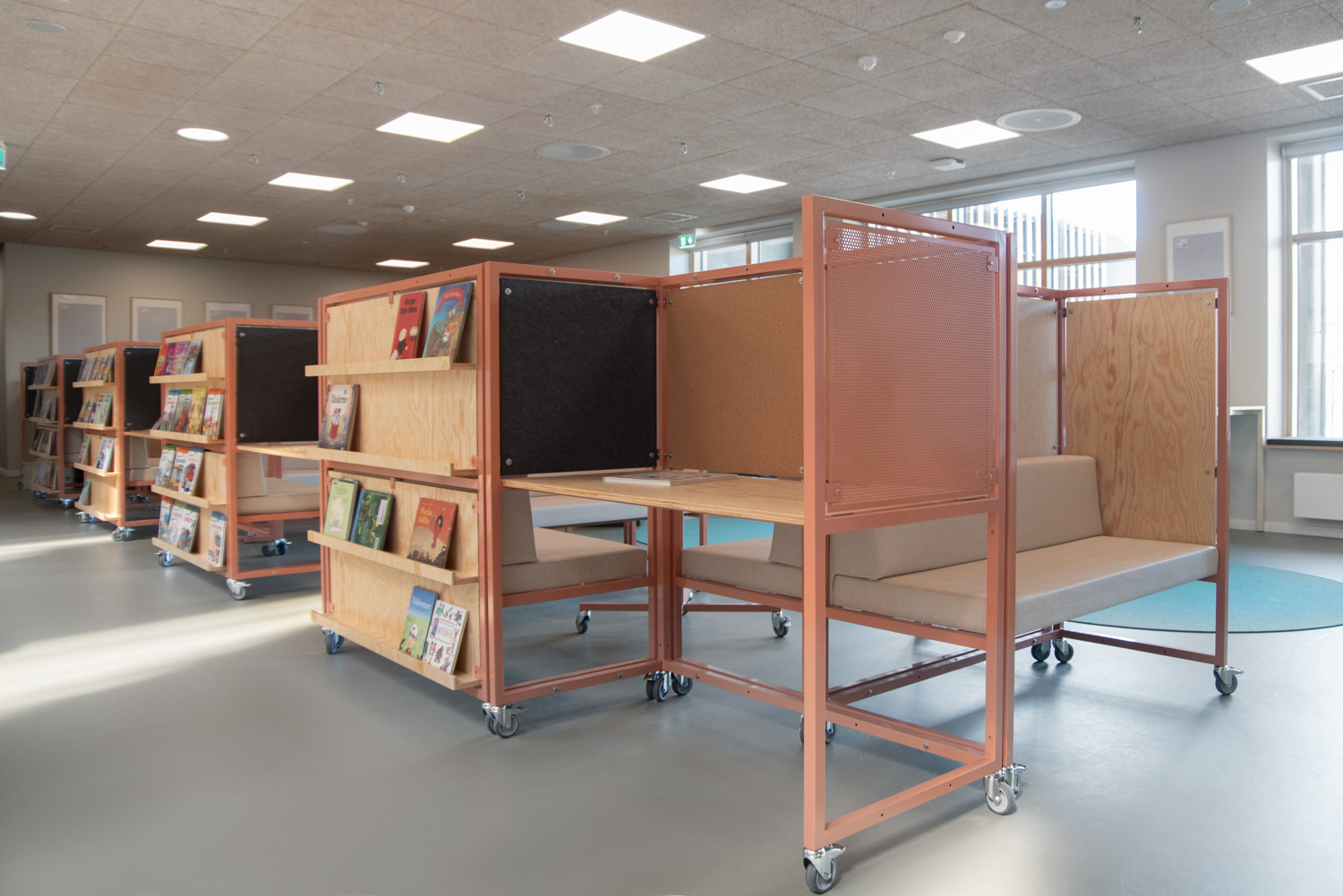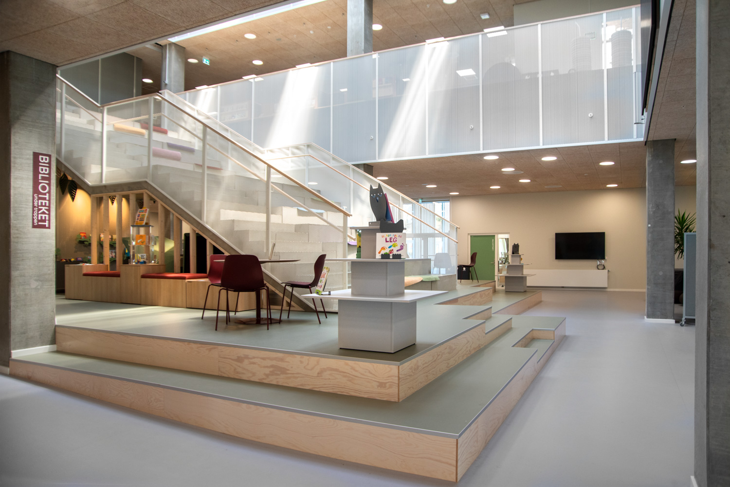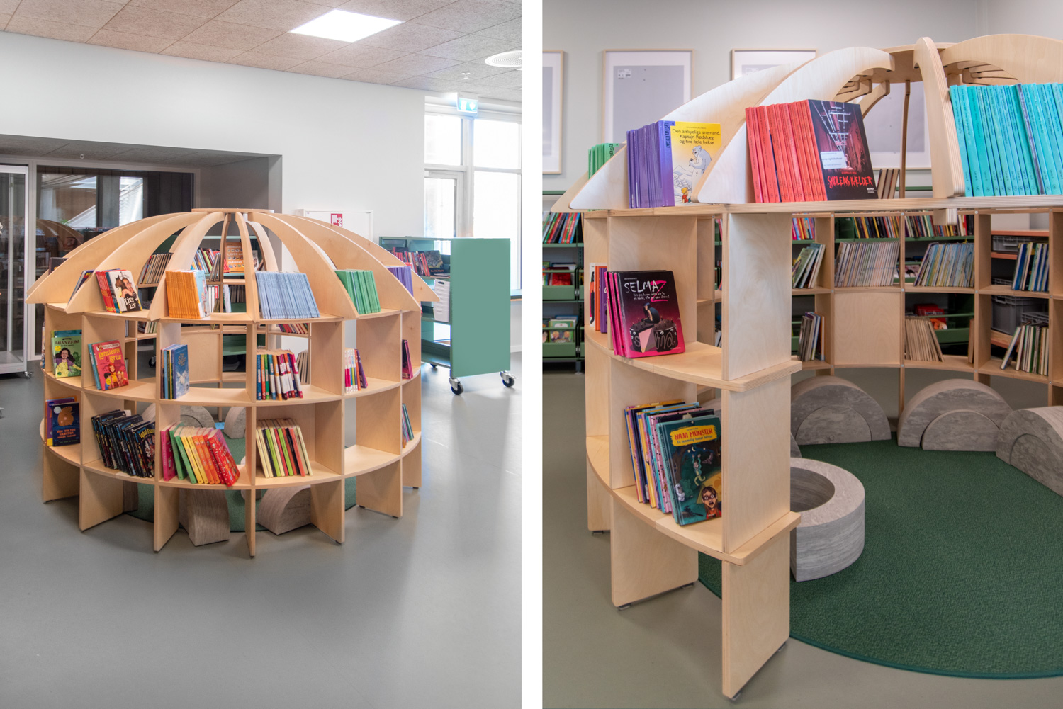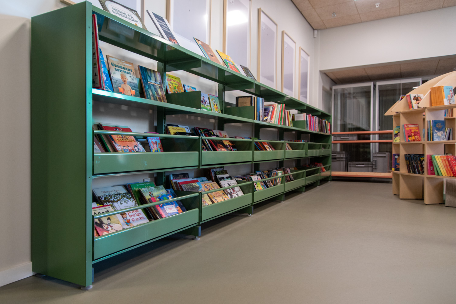 Die Bibliothek zeichnet sich durch ihre dekorativen Elemente aus, die einen spielerischen und biophilen Ausdruck schaffen. Gleichzeitig fügt sich die Bibliothek perfekt in den Rest des Gebäudes ein, da die Farben so gewählt wurden, dass sie die warme Farbpalette aus Rot und Blaugrün unterstützen, die für das gesamte Kulturhaus charakteristisch ist.