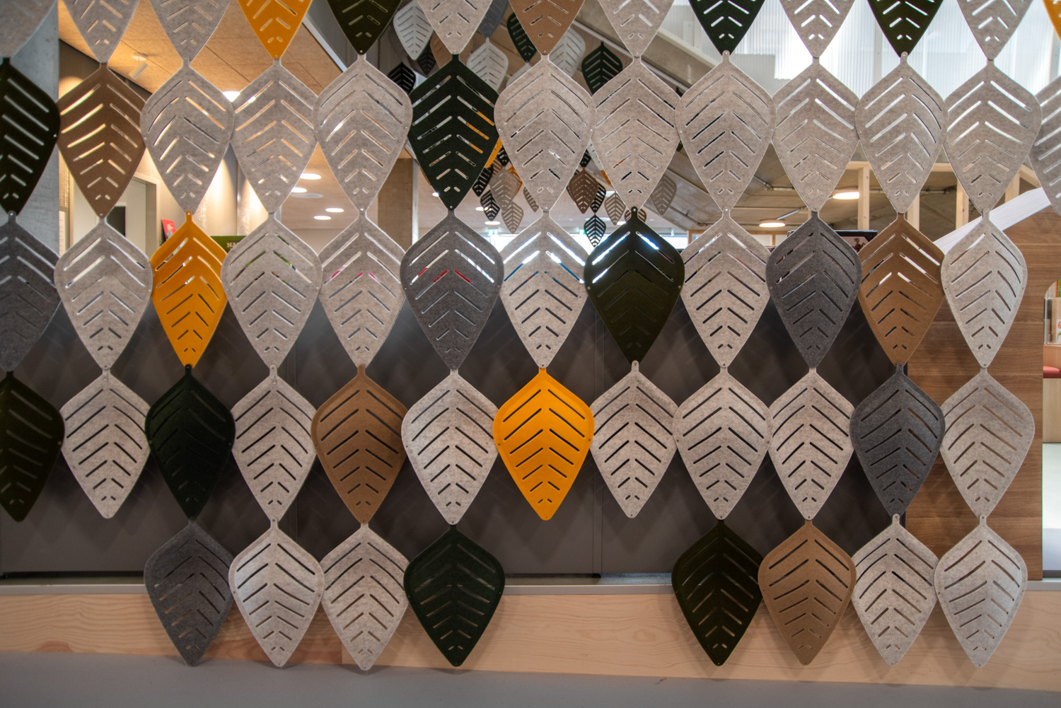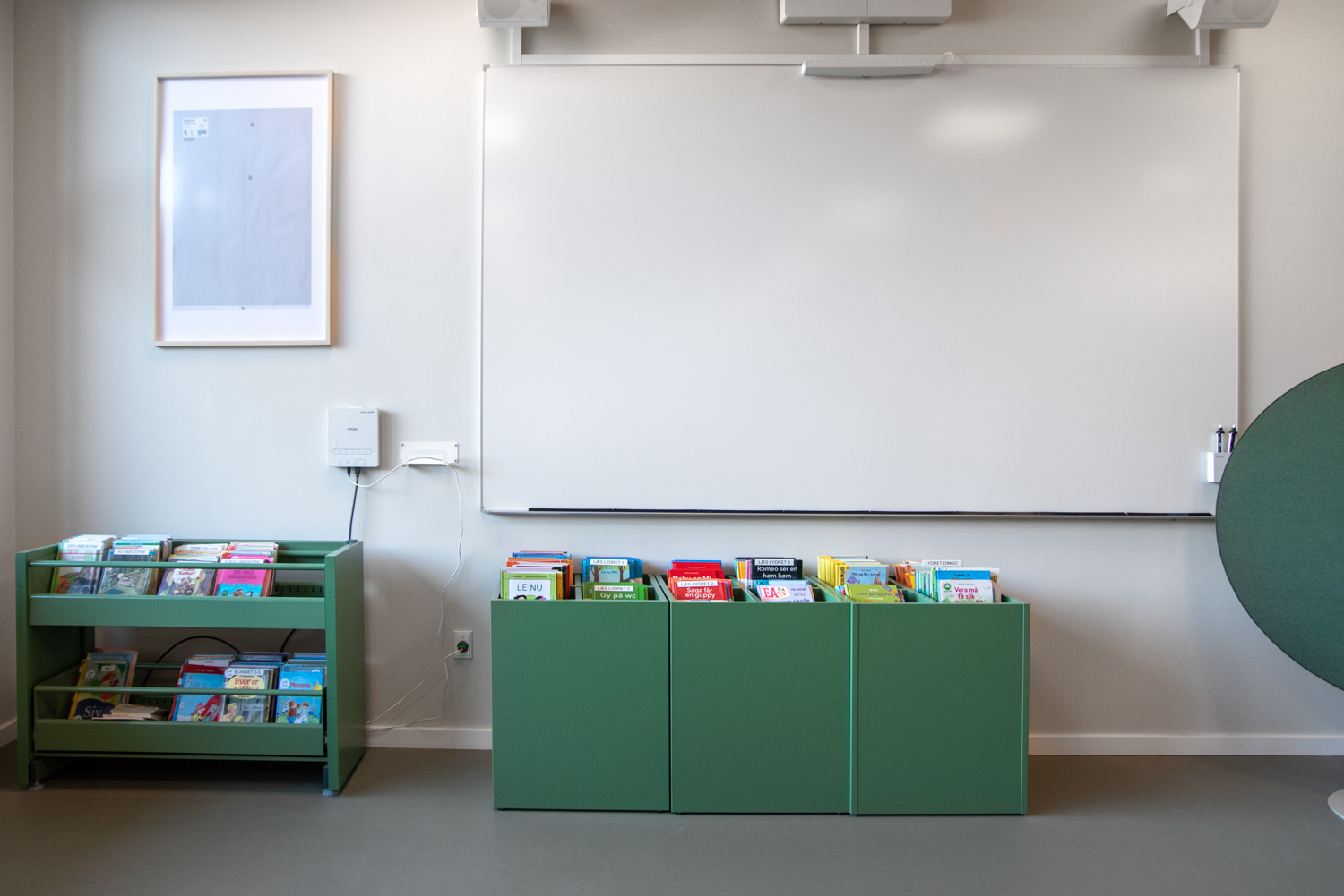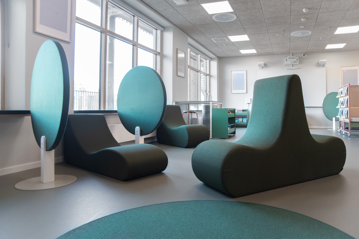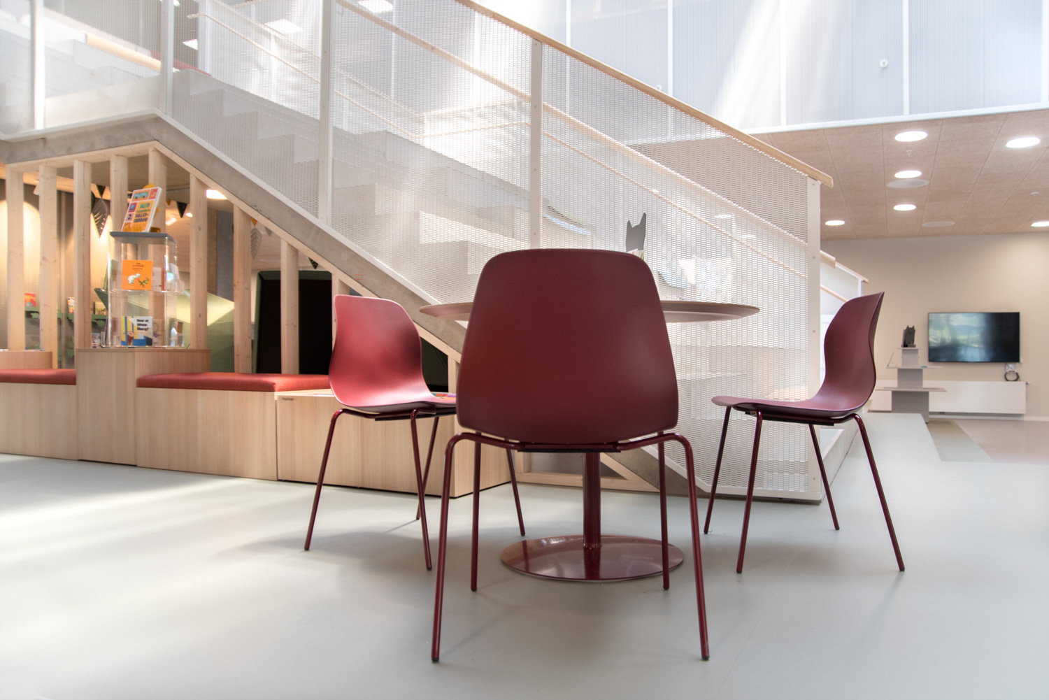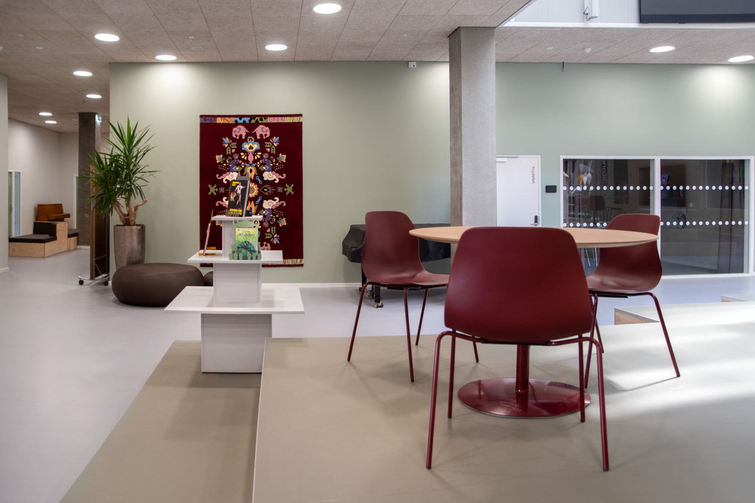 Die Bibliothek zeichnet sich durch ihre dekorativen Elemente aus, die einen spielerischen und biophilen Ausdruck schaffen. Gleichzeitig fügt sich die Bibliothek perfekt in den Rest des Gebäudes ein, da die Farben so gewählt wurden, dass sie die warme Farbpalette aus Rot und Blaugrün unterstützen, die für das gesamte Kulturhaus charakteristisch ist.