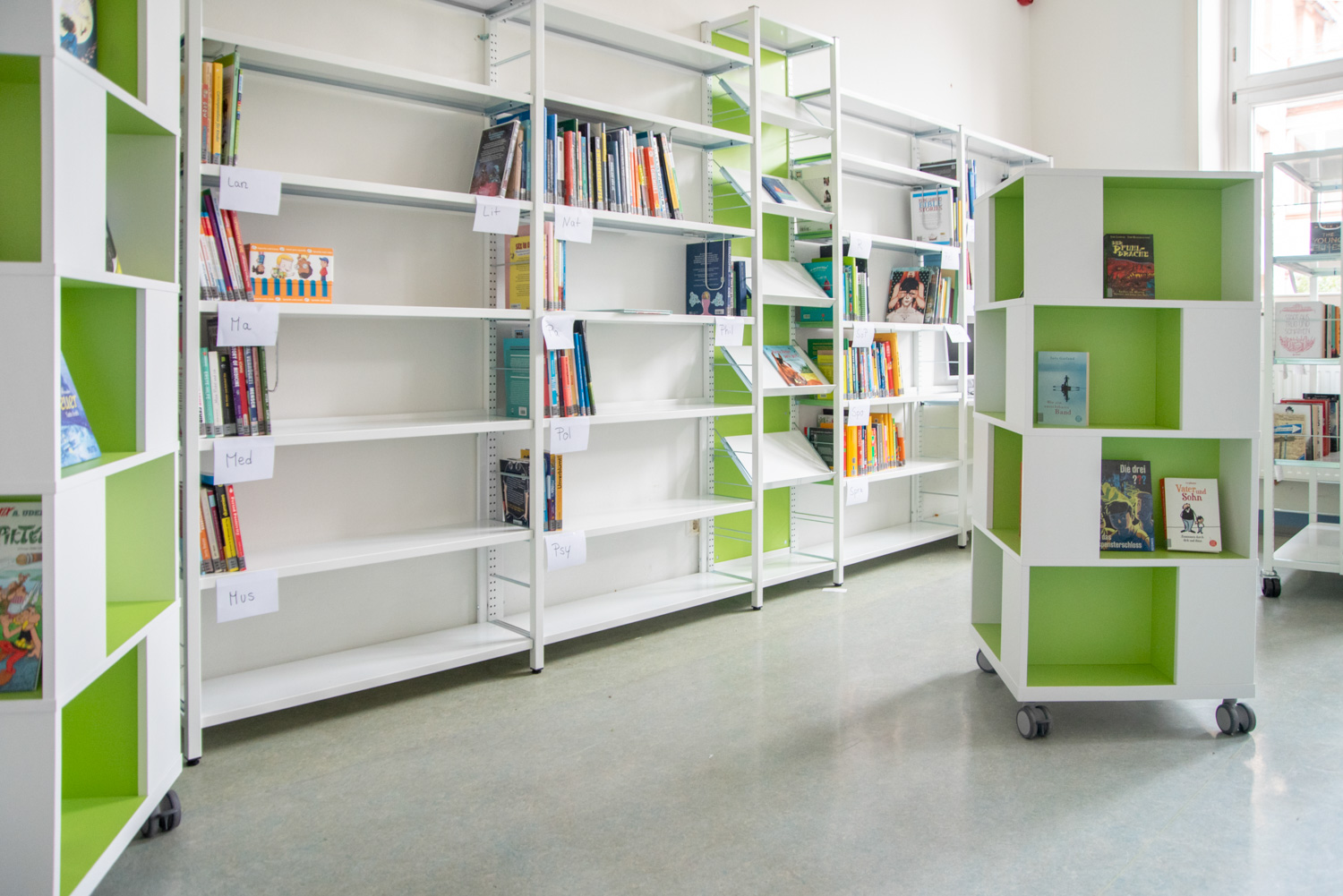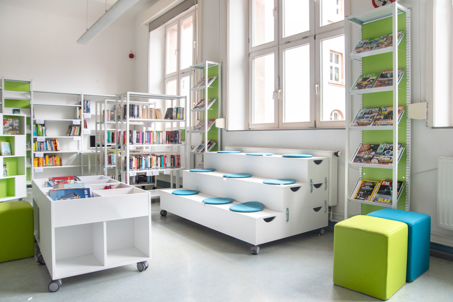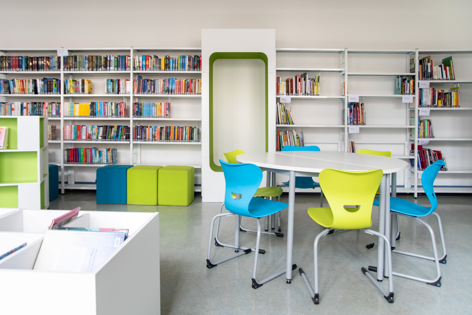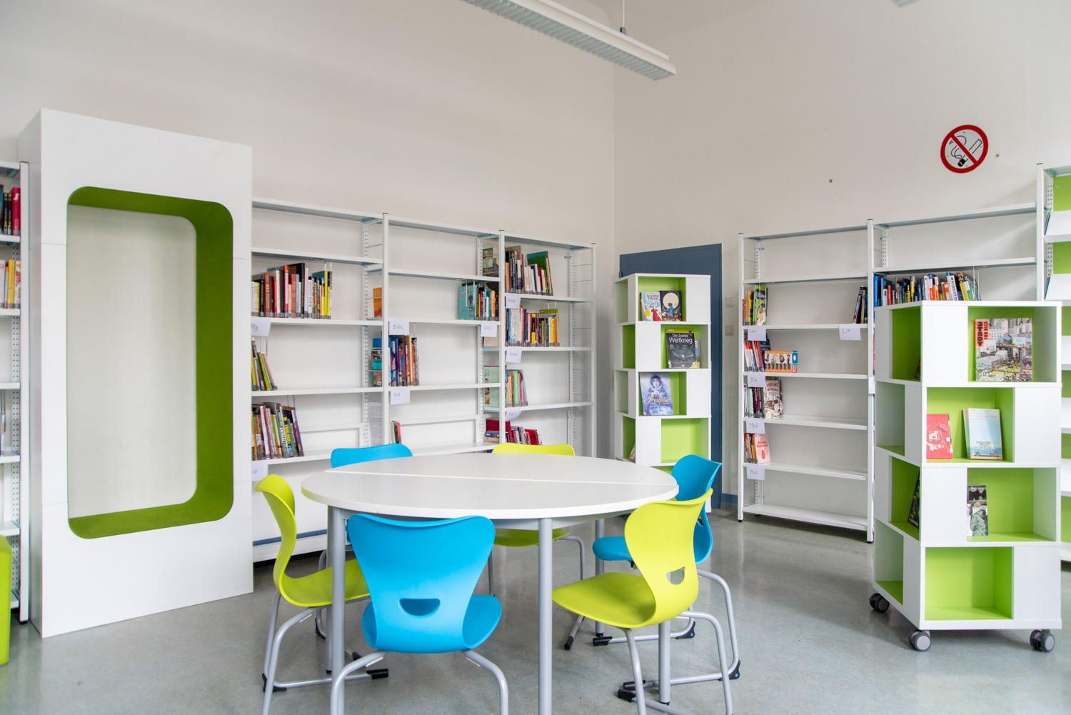 Ehemalige Klassenräume für eine Schülerbibliothek zu nutzen ist oft eine Herausforderung. Hier haben wir in Zusammenarbeit mit der Schule ein sehr gut gelungenes Beispiel abgeliefert.
