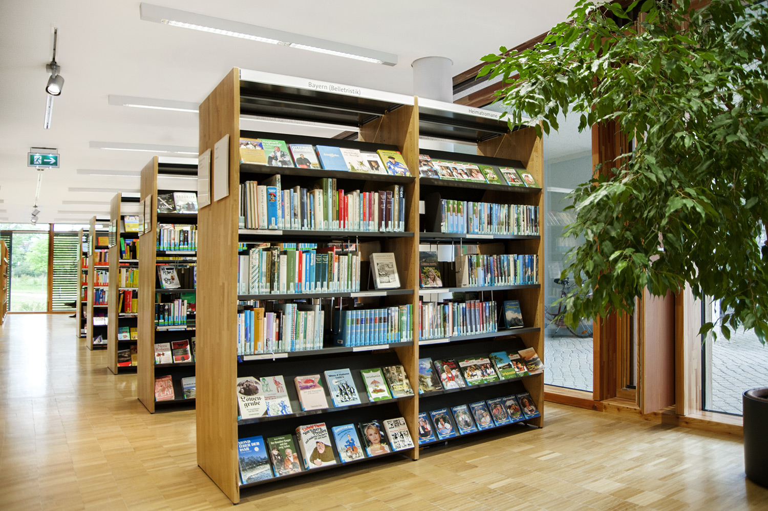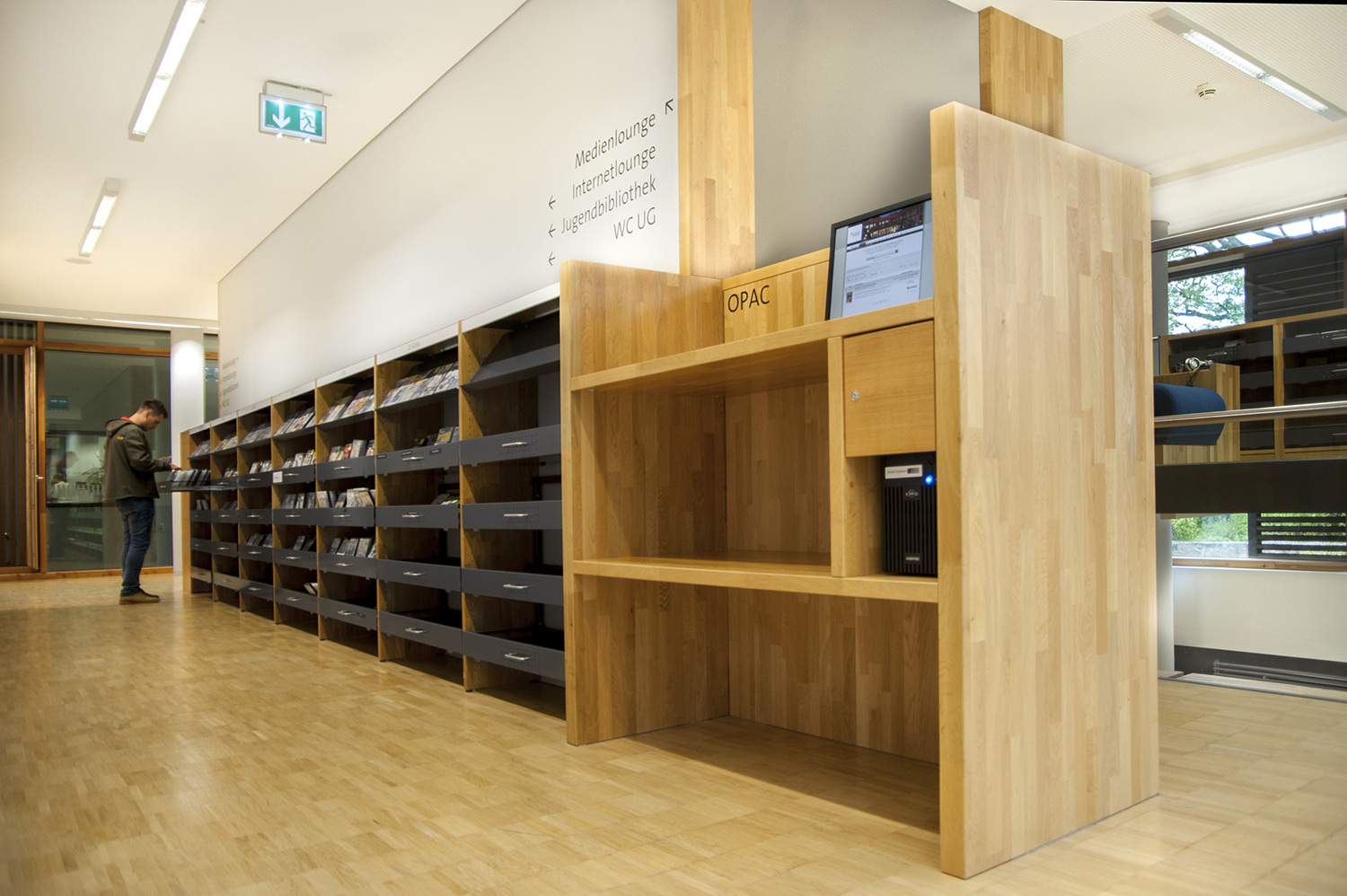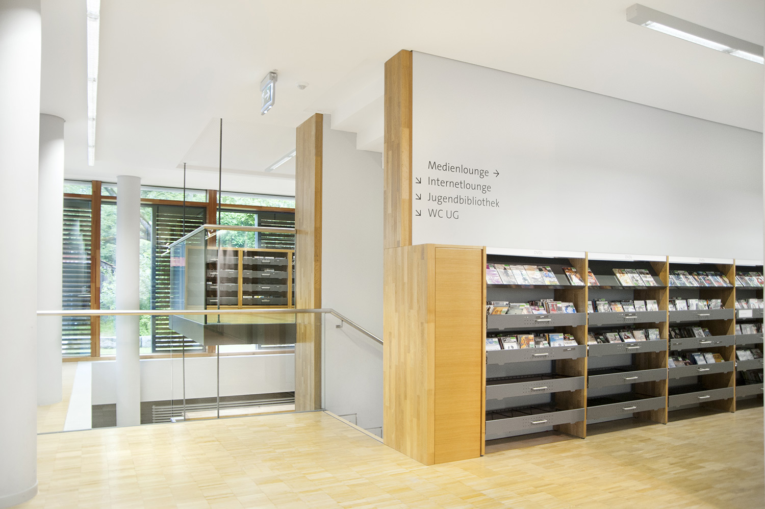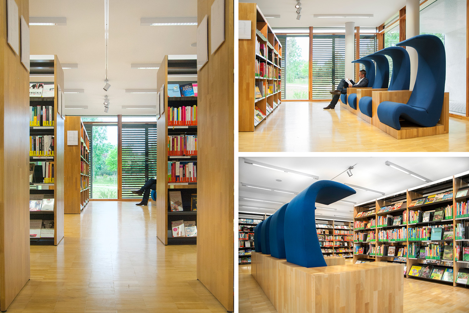Das Highlight der öffentlichen Bibliothek, einem Neubau auf dem Gelände der traditionellen Seidl-Mühle (Museum) am Seebach, ist das begehbare „Bullauge“. Typisch für die Einrichtung sind die massiven Holzregale RATIO, integriert in eine stabverleimte Eiche-Massivholz-Inneneinrichtung (Schreiner -lösung). Einen weiteren Schwerpunkt bilden die Medien- und Internetlounge mit integrierten Medienwannen und auffälligen Hör-Sesseln in Wasserwellenform.