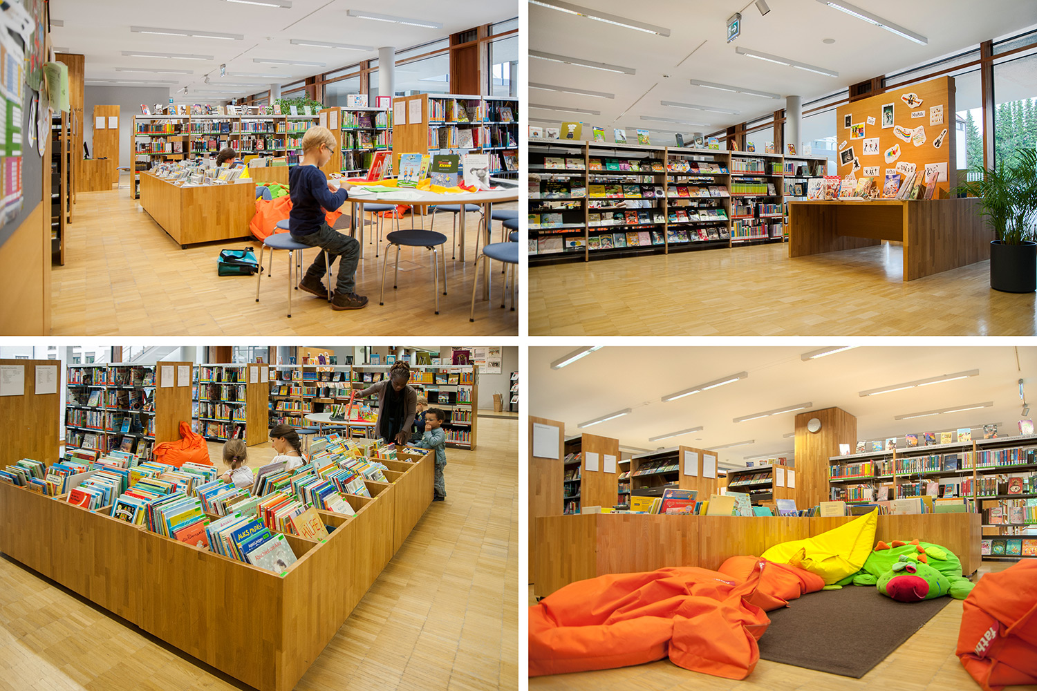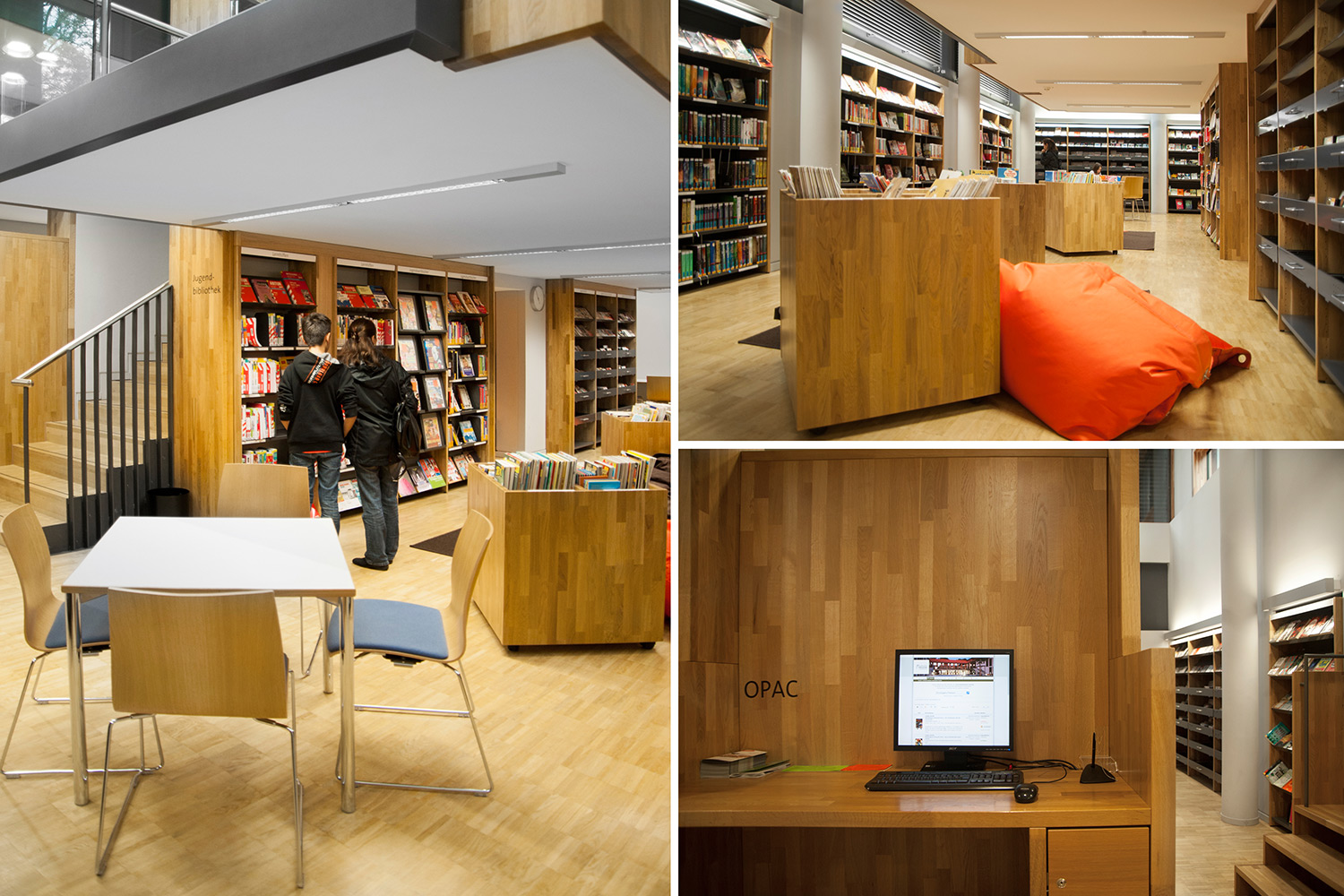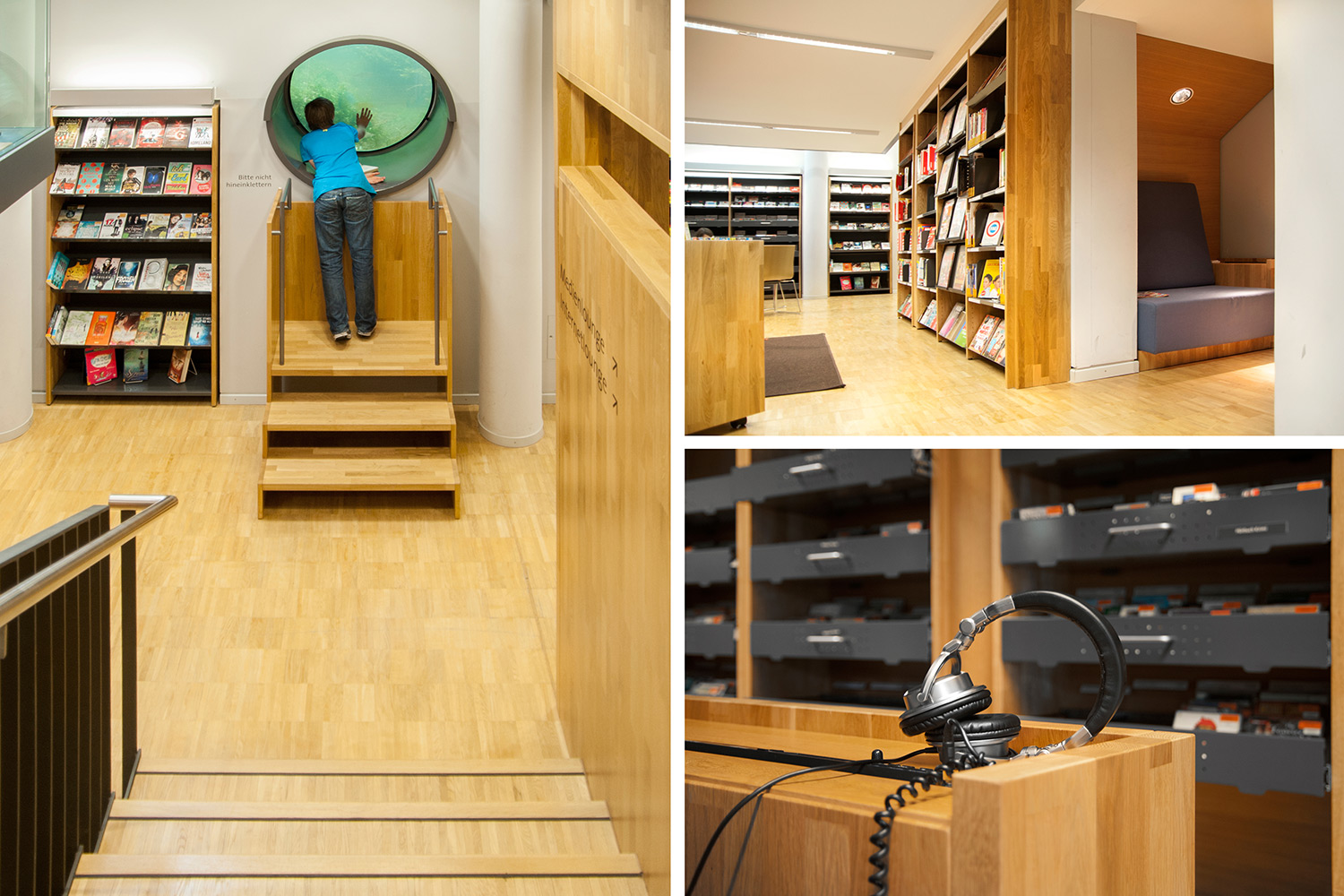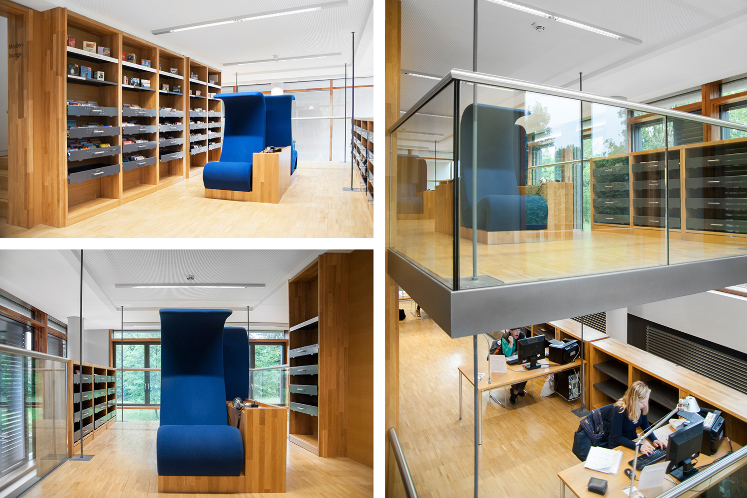 Das Highlight der öffentlichen Bibliothek, einem Neubau auf dem Gelände der traditionellen Seidl-Mühle (Museum) am Seebach, ist das begehbare „Bullauge“. Typisch für die Einrichtung sind die massiven Holzregale RATIO, integriert in eine stabverleimte Eiche-Massivholz-Inneneinrichtung (Schreiner -lösung). Einen weiteren Schwerpunkt bilden die Medien- und Internetlounge mit integrierten Medienwannen und auffälligen Hör-Sesseln in Wasserwellenform.