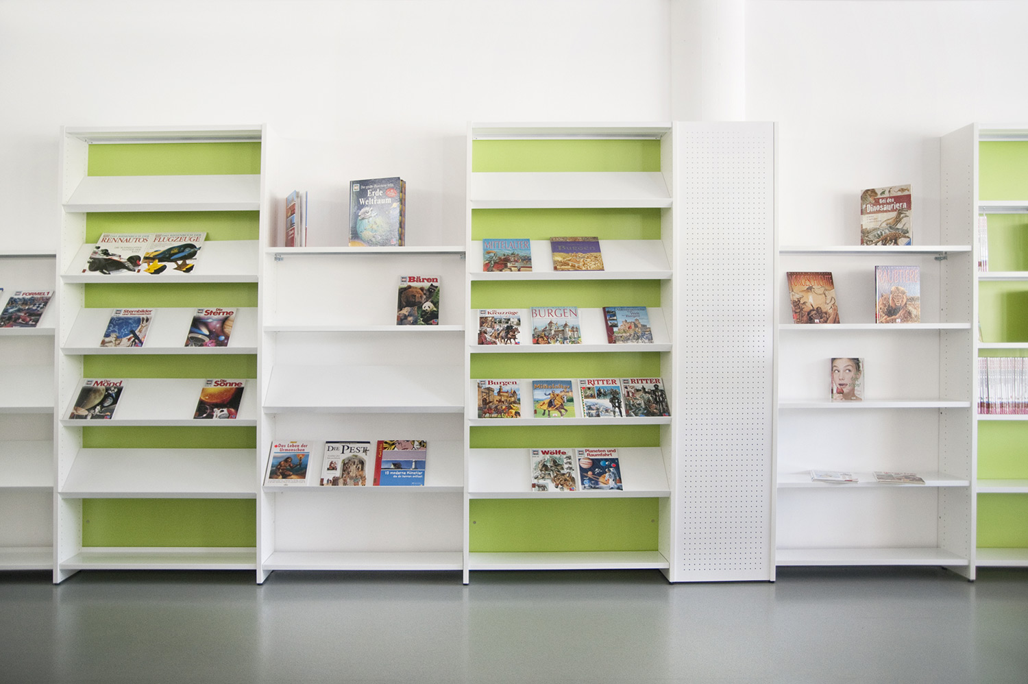 Gelegen in den Randgebieten des schönen Stadtteils Edigheim von Ludwigshafen hat eine kreative und progressive integrierte Gesamtschule Gestalt angenommen. Ihre moderne und multifunktionale Bibliothek ist voller unkonventioneller Ideen. Die grüne und weiße Einrichtung sorgt für eine natürliche und frische Atmosphäre und korreliert mit dem Garten im angrenzenden Hof.
