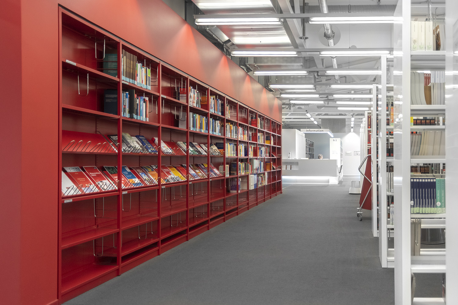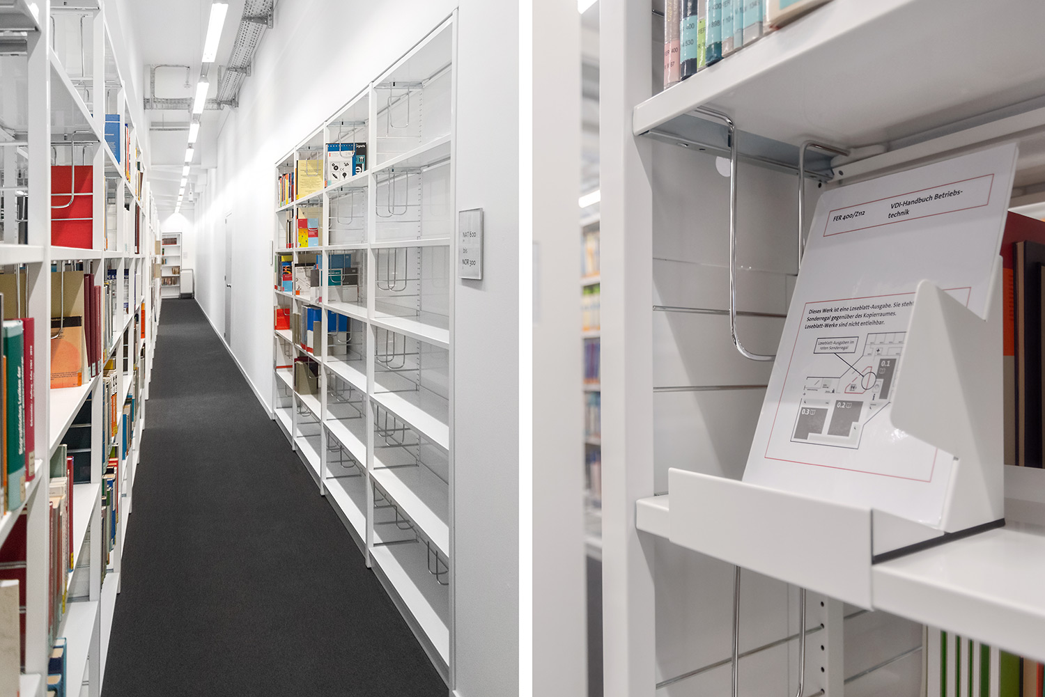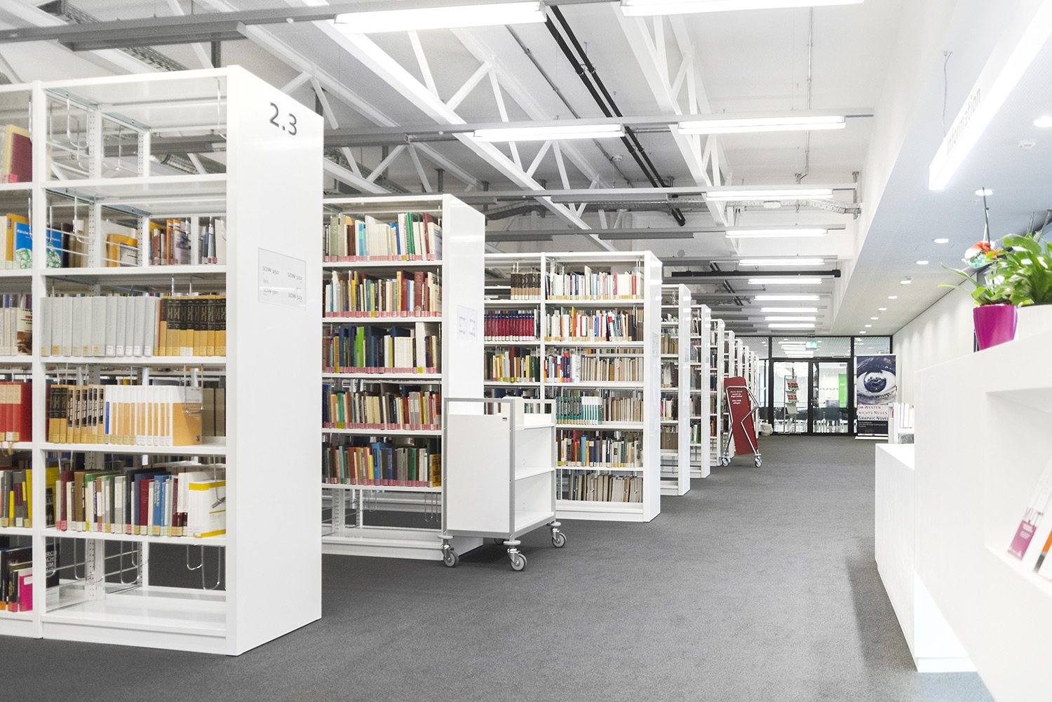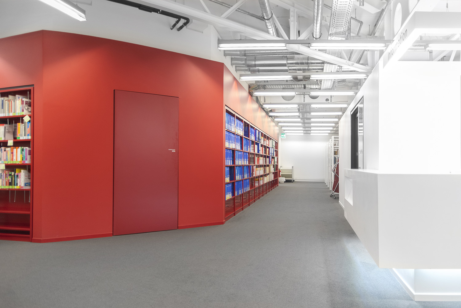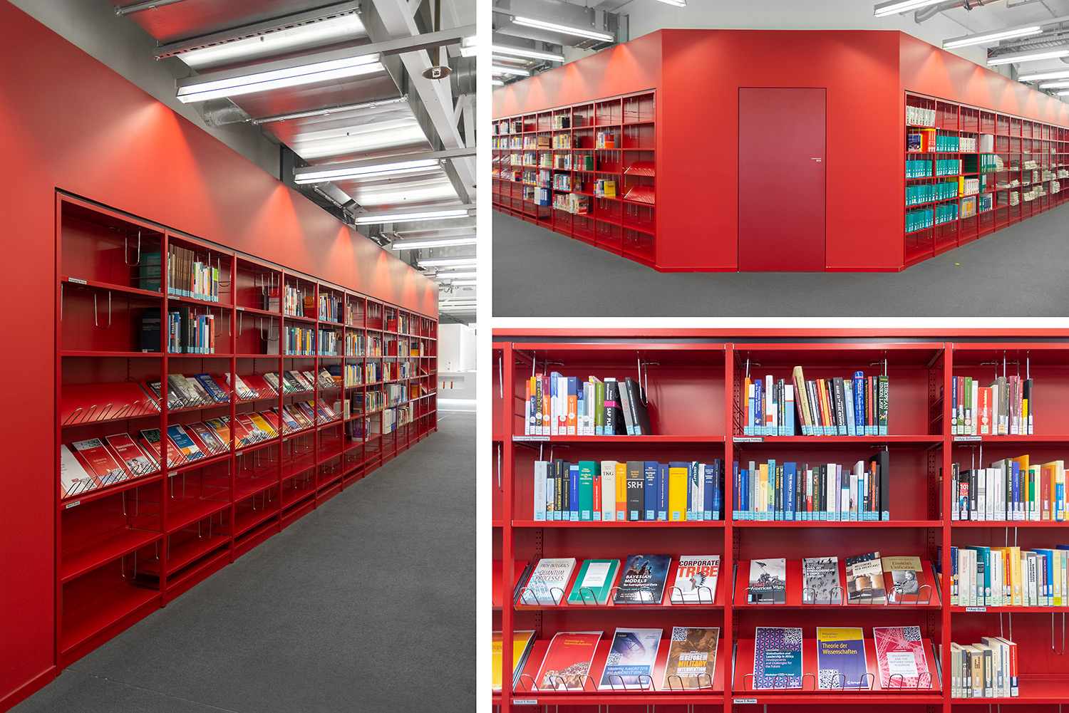 Ein gutes Beispiel dafür, dass hoher technischer Anspruch und schönes Design Hand in Hand gehen können. Wir haben bei diesem beeindruckenden Projekt unser Regalsystem Uniflex eingesetzt. Hierbei wurden die Seitenverkleidungen geschickt mit einer neuen Technik in den Tragrahmen integriert um ein besonders filigranes Erscheinungsbild zu schaffen. Des Weiteren wurde unser Regalsystem in manchen Bereichen in die Wand integriert was eine hohe Fertigungsqualität sowie eine hohe Aufmerksamkeit bei der Installation erfordert. Beides hat unser Team hier geschafft. Wenn man heute durch das Gebäude geht, überzeugt die geschickte Kombination von Farbe, Licht und Material und schafft eine inspirierende Atmosphäre.