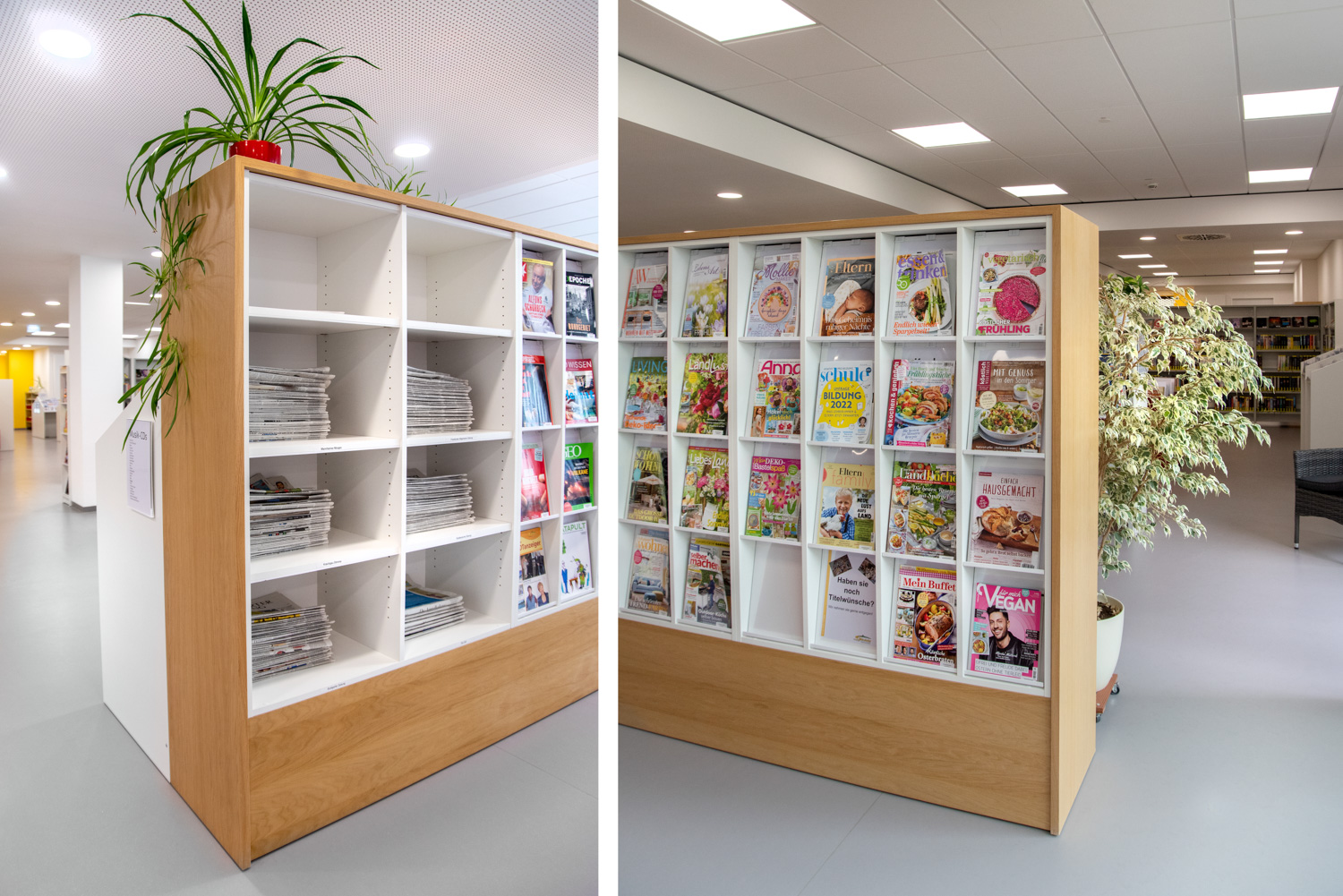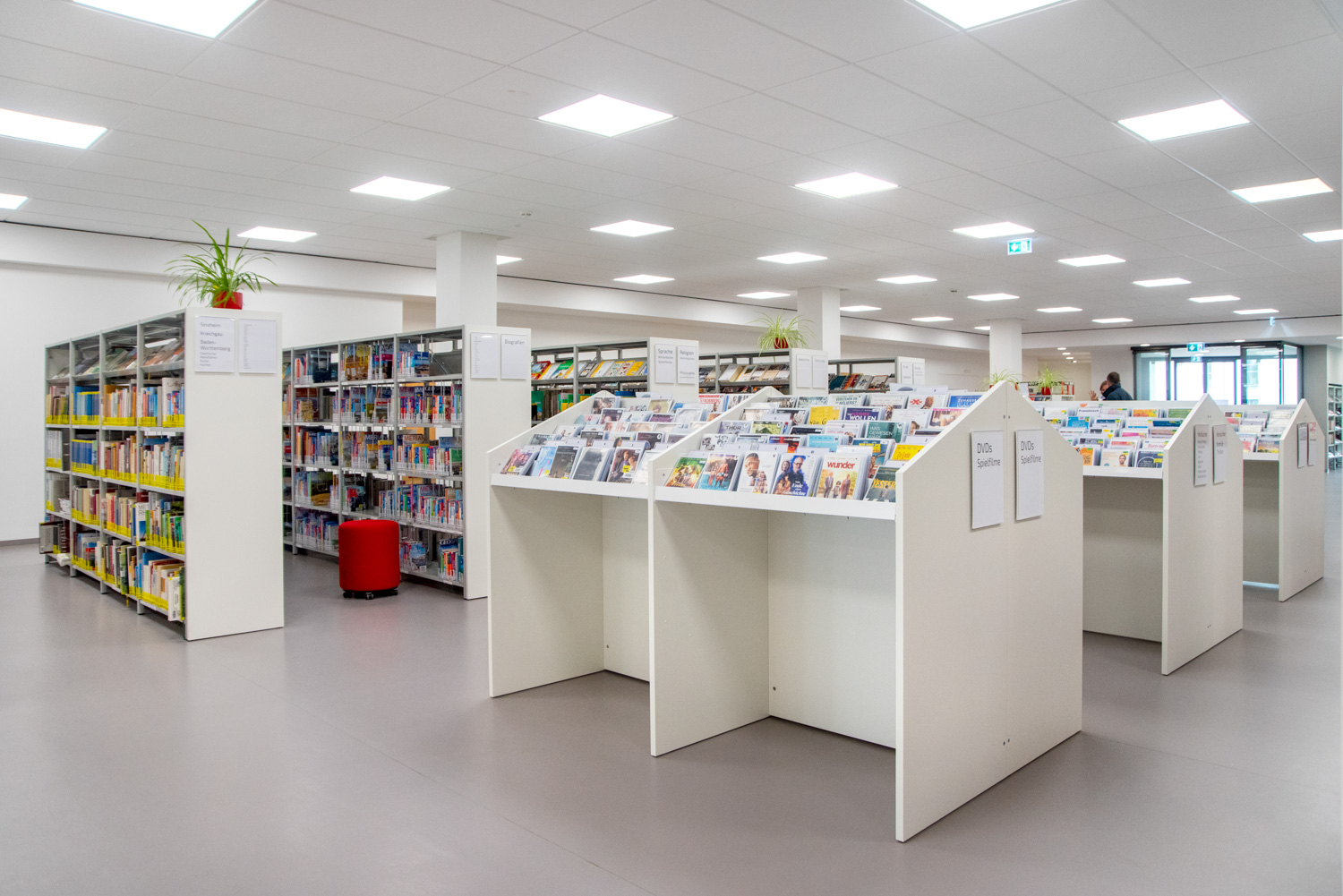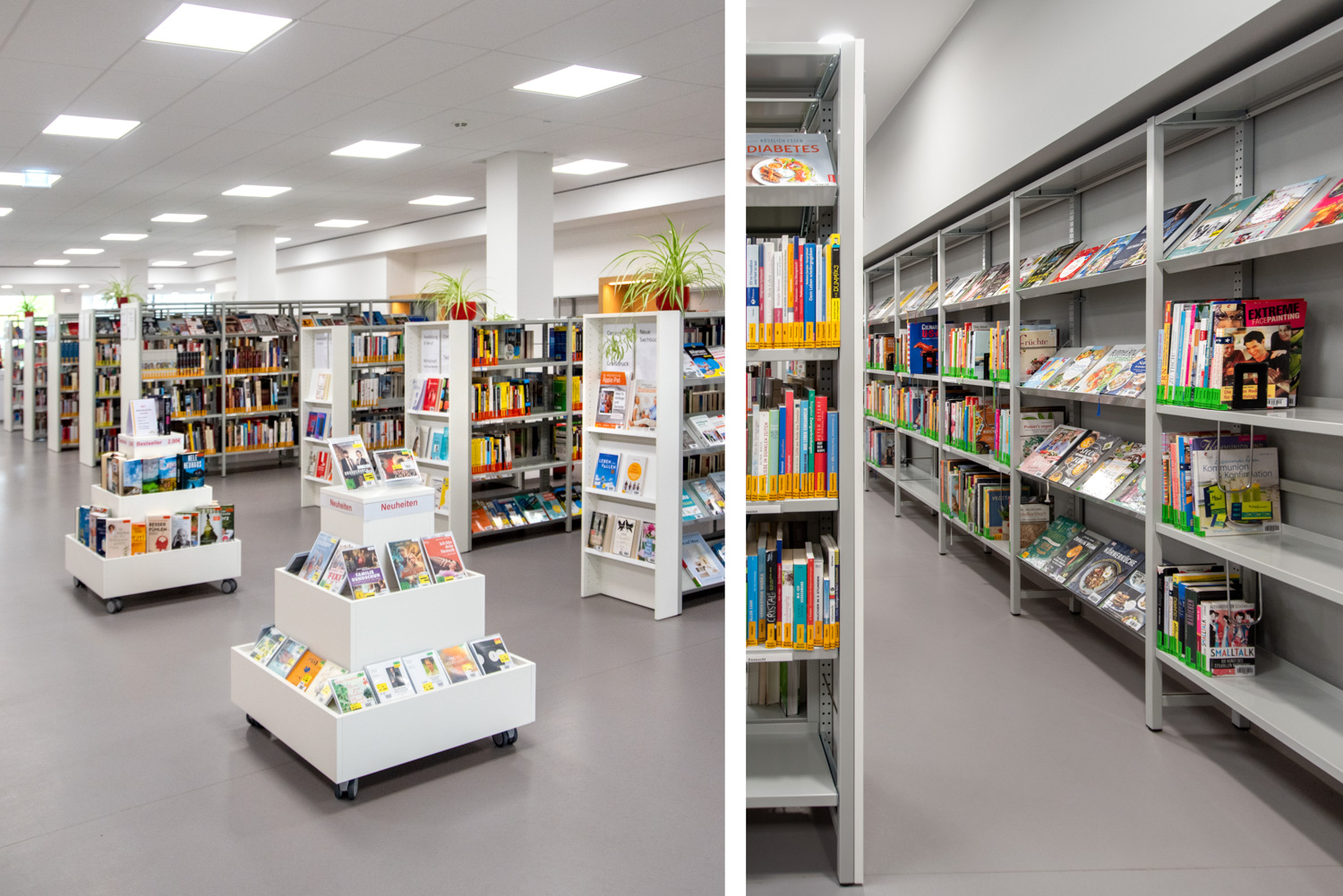 In der Bibliothek Sinsheim wurden alle Metallregale überarbeitet. Gleichzeitig wurden der Bibliothek neue Möbel hinzugefügt , z.B. das Wow!, die Show it Pyramide und der Inform-Tisch, um der Bibliothek einen frischen neuen Touch zu verleihen.