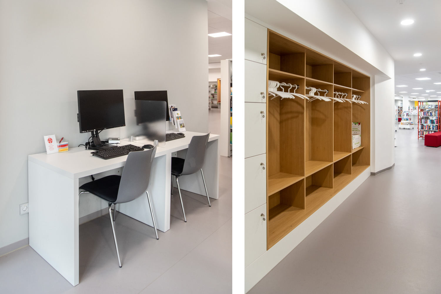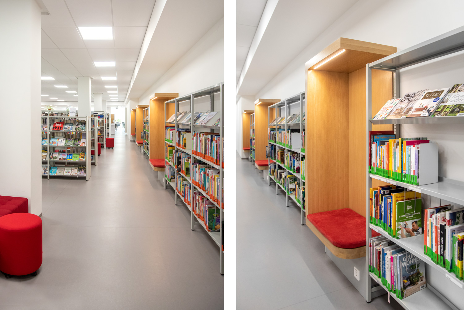 Durch die Wiederverwendung bestehender Regale hat die Bibliothek Vorteile erzielt, die in Kombination mit neuen Bibliotheksmöbeln einen Mehrwert geschaffen haben, der jeden Tag zu einem unterhaltsamen Erlebnis für alle Beteiligten macht.