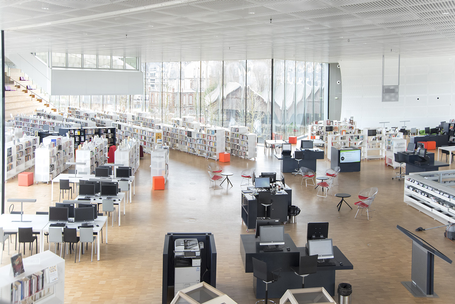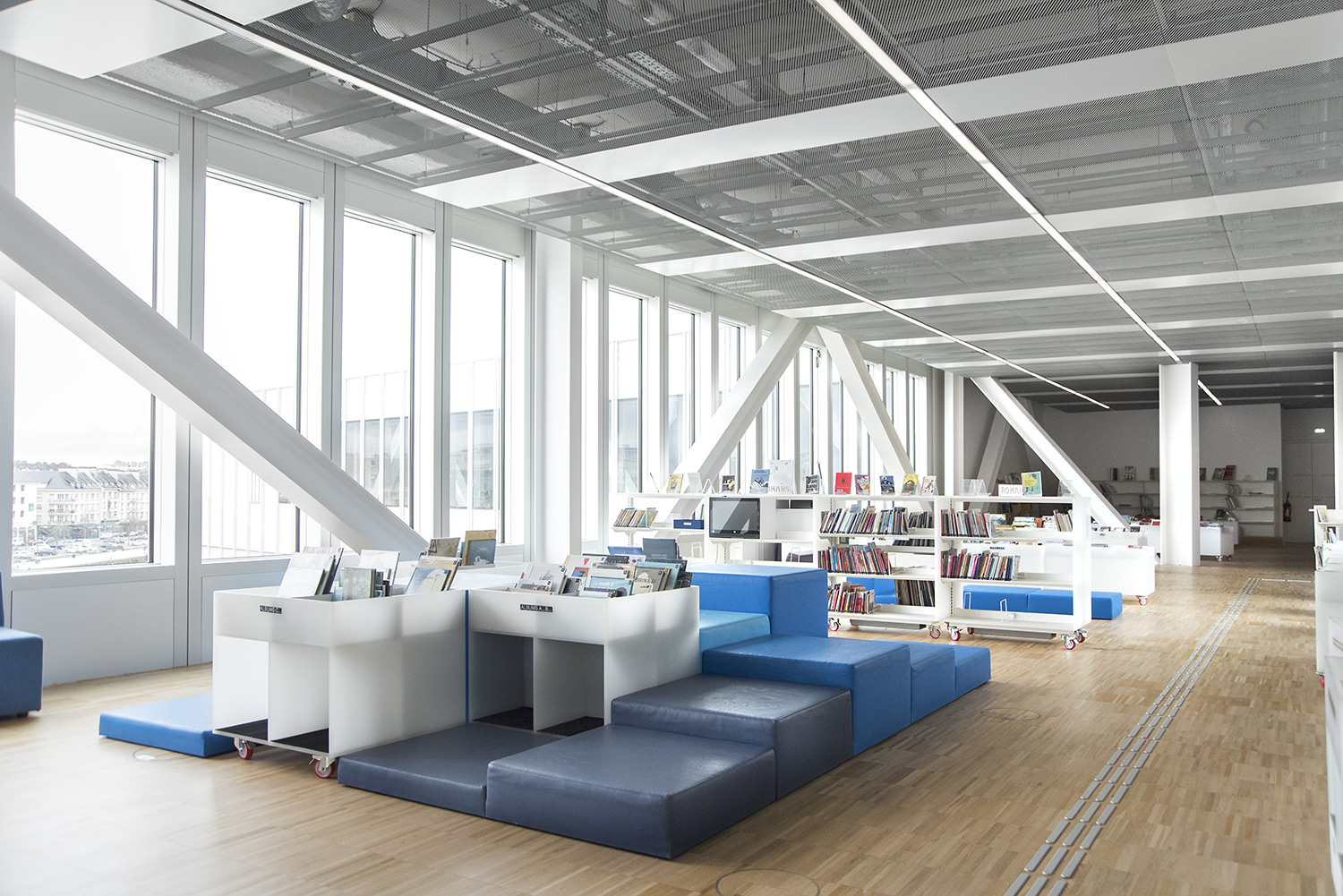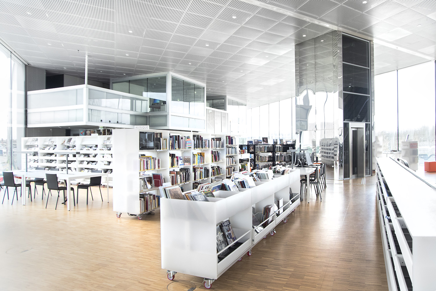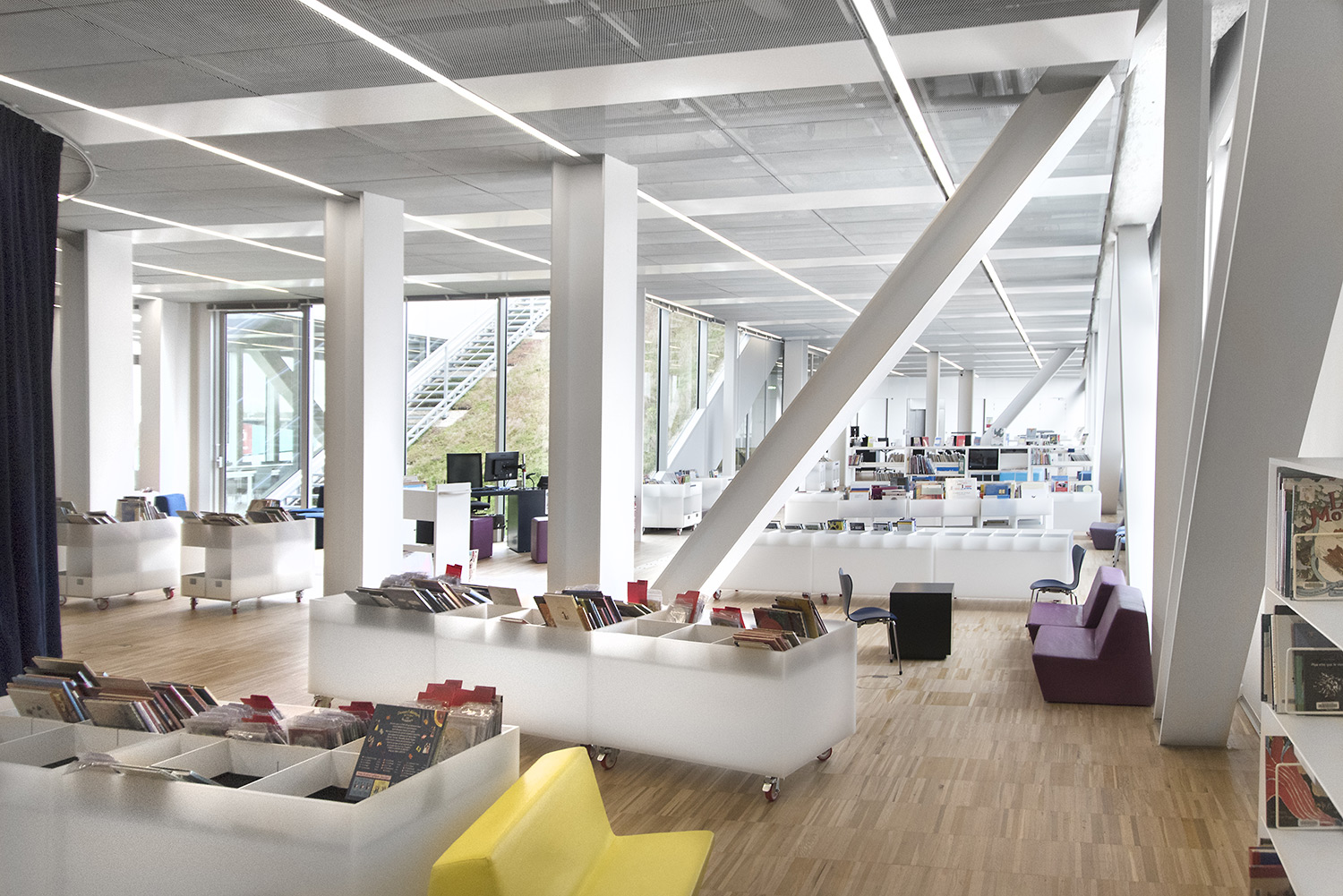 In der kreuzförmigen Bibliothek sind 4 Abteilungen untergebracht: Kunst im Ostflügel, Sozialwissenschaften im Süden, Literatur im Westen und Wissenschaft und Technik im Norden. Darüber hinaus bietet sie neue Leistungen an wie einen Hörsaal, Ausstellungsflächen, ein Café/Restaurant und vieles mehr.