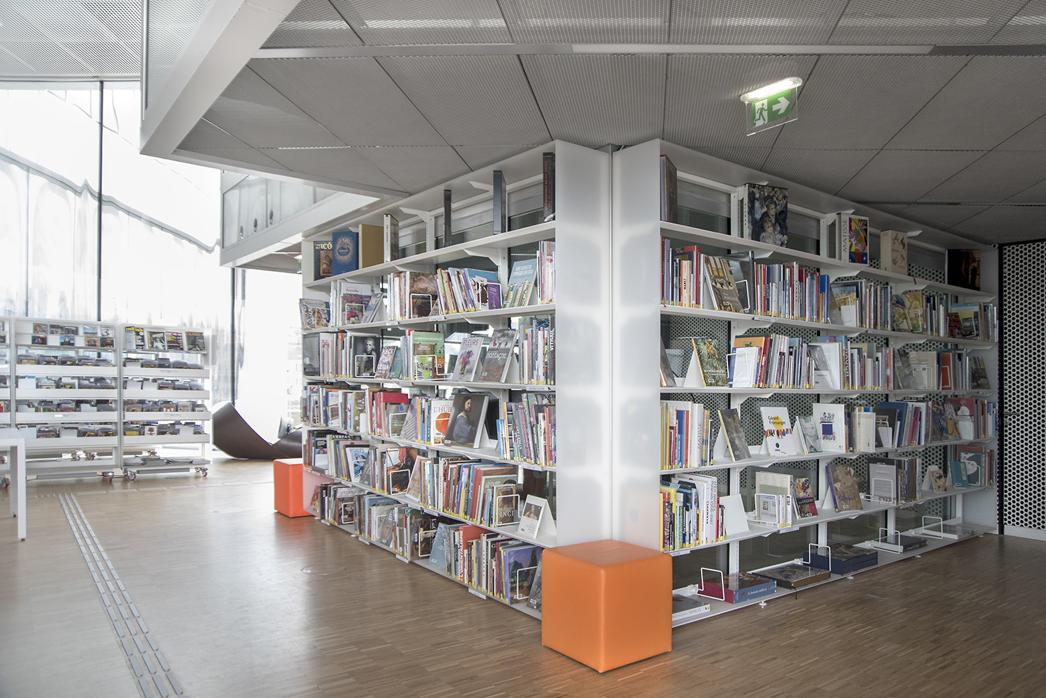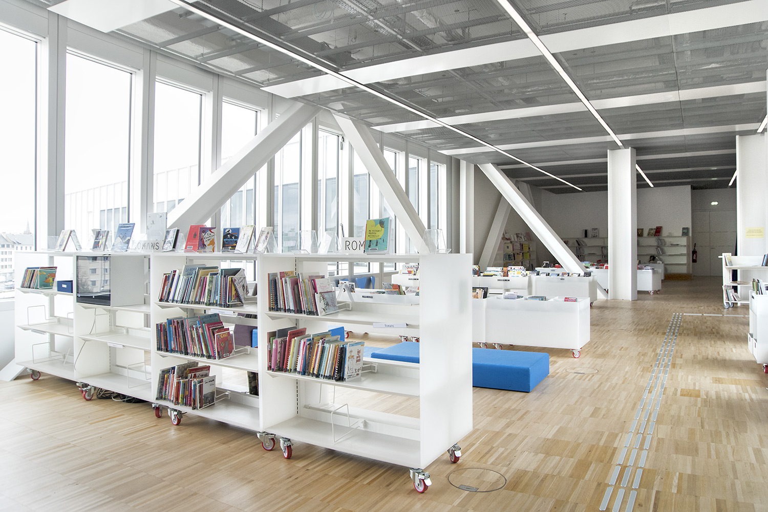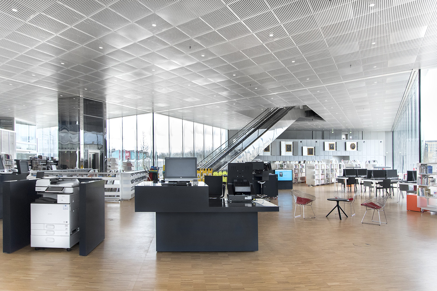 In der kreuzförmigen Bibliothek sind 4 Abteilungen untergebracht: Kunst im Ostflügel, Sozialwissenschaften im Süden, Literatur im Westen und Wissenschaft und Technik im Norden. Darüber hinaus bietet sie neue Leistungen an wie einen Hörsaal, Ausstellungsflächen, ein Café/Restaurant und vieles mehr.