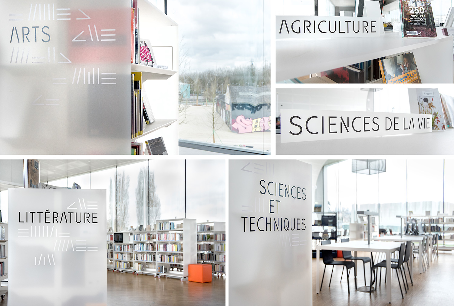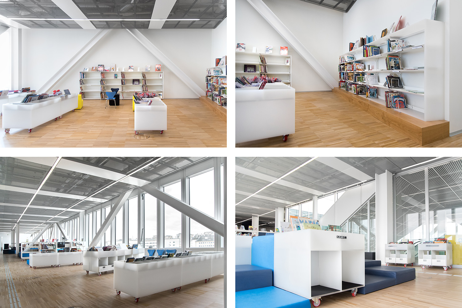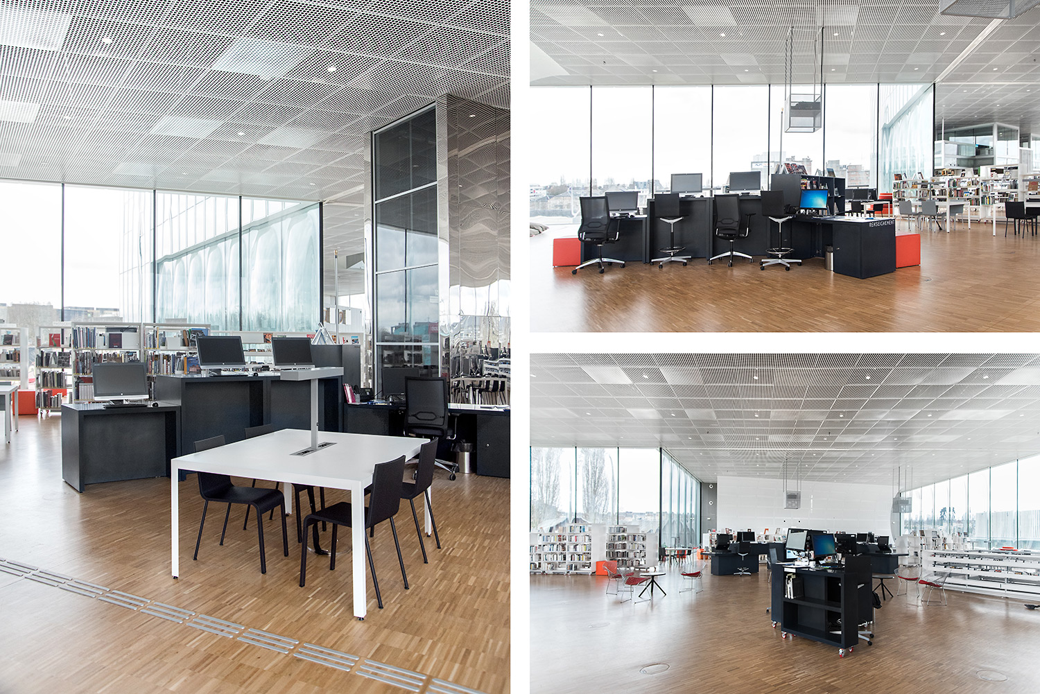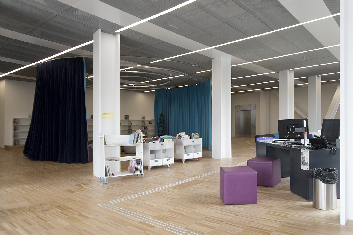 In der kreuzförmigen Bibliothek sind 4 Abteilungen untergebracht: Kunst im Ostflügel, Sozialwissenschaften im Süden, Literatur im Westen und Wissenschaft und Technik im Norden. Darüber hinaus bietet sie neue Leistungen an wie einen Hörsaal, Ausstellungsflächen, ein Café/Restaurant und vieles mehr.