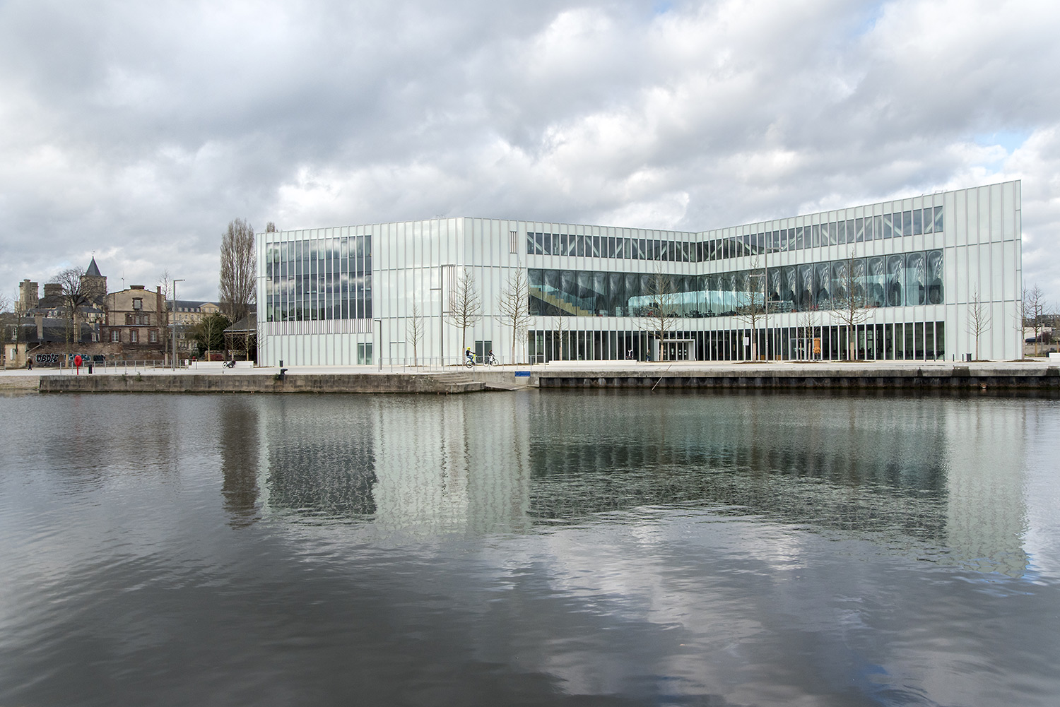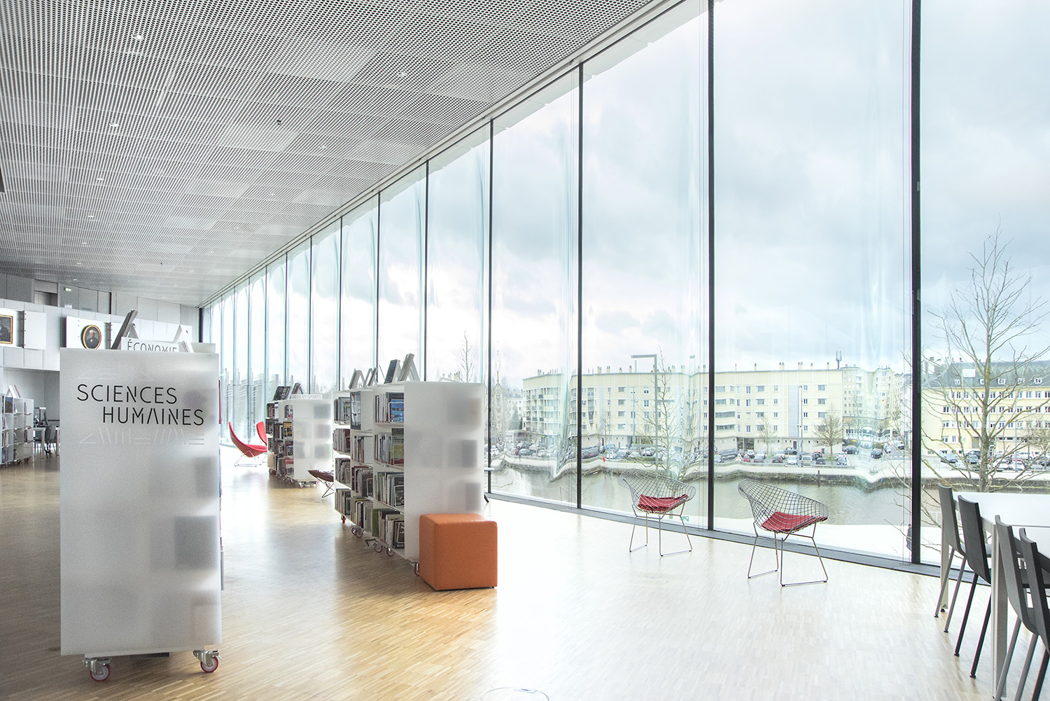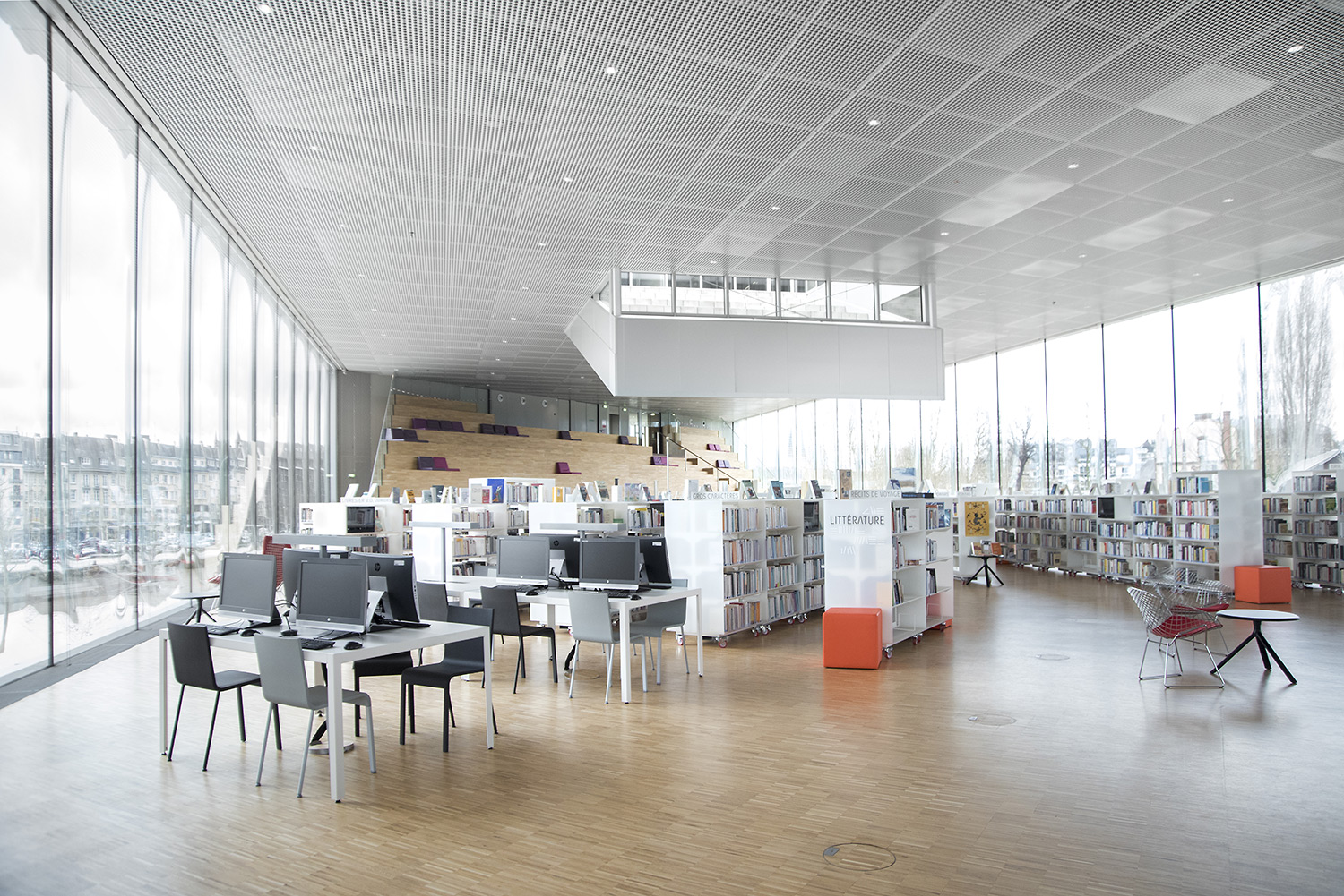 Die Bibliothek hat eine Gesamtfläche von 12.000 m², verteilt über 4 Ebenen und ist mit Blick auf den Saint-Pierre-See in Caen gelegen. Offen von Ost nach West ist das Gebäude dank seiner völlig transparenten und unverbauten horizontalen Durchlässigkeit von natürlichem Licht durchflutet. Es soll die Eigenschaften eines Stadtforums haben.