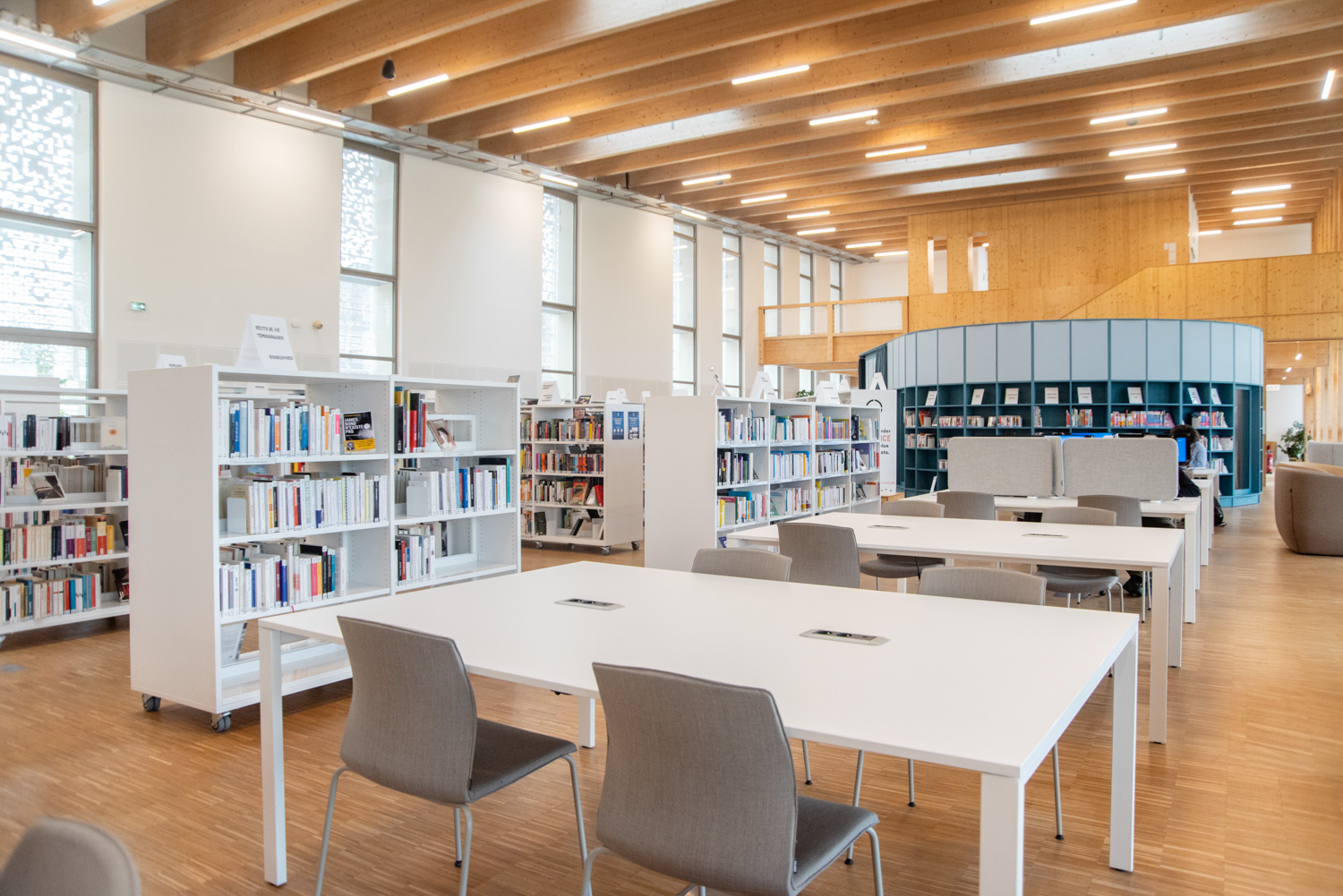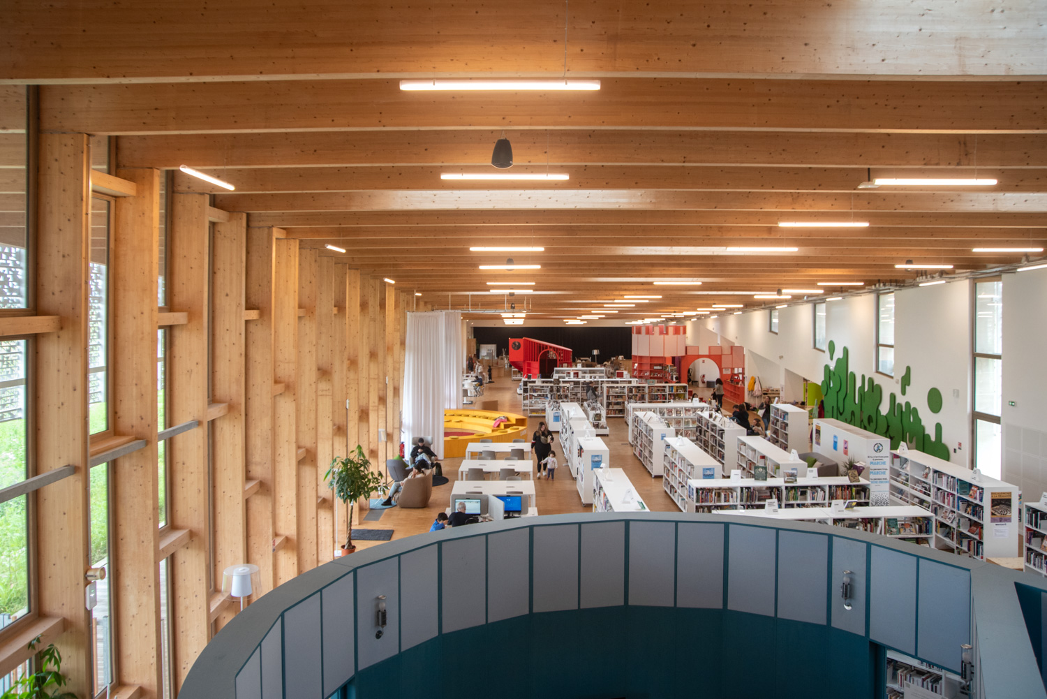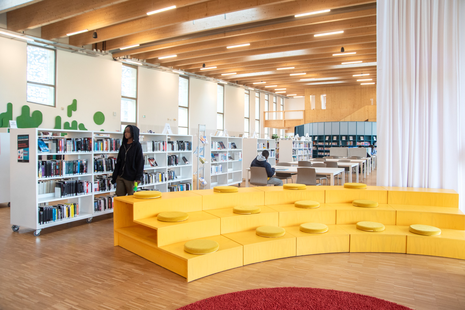 Die Inneneinrichtung der Bibliothek besteht aus Möbeln in hellen, neutralen Farbtönen, die eine ruhige Atmosphäre schaffen, die Bücher hervorheben und gleichzeitig die Holzstrukturen des Gebäudes ergänzen. Diese werden durch farbenfrohe, maßgeschneiderte Elemente ergänzt, die den Raum beleben und die verschiedenen Bereiche klar voneinander abgrenzen.