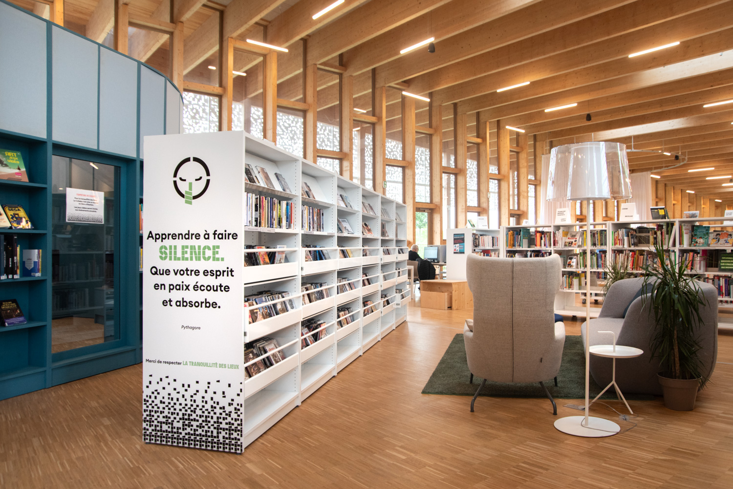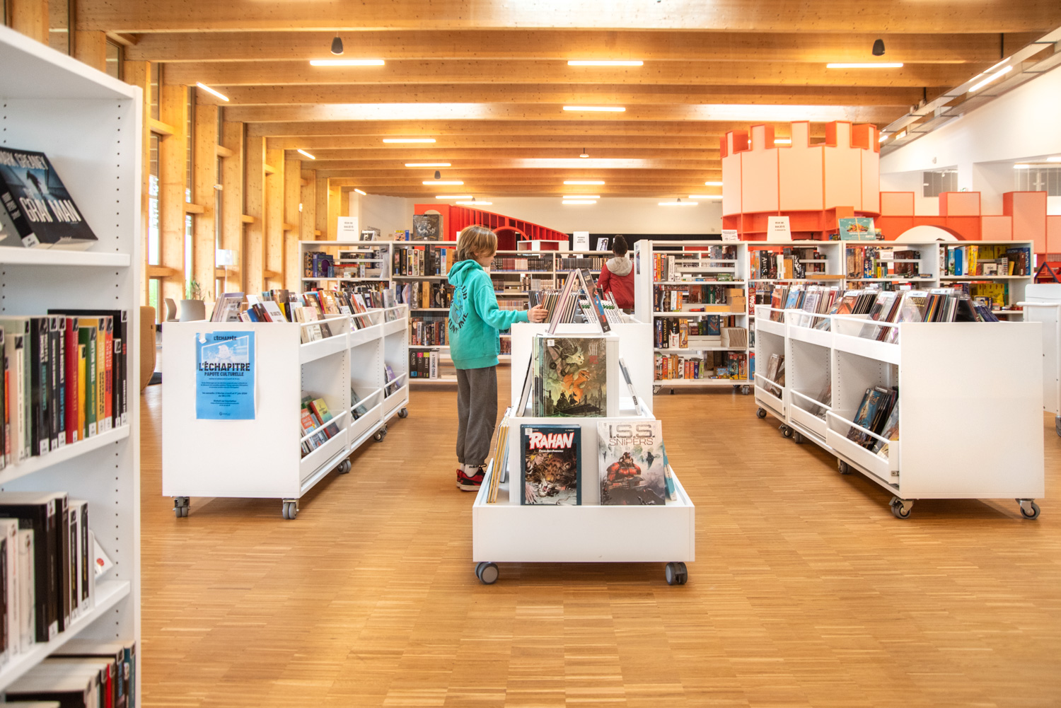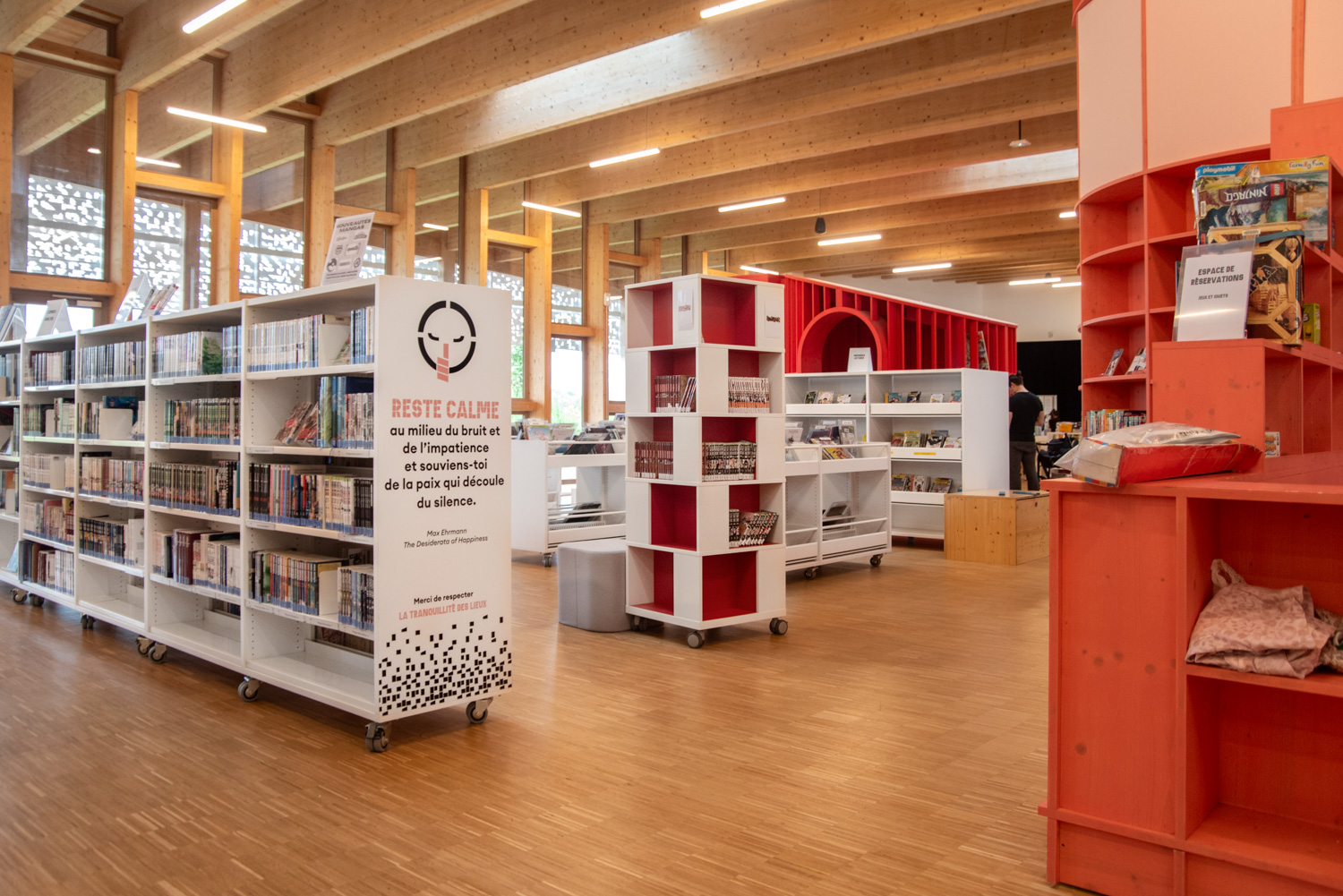 Die Inneneinrichtung der Bibliothek besteht aus Möbeln in hellen, neutralen Farbtönen, die eine ruhige Atmosphäre schaffen, die Bücher hervorheben und gleichzeitig die Holzstrukturen des Gebäudes ergänzen. Diese werden durch farbenfrohe, maßgeschneiderte Elemente ergänzt, die den Raum beleben und die verschiedenen Bereiche klar voneinander abgrenzen.
