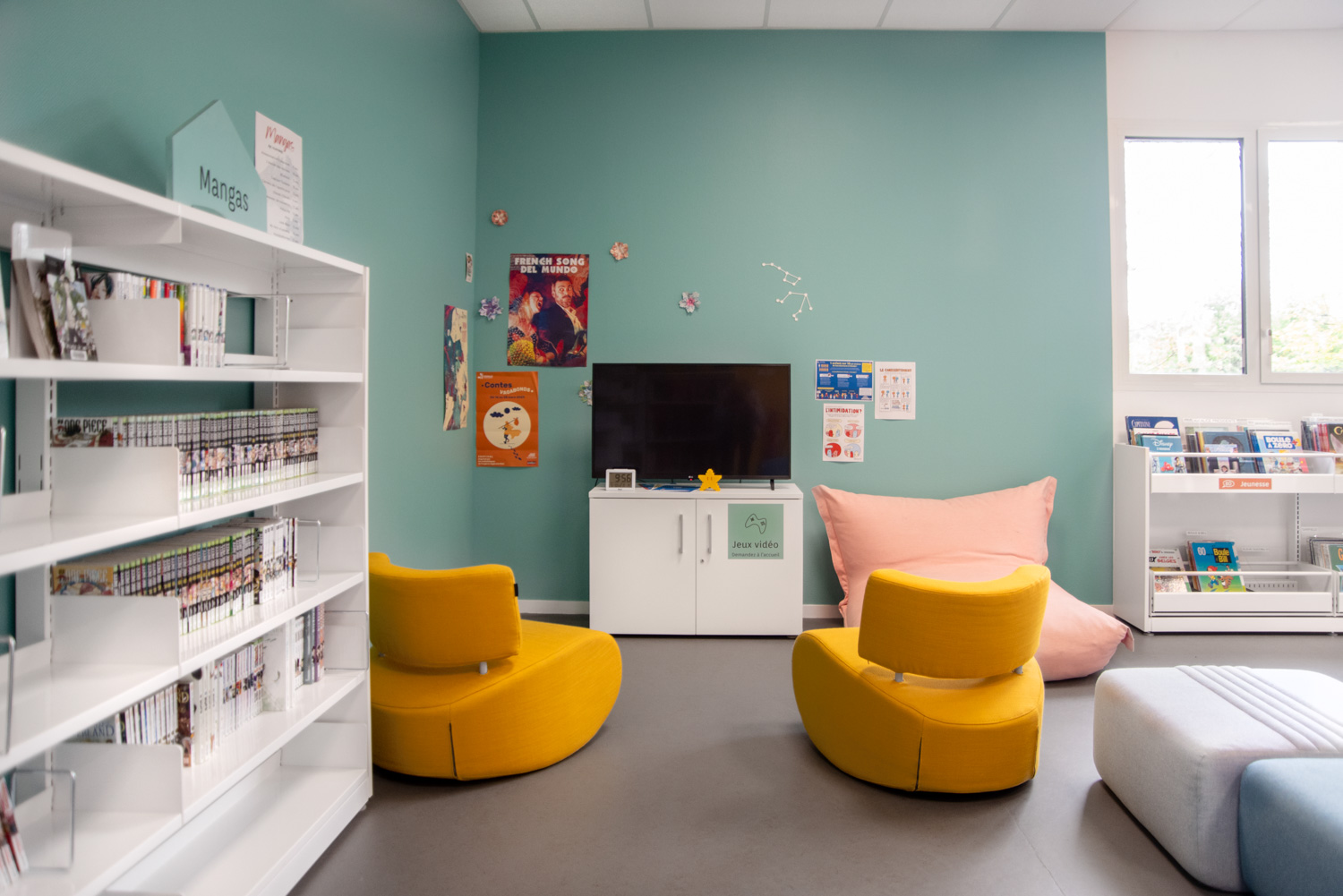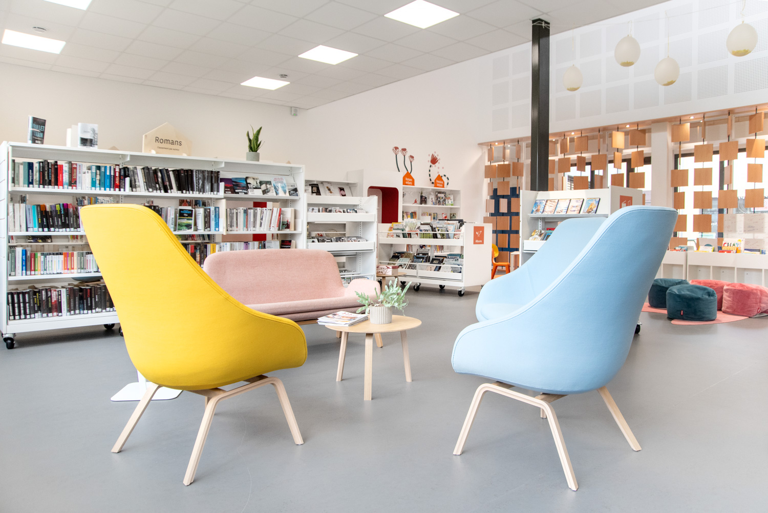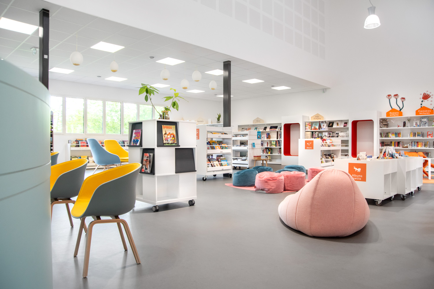 Es gibt originelle Sitzgelegenheiten, einen vertikalen Cocoon und Poufs für zurückgezogenes oder entspanntes Lesen.
