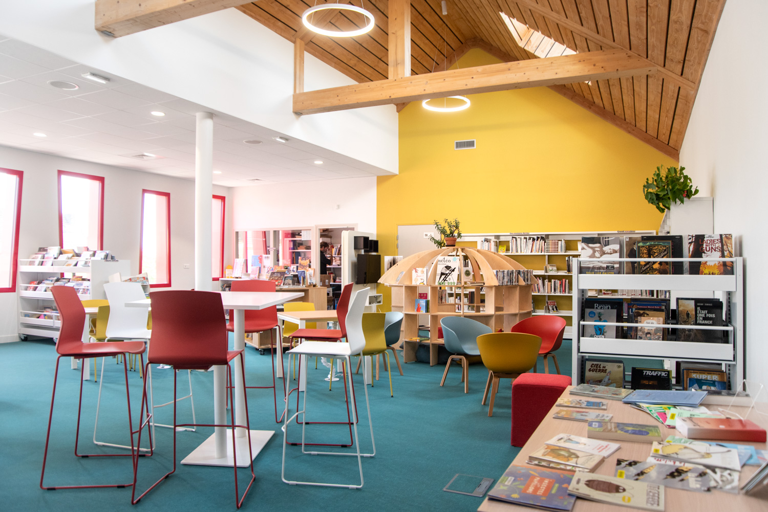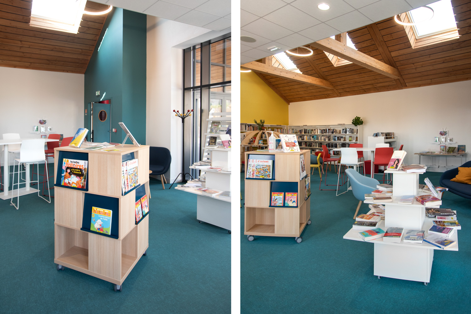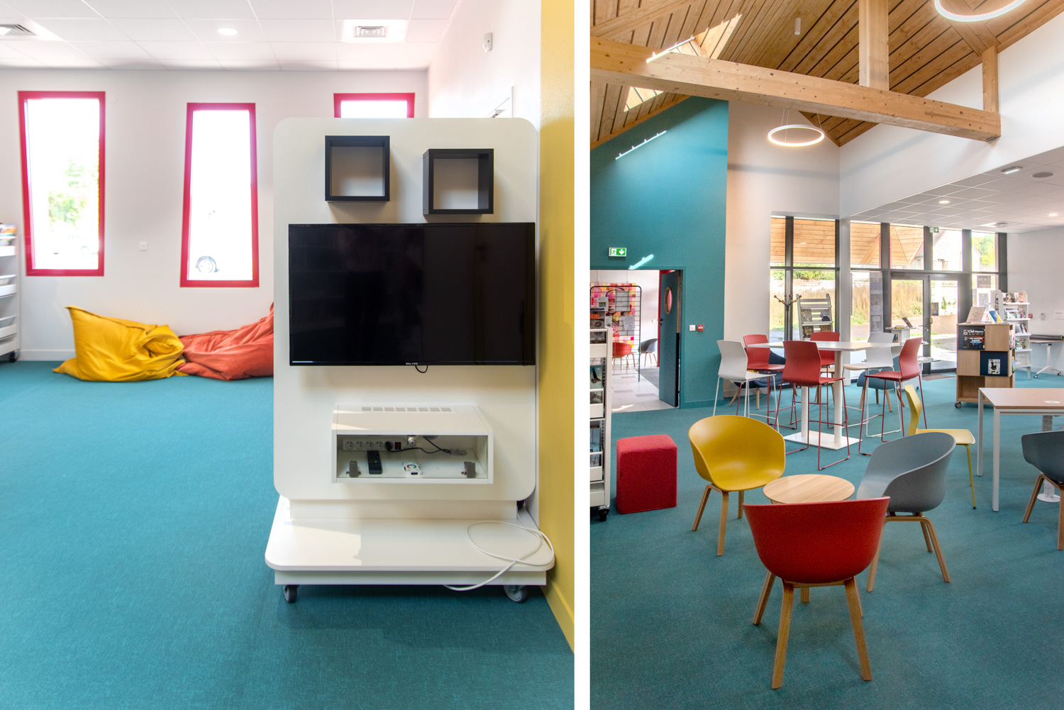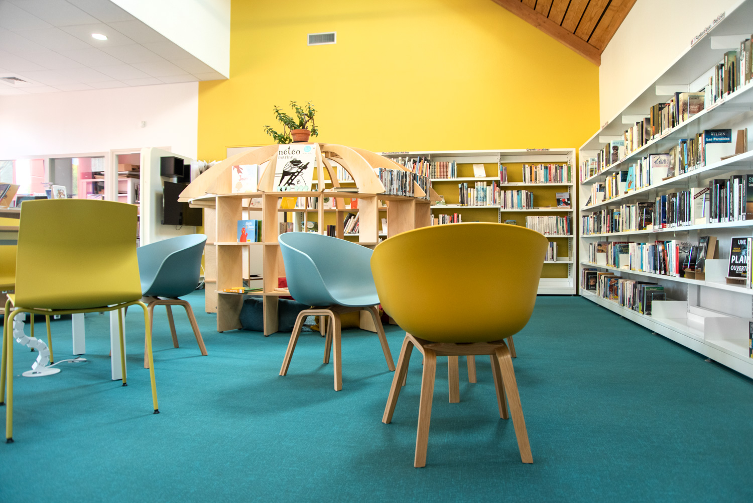 Das Layout dieser Mediathek ist das Ergebnis einer echten Zusammenarbeit mit dem Architekten, der Gemeinde, dem Bibliothekar und dem Team von BC Intérieur bei der Auswahl der Möbel, Farben und Stoffe. Es ist uns gelungen, an einem relativ kleinen Ort (100 m²) einen Raum zu schaffen, der jedem Publikum gewidmet ist: Die Holzhütte ist die Zuflucht der Kleinen, das Sofa lädt Eltern ein, ihren Kindern eine Geschichte vorzulesen, die hohe Bar ist der ideale Ort, an dem sich alle gerne treffen, um zu spielen, verbundene Tische zur Arbeit, dicke Jungs zum Einrollen, kleine bequeme Sessel, um Kaffee zu trinken, während sie ihre Zeitschrift lesen... man fühlt sich dort sehr wohl.