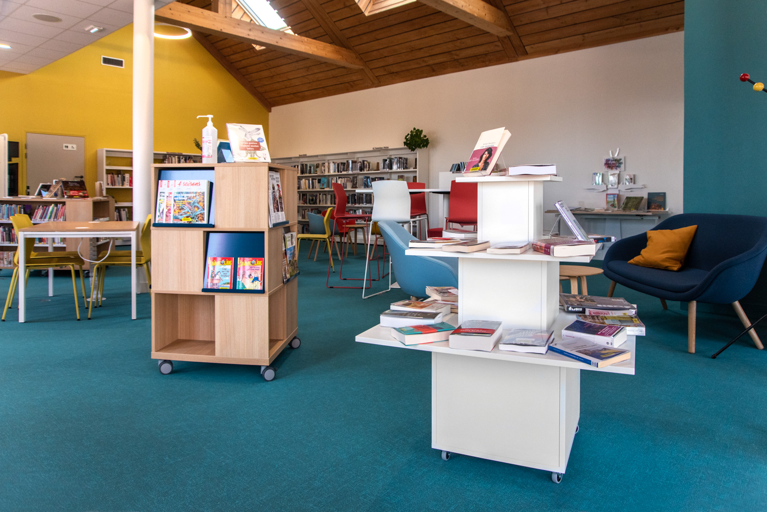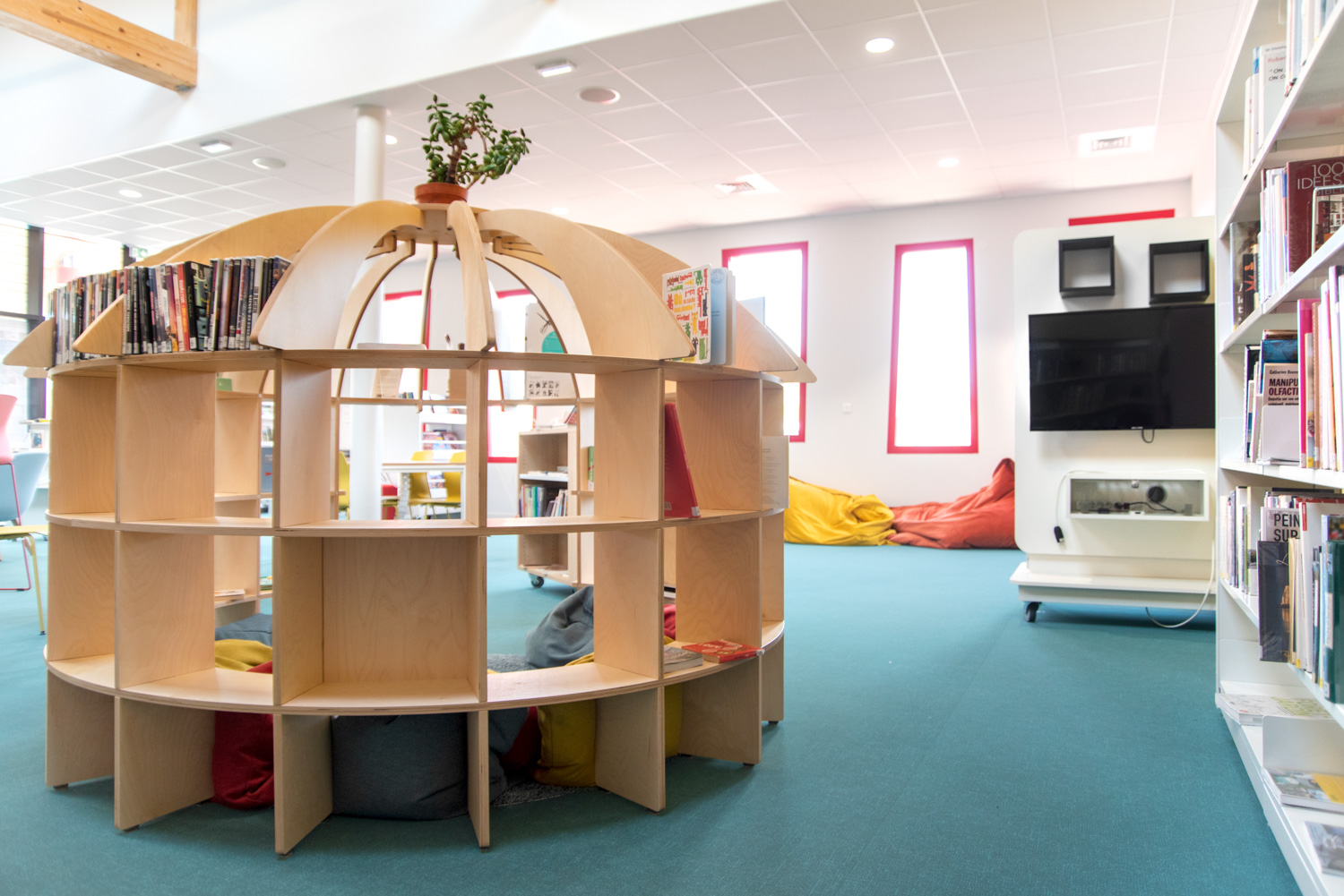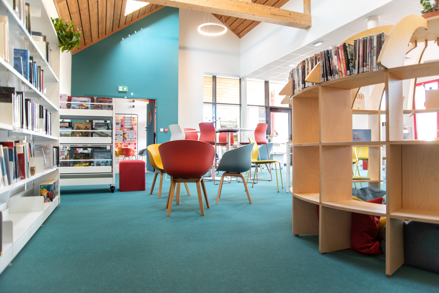 Das Layout dieser Mediathek ist das Ergebnis einer echten Zusammenarbeit mit dem Architekten, der Gemeinde, dem Bibliothekar und dem Team von BC Intérieur bei der Auswahl der Möbel, Farben und Stoffe. Es ist uns gelungen, an einem relativ kleinen Ort (100 m²) einen Raum zu schaffen, der jedem Publikum gewidmet ist: Die Holzhütte ist die Zuflucht der Kleinen, das Sofa lädt Eltern ein, ihren Kindern eine Geschichte vorzulesen, die hohe Bar ist der ideale Ort, an dem sich alle gerne treffen, um zu spielen, verbundene Tische zur Arbeit, dicke Jungs zum Einrollen, kleine bequeme Sessel, um Kaffee zu trinken, während sie ihre Zeitschrift lesen... man fühlt sich dort sehr wohl.