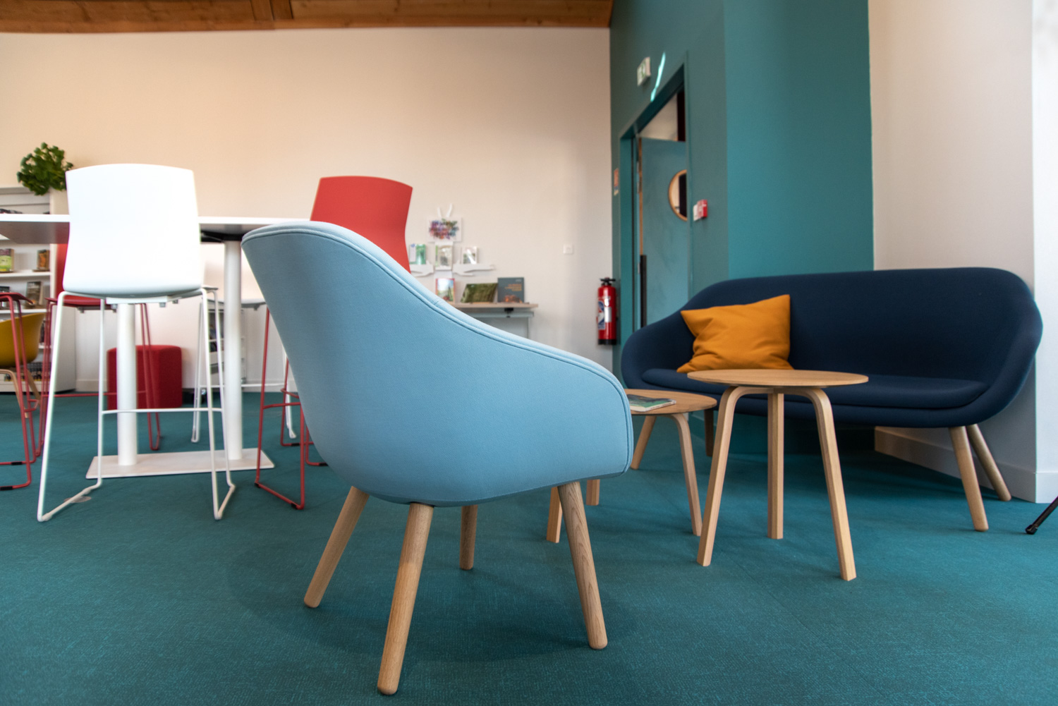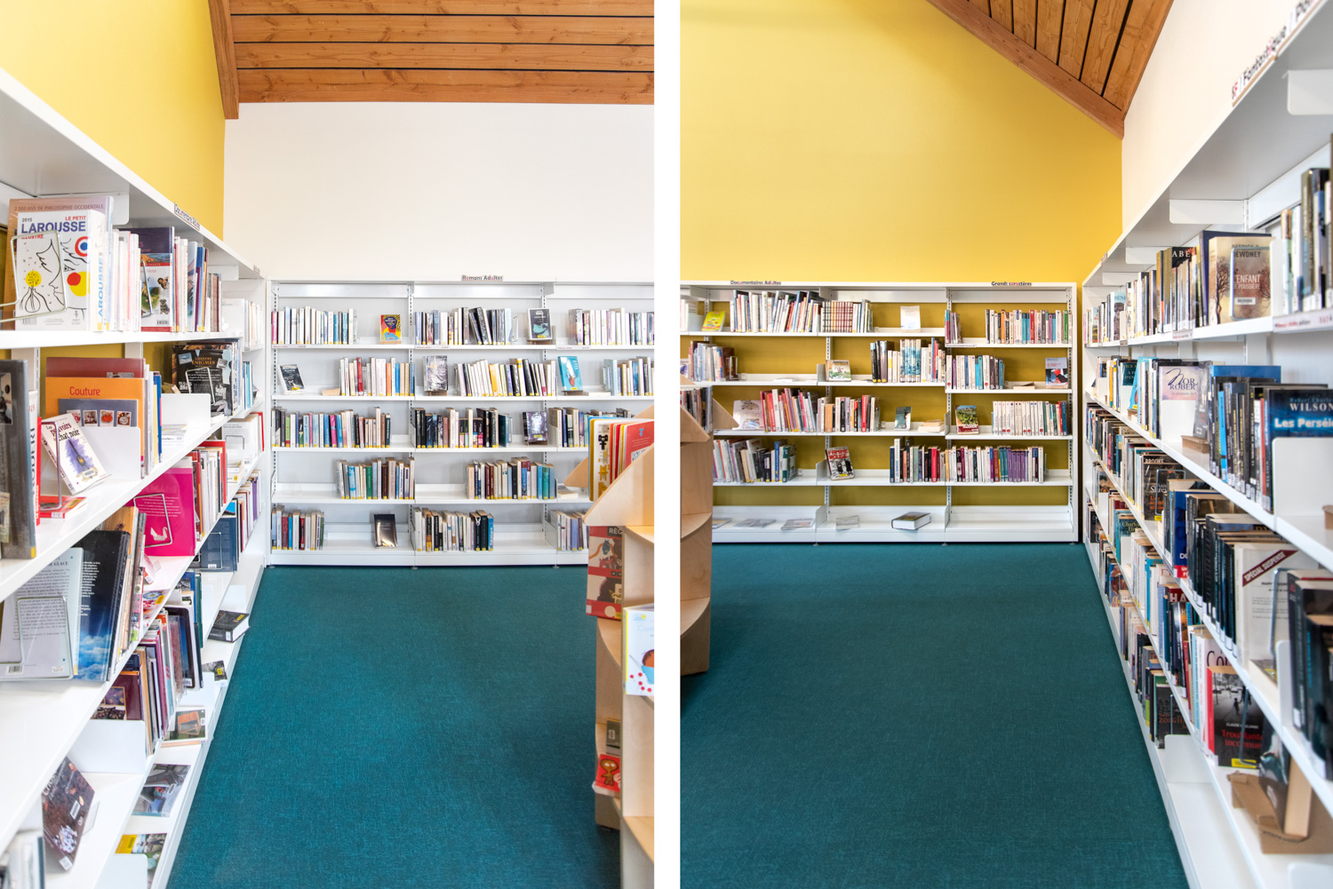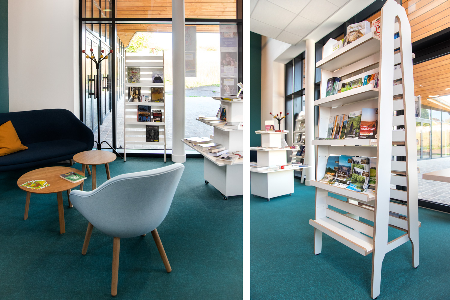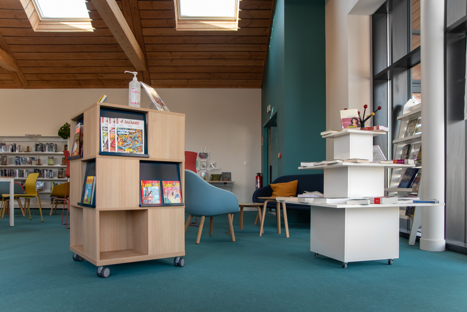 Das Layout dieser Mediathek ist das Ergebnis einer echten Zusammenarbeit mit dem Architekten, der Gemeinde, dem Bibliothekar und dem Team von BC Intérieur bei der Auswahl der Möbel, Farben und Stoffe. Es ist uns gelungen, an einem relativ kleinen Ort (100 m²) einen Raum zu schaffen, der jedem Publikum gewidmet ist: Die Holzhütte ist die Zuflucht der Kleinen, das Sofa lädt Eltern ein, ihren Kindern eine Geschichte vorzulesen, die hohe Bar ist der ideale Ort, an dem sich alle gerne treffen, um zu spielen, verbundene Tische zur Arbeit, dicke Jungs zum Einrollen, kleine bequeme Sessel, um Kaffee zu trinken, während sie ihre Zeitschrift lesen... man fühlt sich dort sehr wohl.