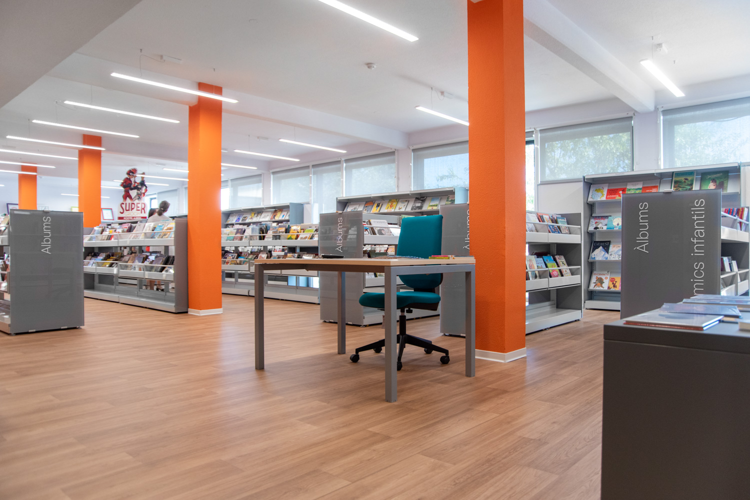 Die alten, renovierten Geschäfte sind heute in vier Bereiche unterteilt; Im Erdgeschoss gibt es einen Jugendbereich und einen Unterhaltungsbereich, im ersten Stock gibt es den Erwachsenenbereich und einen Brettspielbereich. Jeder Bereich zeichnet sich durch eine bestimmte Farbe aus, die für die Beschilderung verwendet wird. In allen Abteilungen ist es möglich, Zugang und Hilfe in der katalanischen Sprache zu erhalten, und es gibt Ressourcen für entfernte Zielgruppen (z. B. Sammlungen mit Großdruck, Brailleschrift und Hörbücher) sowie verschiedene Medientypen (CDs, Vinyls, DVDs usw.).