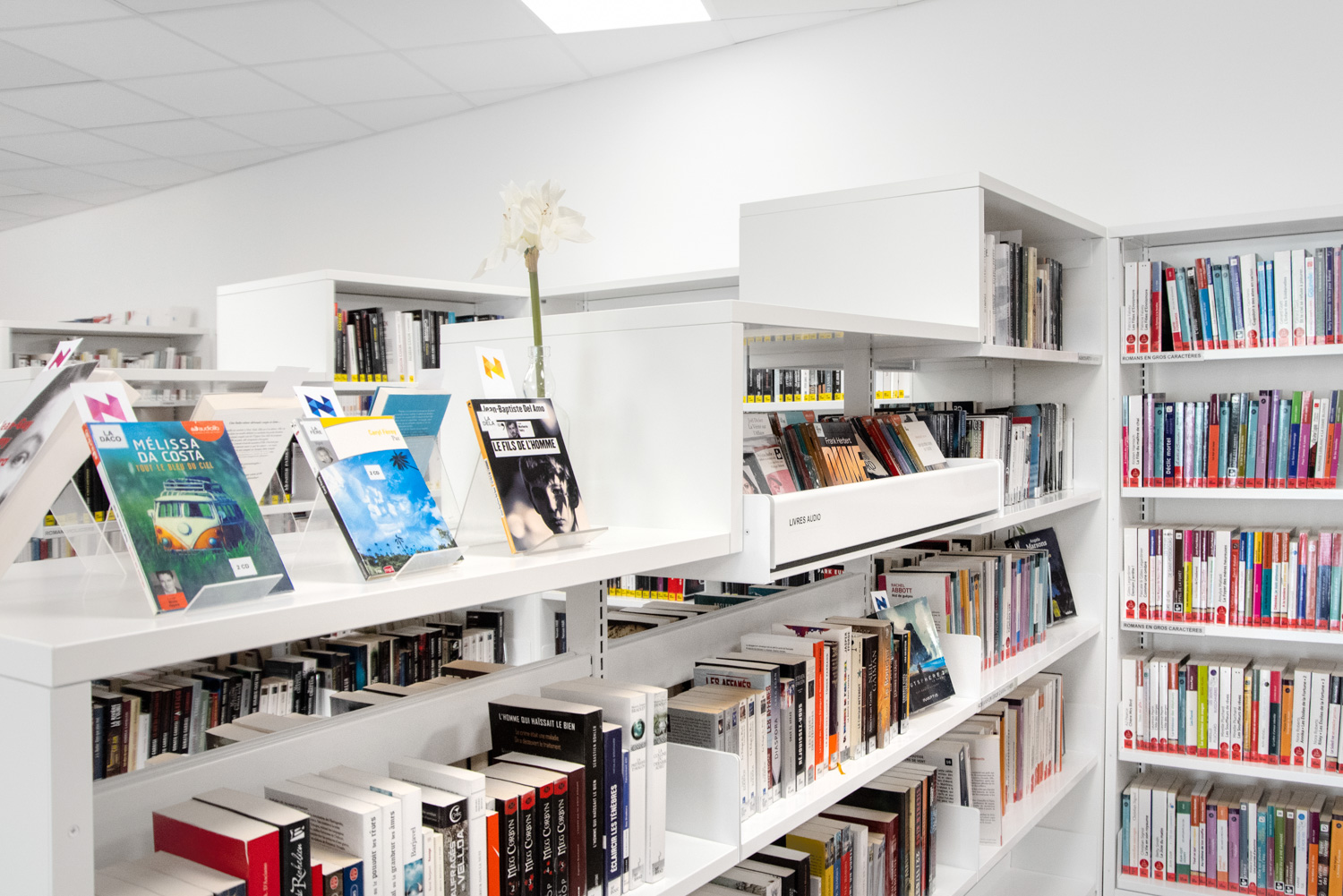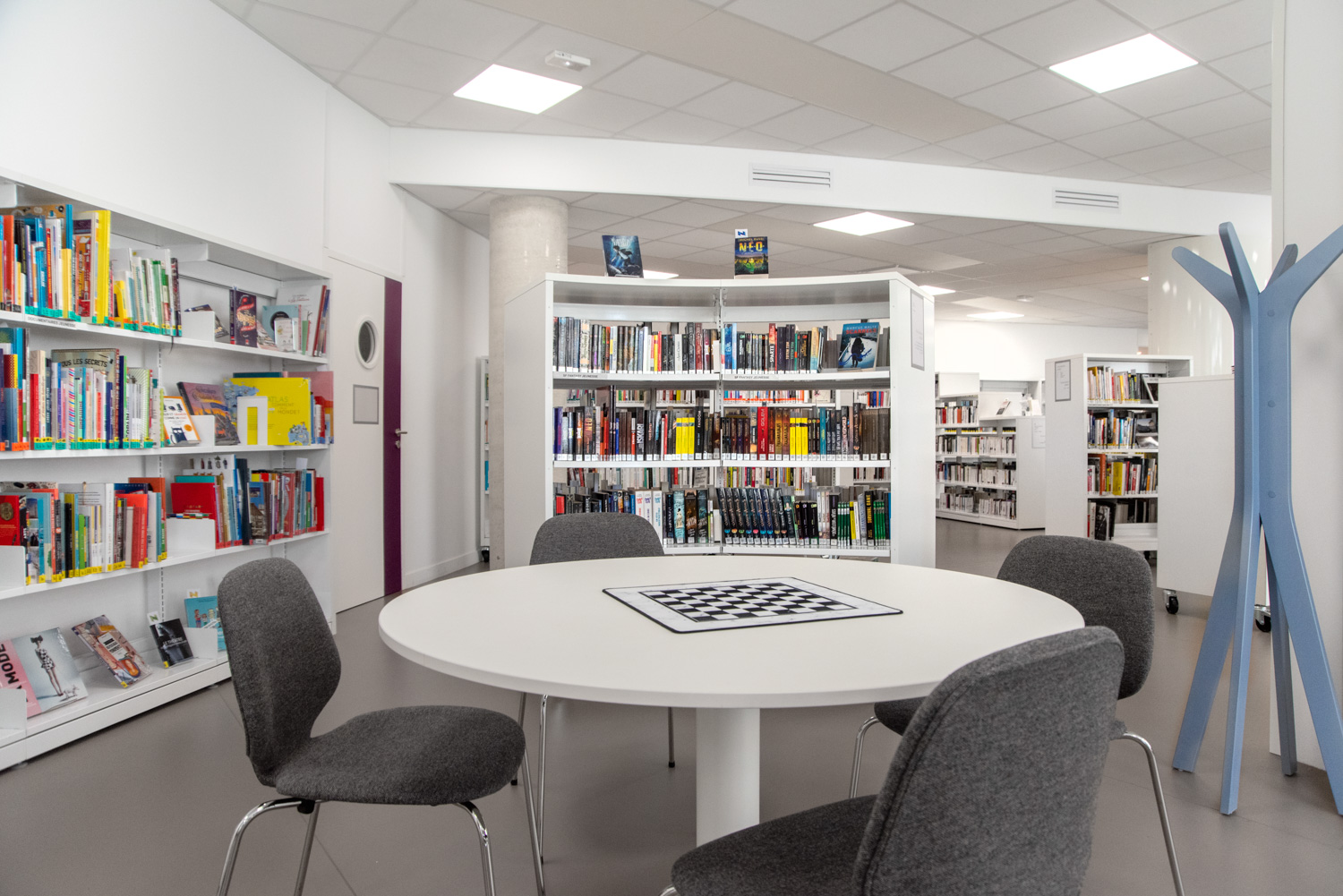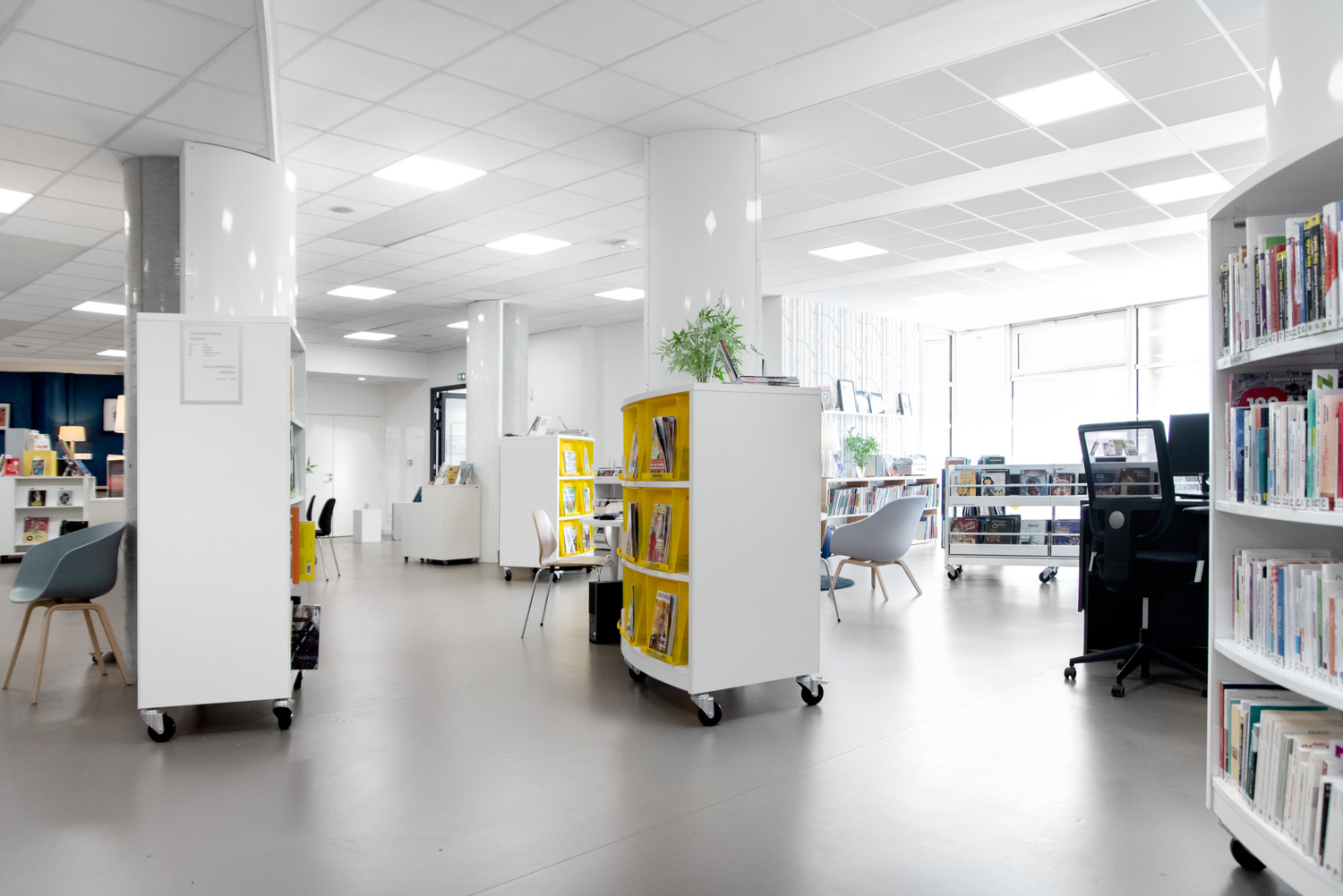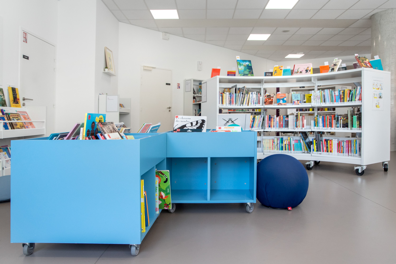 Die Arbeit, die in Zusammenarbeit mit BC Intérieur für die gesamte Innenarchitektur durchgeführt wurde, hat zu einer fröhlichen und flexiblen Bibliothek geführt, mit Räumen, die visuell kohärent und klar differenziert sind! Diese erfolgreiche Zusammenarbeit hat einen kulturellen Raum geschaffen, der die Bürger einlädt, hereinzukommen und Zeit in der Bibliothek zu verbringen, entweder eine Schallplatte in großen Sesseln zu hören, Geschichten oder Comics auf bequemen Hockern zu lesen oder in kleineren Gruppen zu arbeiten.