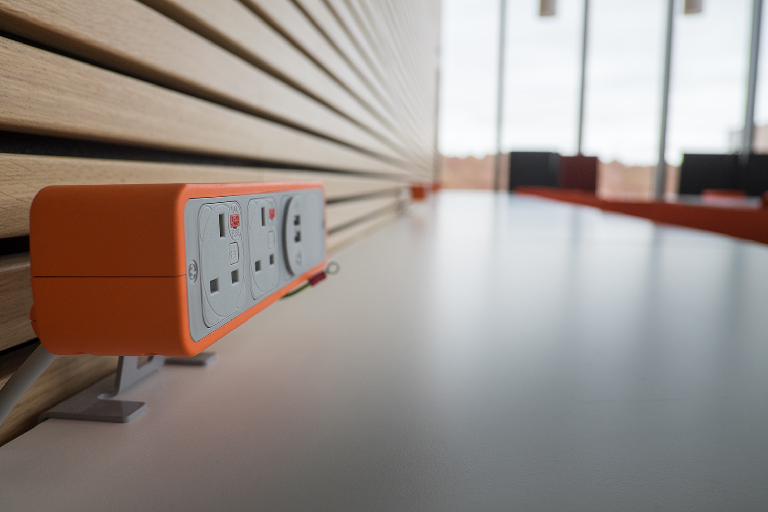 Farblich gekennzeichnete Steckdosen auf den Tischplatten