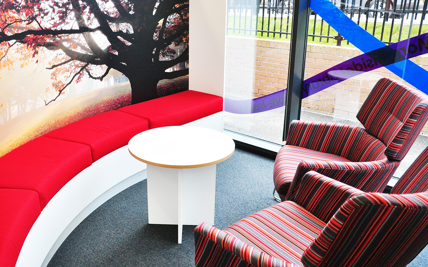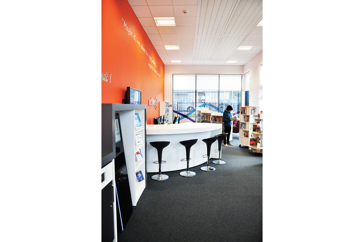 Das Hauptziel war, einen geeigneten Raum für digitales Lesen und Lernen zu schaffen mit einem begrenzten Buchbestand, aber starkem Focus auf E-Reader. So konzentrierte sich unsere Inneneinrichtung auf Lieferwege, die neue Technologien umfassen, einschließlich PC-Stationen und - zu unserem Stolz und unserer Freude - „The Gadget Bar“, einen Tisch, der sowohl für zufällig herein- kommende Nutzer als auch für Unterrichtseinheiten konfiguriert ist.