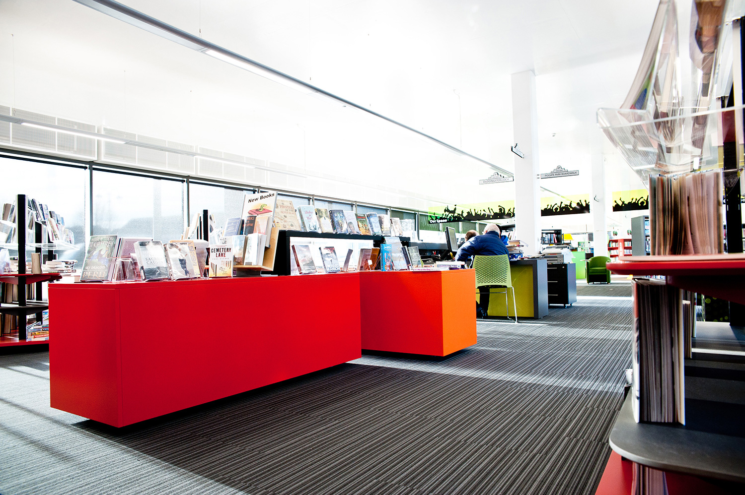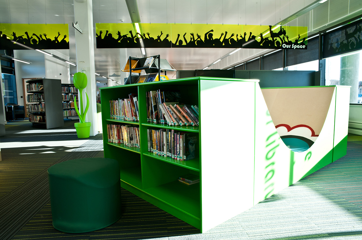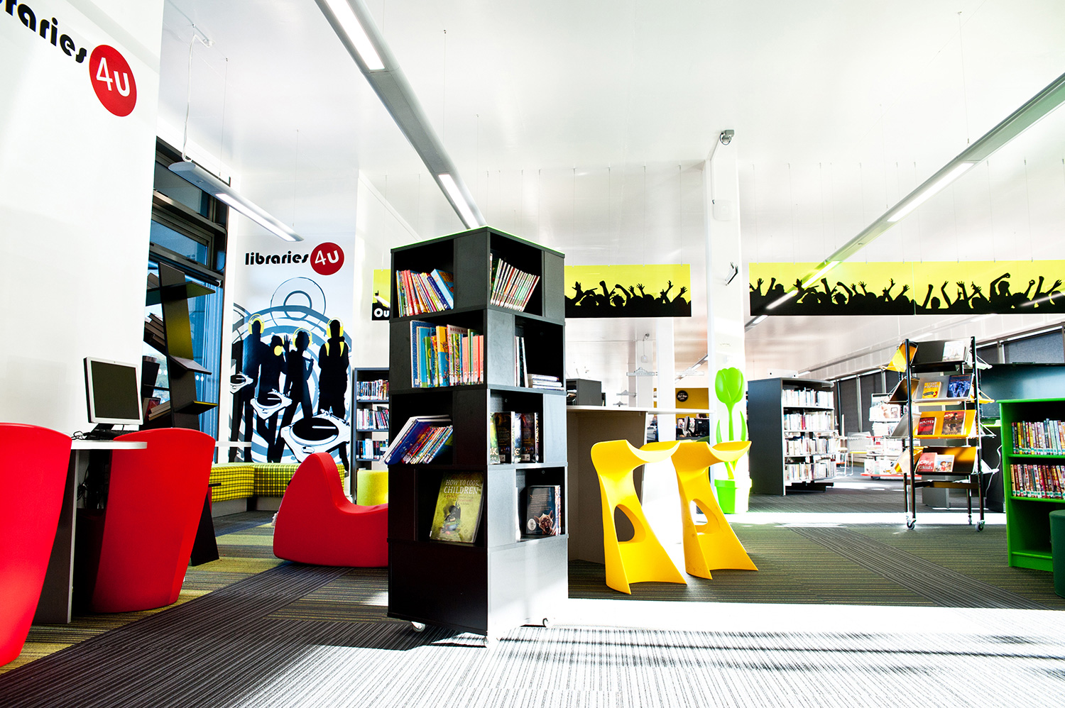 Die farbenfrohe Jugendzone, die 2/3 der Gesamtfläche einnimmt, zeigt, für wie wichtig die Bibliothek die zukünftigen Erwachsenen hält.