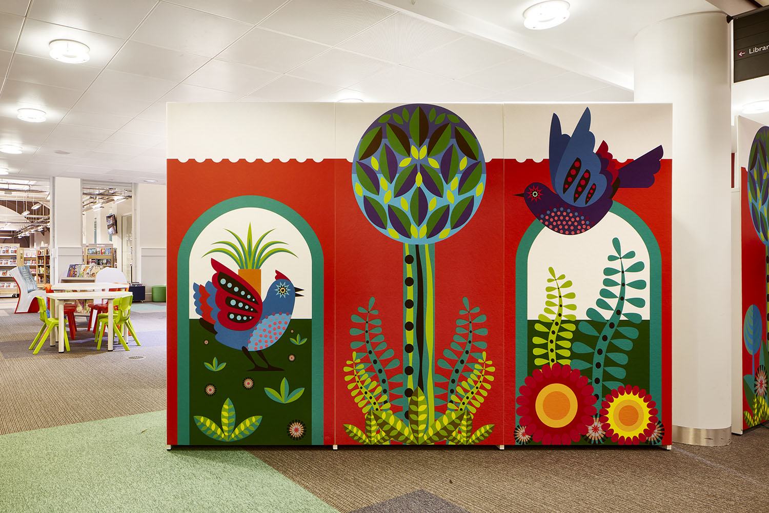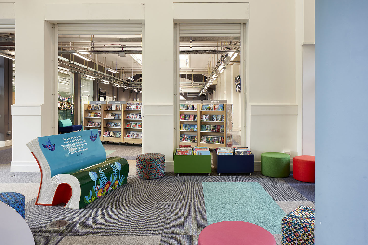 Da sich der neue Kinderbereich nun sehr zentral im ehemals offenen Atrium befindet, bestand eine zusätzliche Herausforderung darin, den neuen Bereich klar abzugrenzen und von anderen Bibliotheksfunktionen abzugrenzen. Daher wurden Akustikpaneele mit speziell entworfenen, lebendigen Mustern rund um das Gebiet installiert, die die notwendige Abgrenzung schaffen und gleichzeitig zur visuellen Besonderheit des Gebiets beitragen.