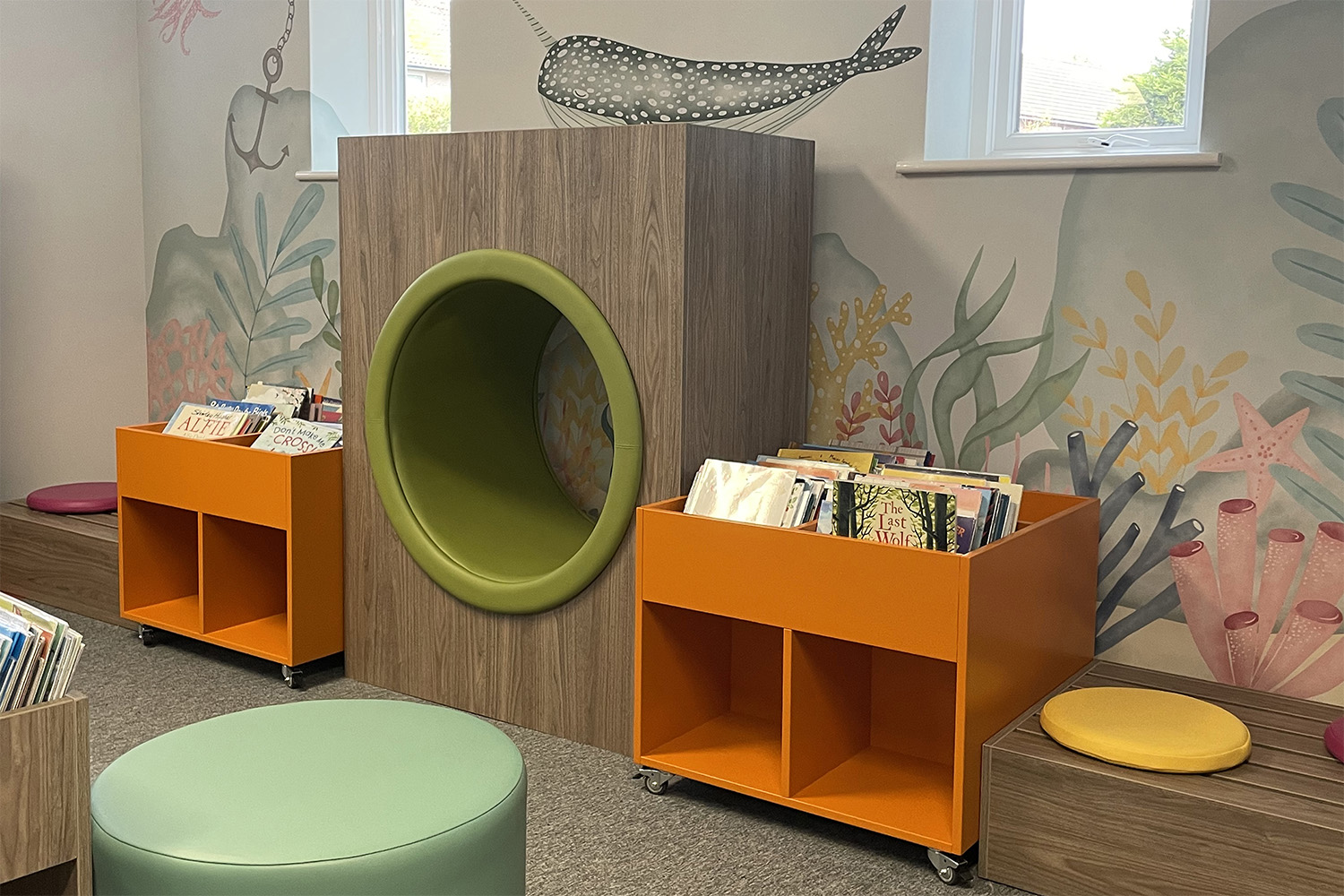 Die Kinderbibliothek ist auf spielerische und lebendige Weise eingerichtet. Auf einer individuell gestalteten Bühne können sich die Kinder amüsieren oder Geschichten anhören. Es gibt niedrige Bilderbuchtröge und Regale mit Ausstellungen in Kinderhöhe, die die Kinder zum Anschauen der Bücher anregen. Der Kinderbereich ist ein fantastischer, lustiger und attraktiver Raum, der durch Regale, Tröge und andere Möbel in kleine Abschnitte unterteilt ist, die Raum für Konzentration und Privatsphäre bieten.