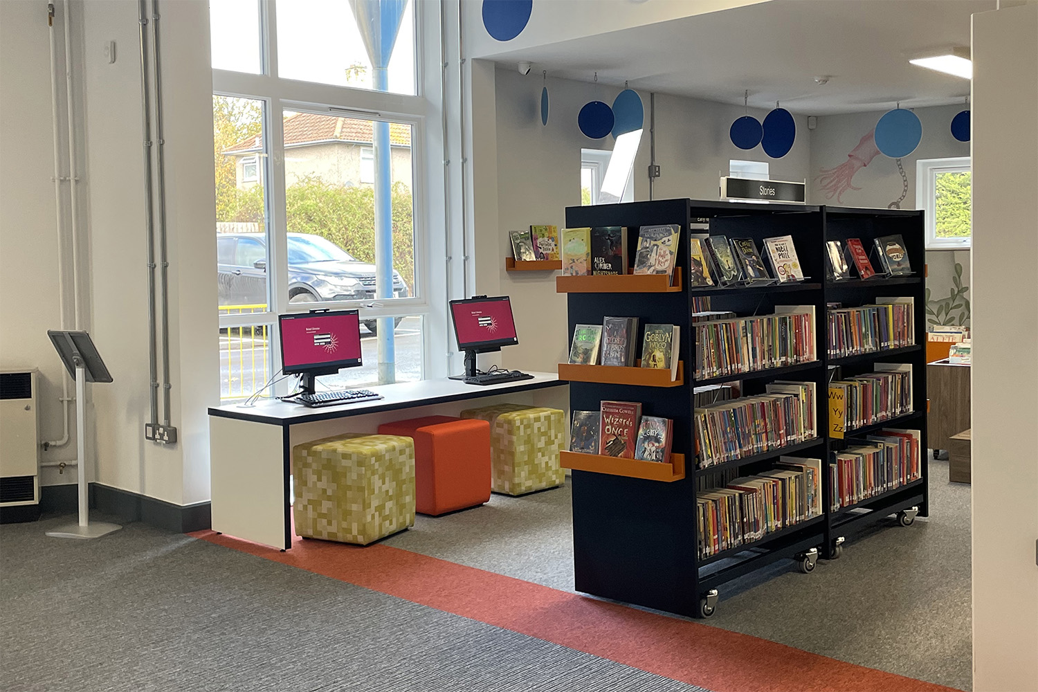 Am Eingang der Bibliothek werden die Besucher von modernen Ausstellungs- und Sitzbereichen mit eingebauten Bänken begrüßt. Es gibt Infopodien in verschiedenen Höhen für das Personal, und bei der Gestaltung wurde darauf geachtet, einen übersichtlichen Raum zu schaffen, in dem sich die Besucher nicht eingeengt fühlen. Zwischen den Regalreihen gibt es viel Platz und Bewegungsfreiheit, und keine Sackgassen in den offenen Bereichen. Am Eingang ist deutlich ausgeschildert, wo sich die Kinderbibliothek und das Personal befinden. Die neuesten Bücher sind in den Regalen an den Stirnseiten der Bücherregale ausgestellt. Wir haben die Bibliothek noch komfortabler gestaltet, indem wir einen Bereich mit Cocoon-Lesenesten eingerichtet haben, in denen man einen ruhigen Augenblick genießen kann.