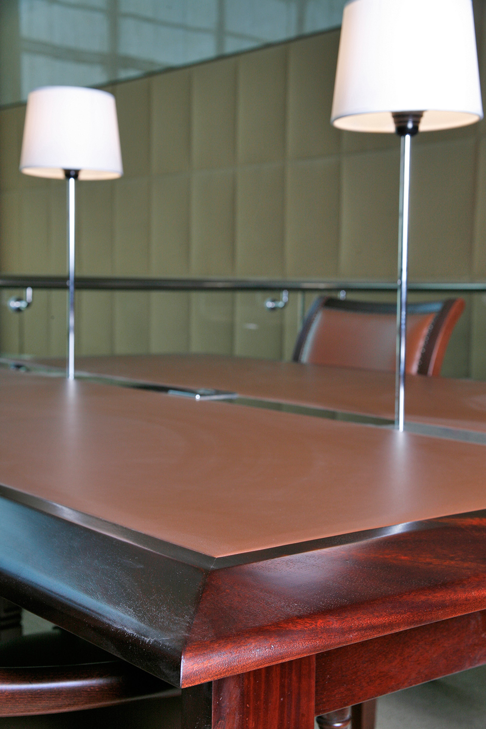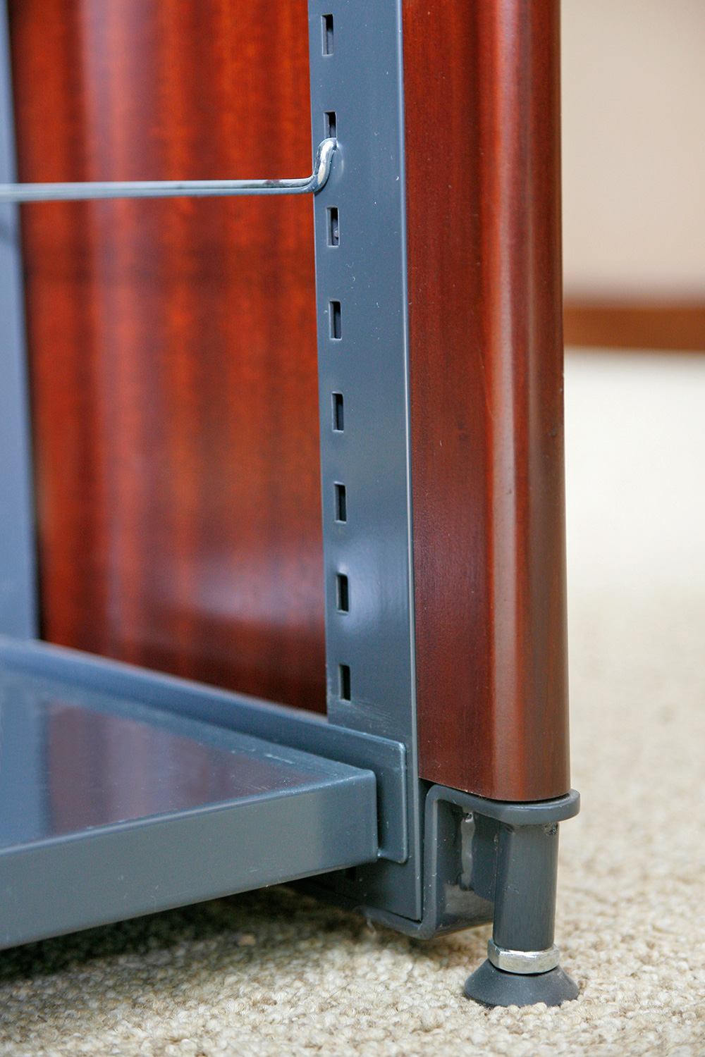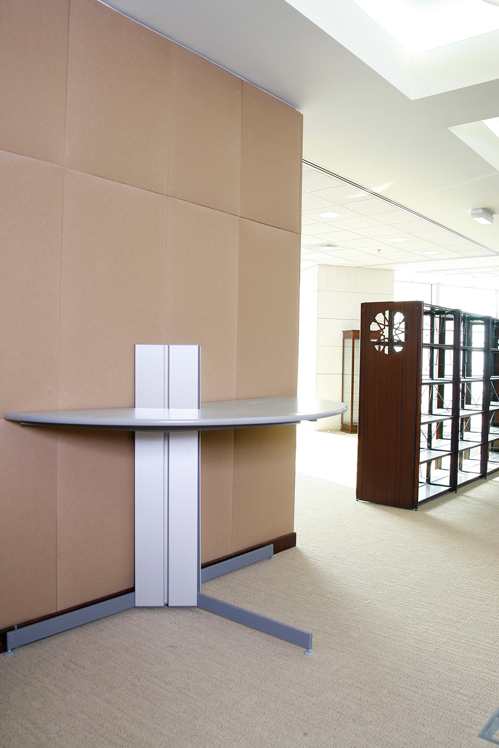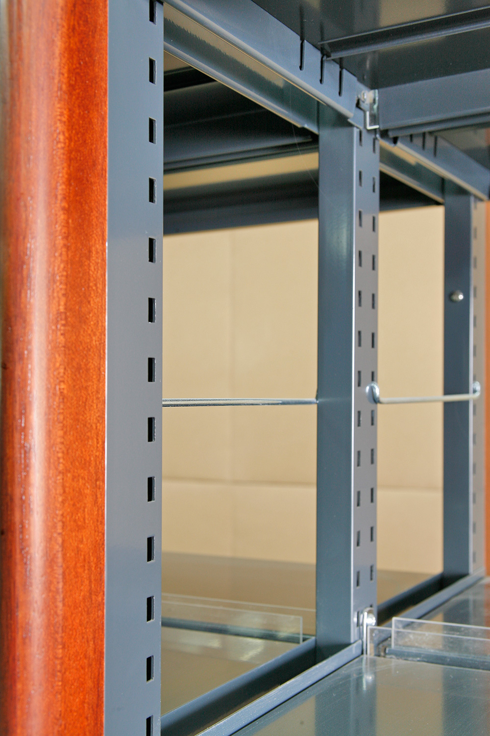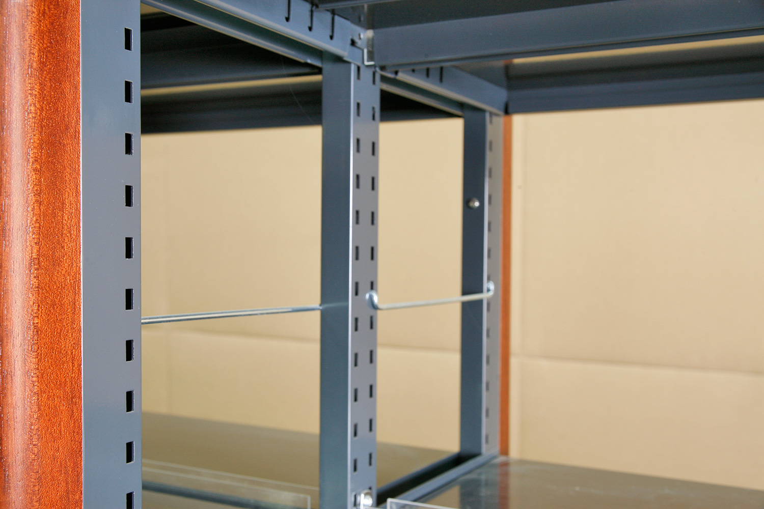 Die Bibliotheksbestände sind im Gothia Metall-Regalsystem mit gebeizten Holzfronten und Seitenver-kleidungen untergebracht.
