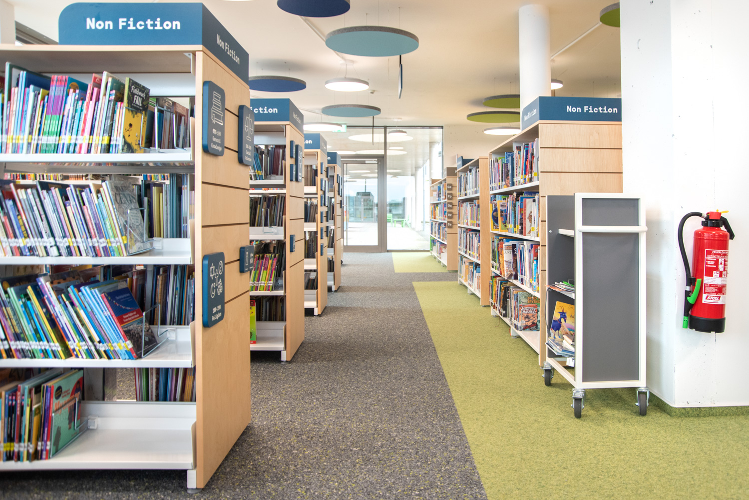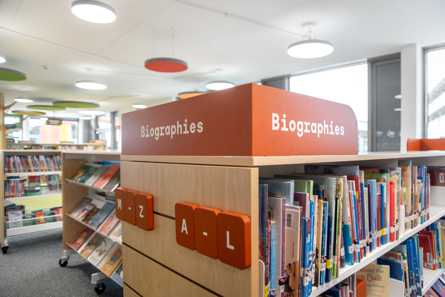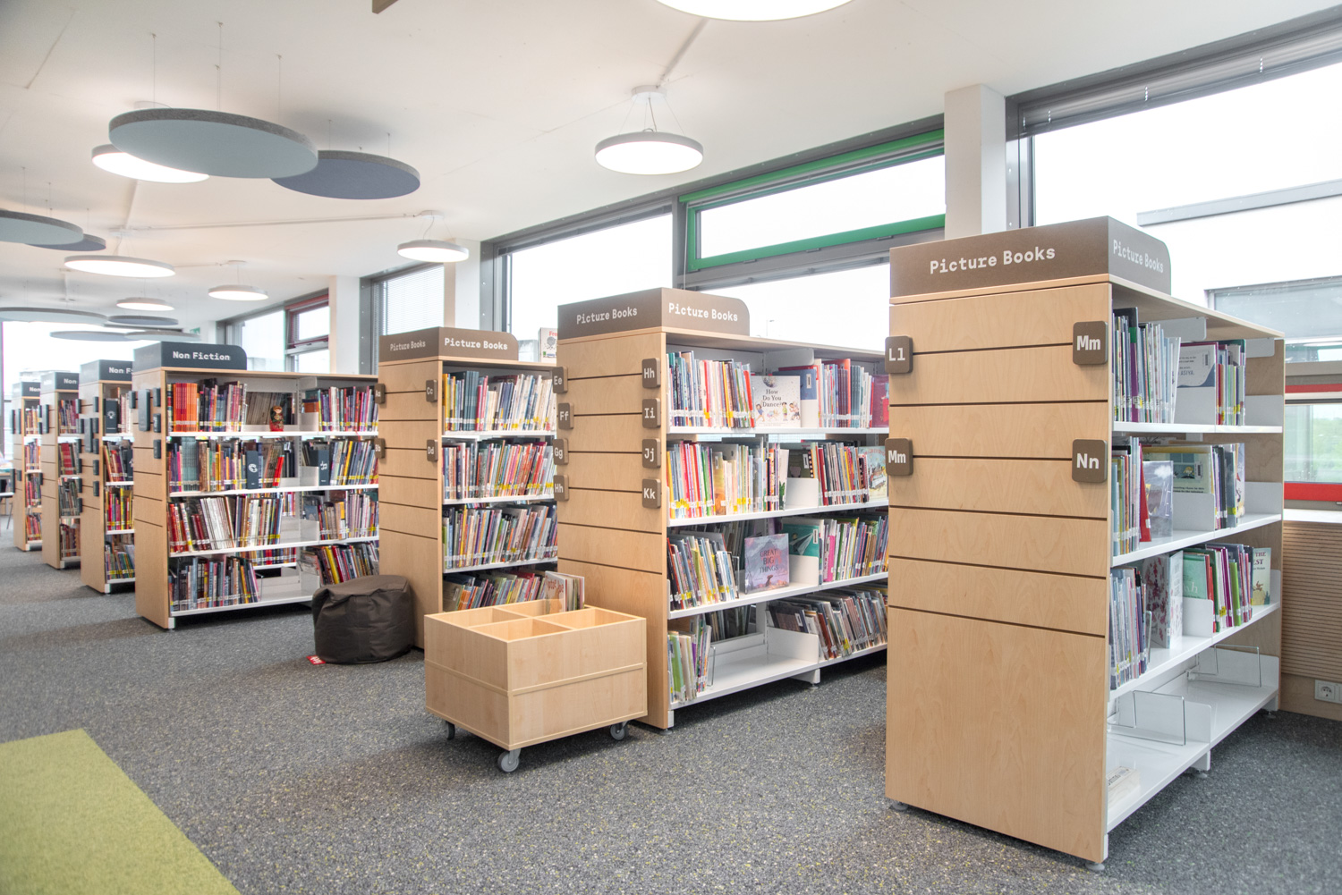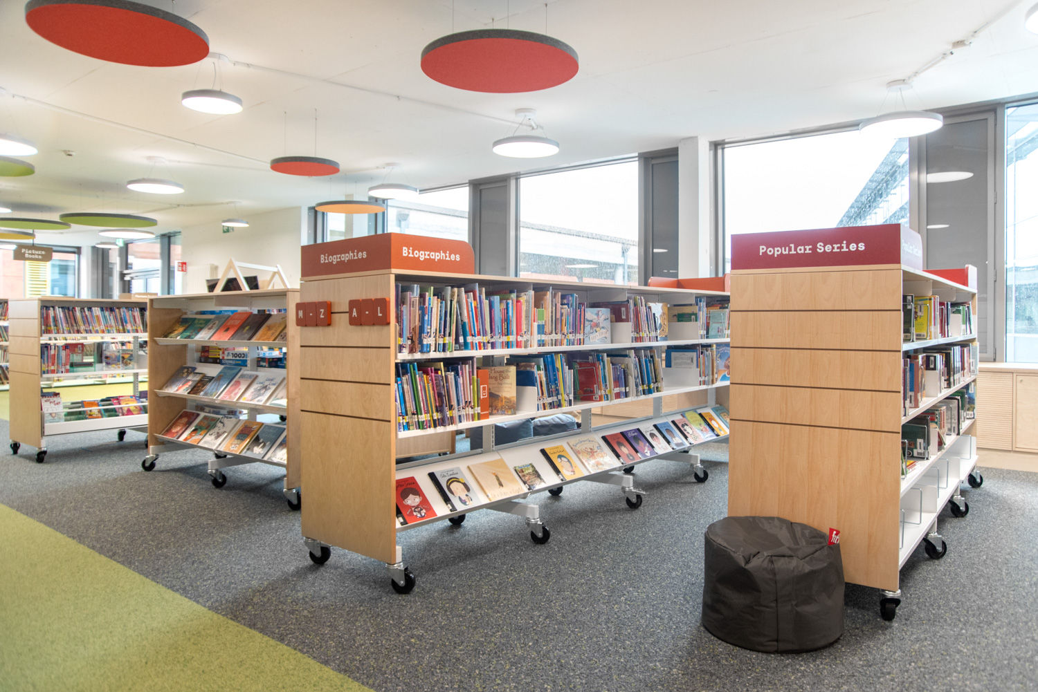 Die Display-Stirnseiten der Regale ermöglichen eine attraktive Beschilderung, die auf die Bedürfnisse der Besucher zugeschnitten ist. In dieser sorgfältig gestalteten Bibliothek werden Kinder auf ihrem Weg zu informationskundigen Weltbürgern unterstützt.