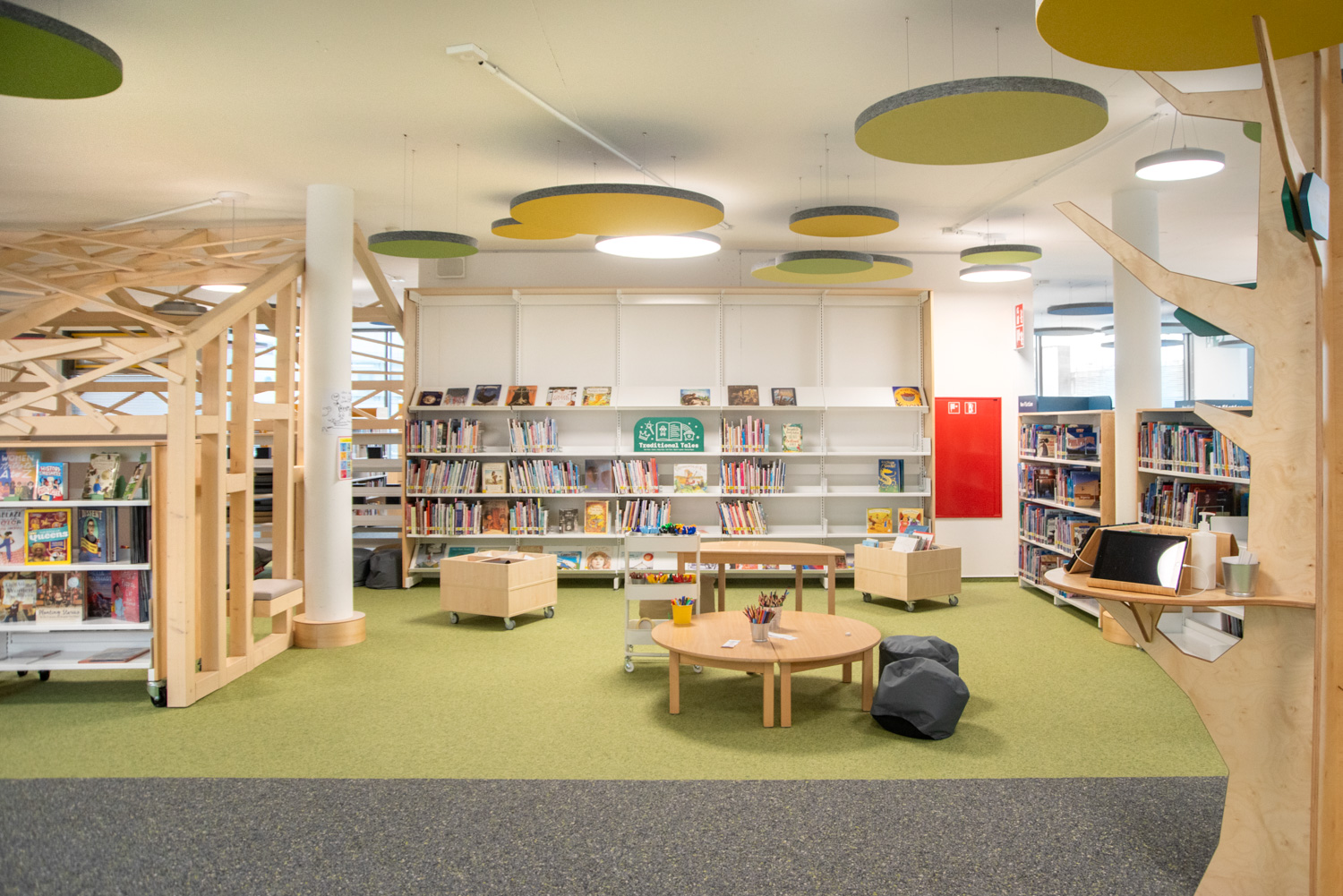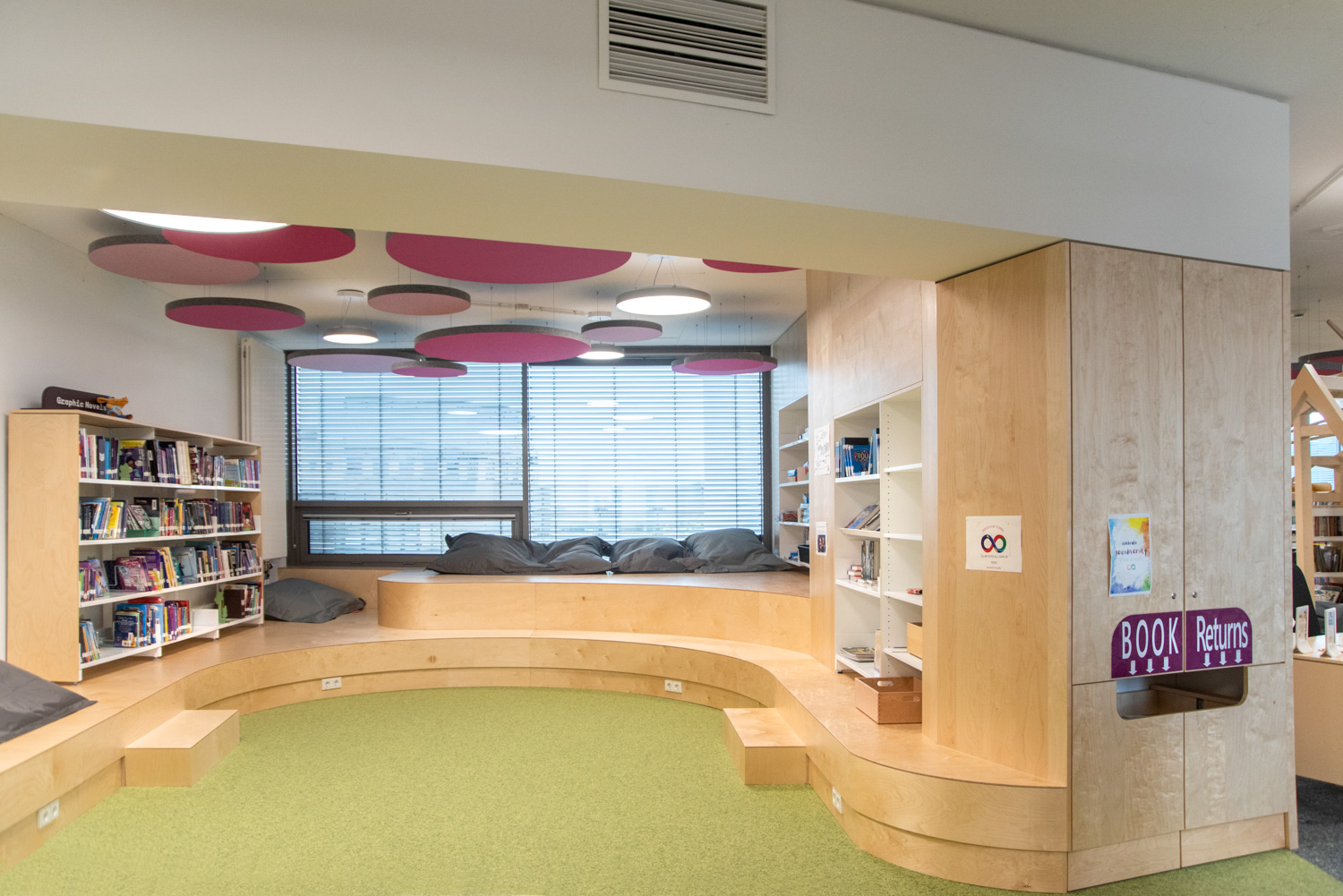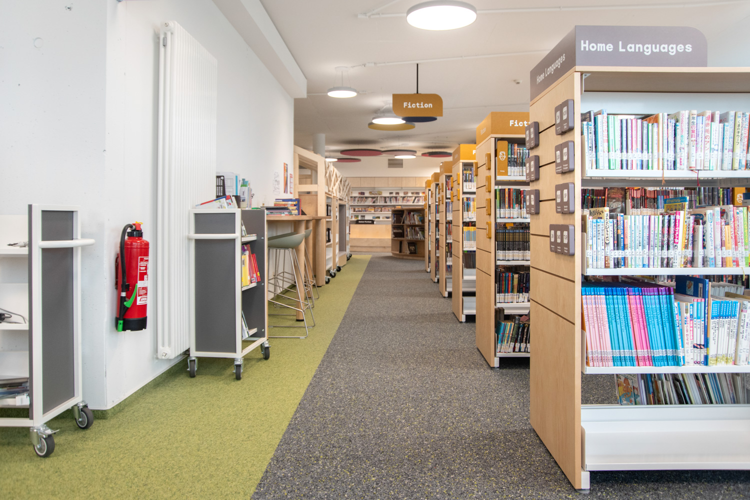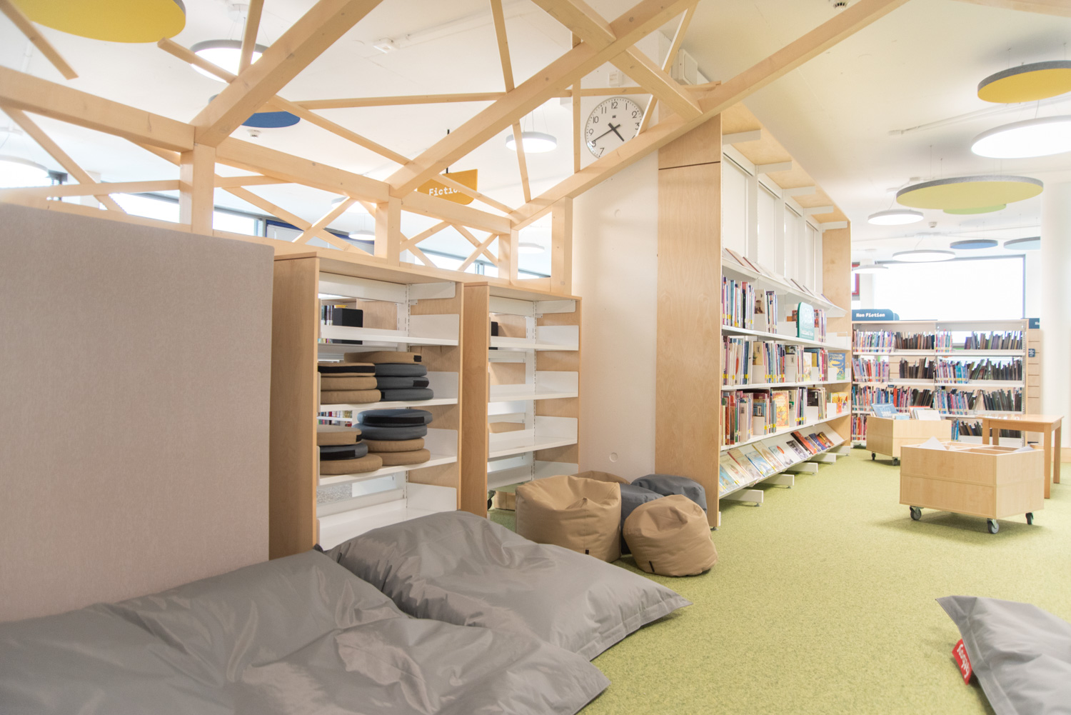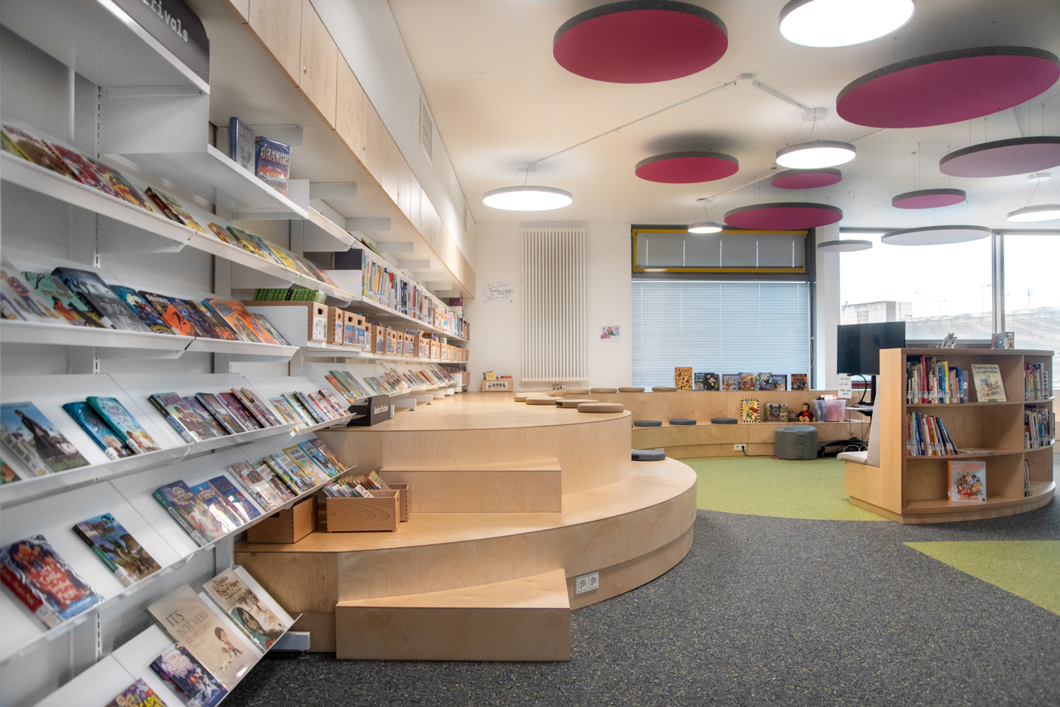 Die Display-Stirnseiten der Regale ermöglichen eine attraktive Beschilderung, die auf die Bedürfnisse der Besucher zugeschnitten ist. In dieser sorgfältig gestalteten Bibliothek werden Kinder auf ihrem Weg zu informationskundigen Weltbürgern unterstützt.