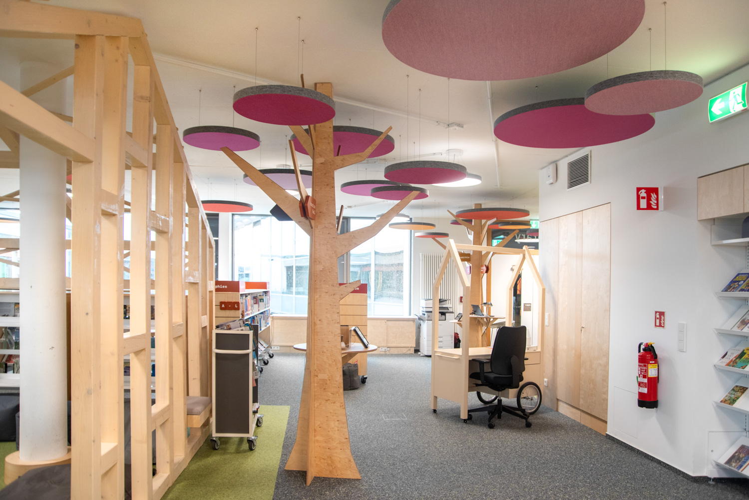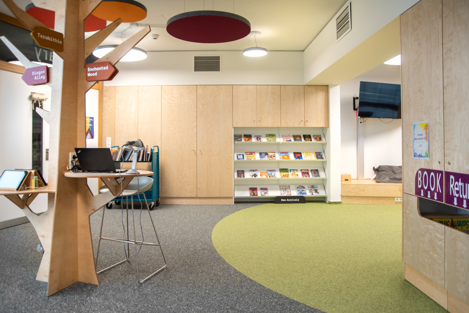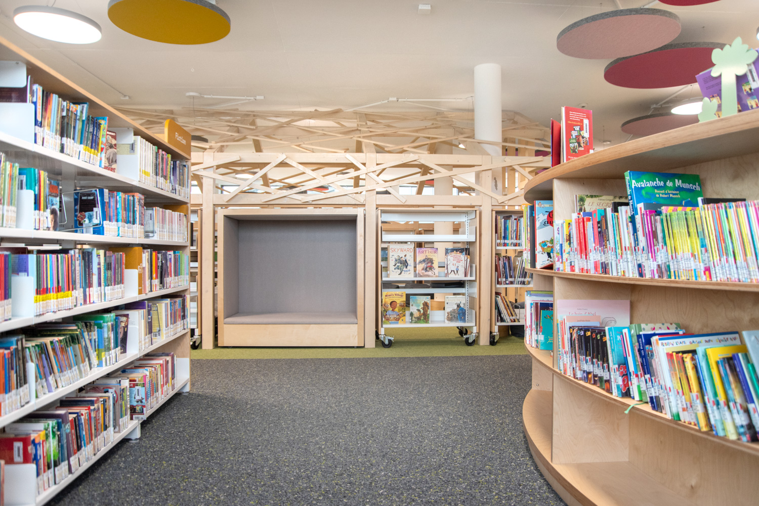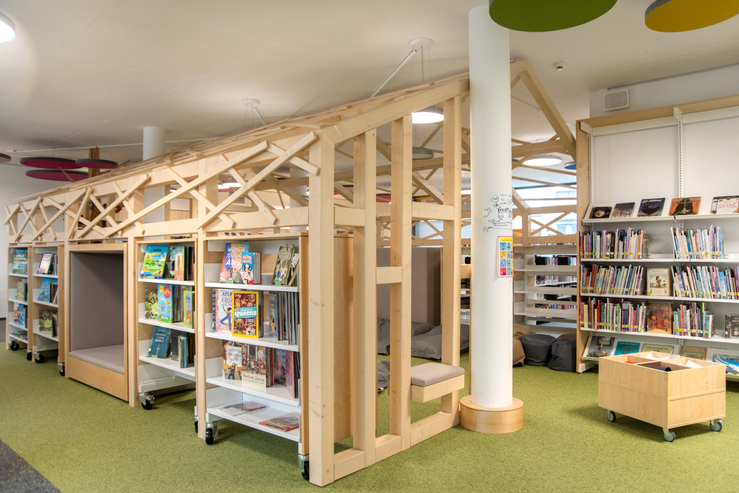 Die Display-Stirnseiten der Regale ermöglichen eine attraktive Beschilderung, die auf die Bedürfnisse der Besucher zugeschnitten ist. In dieser sorgfältig gestalteten Bibliothek werden Kinder auf ihrem Weg zu informationskundigen Weltbürgern unterstützt.