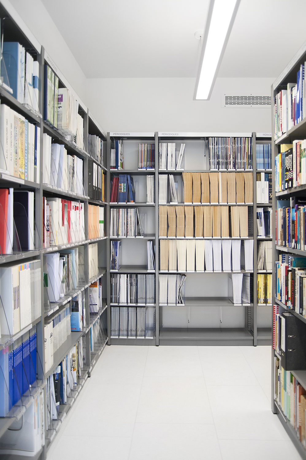 Das Metall-Regalsystem in neutralen Farben soll visuell einen modernen Eindruck erzeugen, da die Aufmerksamkeit mehr den vorhandenen Dokumenten gilt als dem Mobiliar.